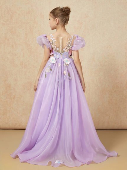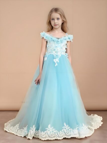 Floral Applique Tiered Tulle Long Flower Girl Dress