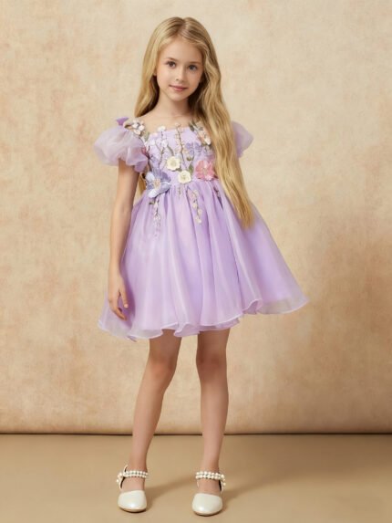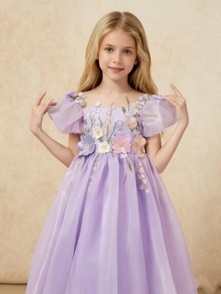 Floral Appliqued Illusion Neck Cap Sleeve Girls Dresses