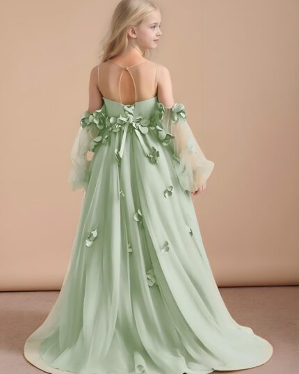 Floral Applique Tiered Tulle Long Flower Girl Dress