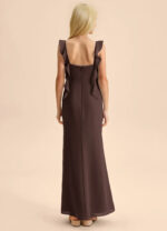 The Jessamine is a stunning chiffon style with a sweetheart neckline, ruffled shoulder straps, self-tie lace-up back, pleated details throughout the body, and a floor-length A-line skirt with a leg slit.