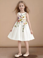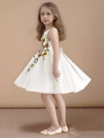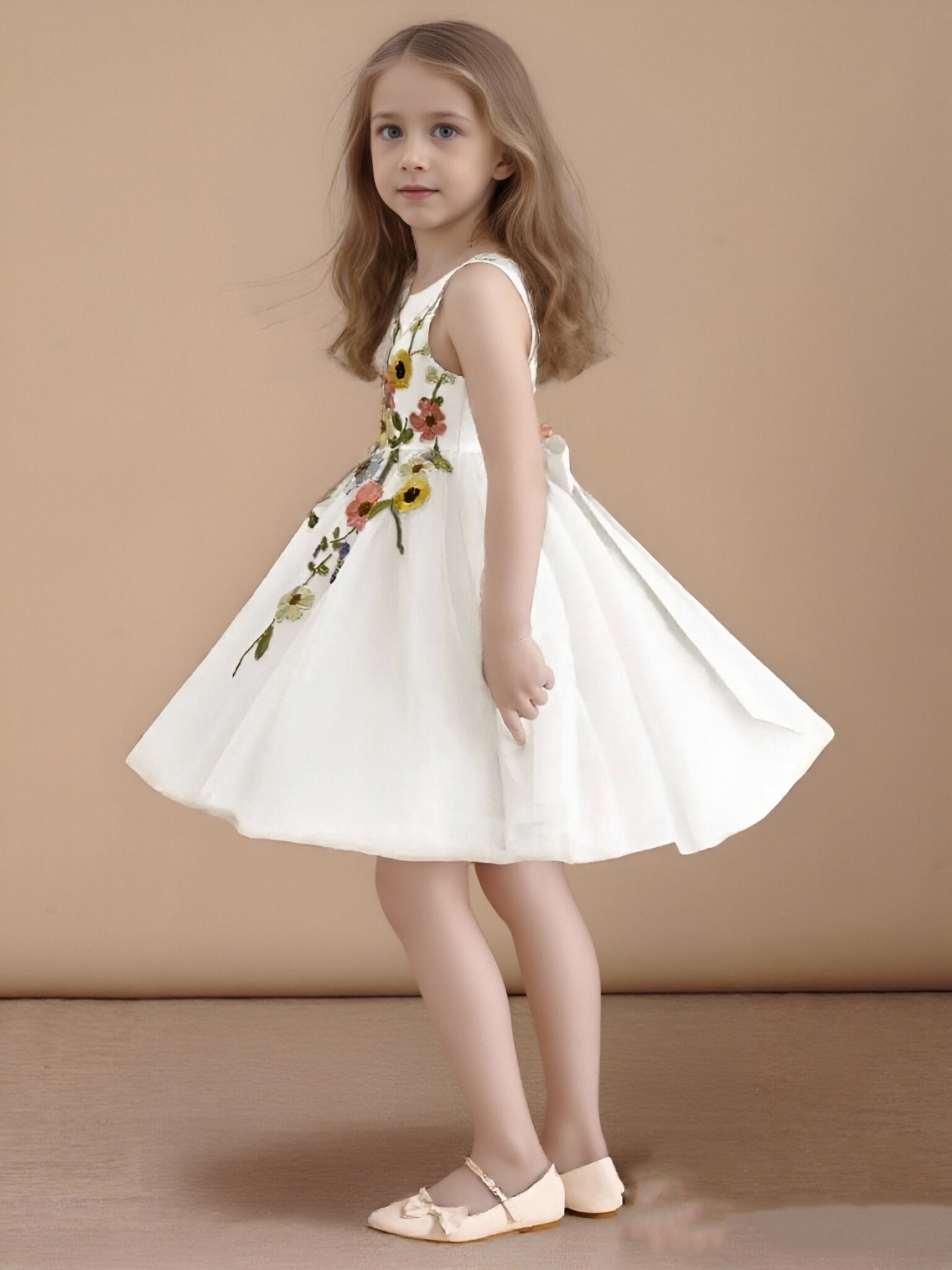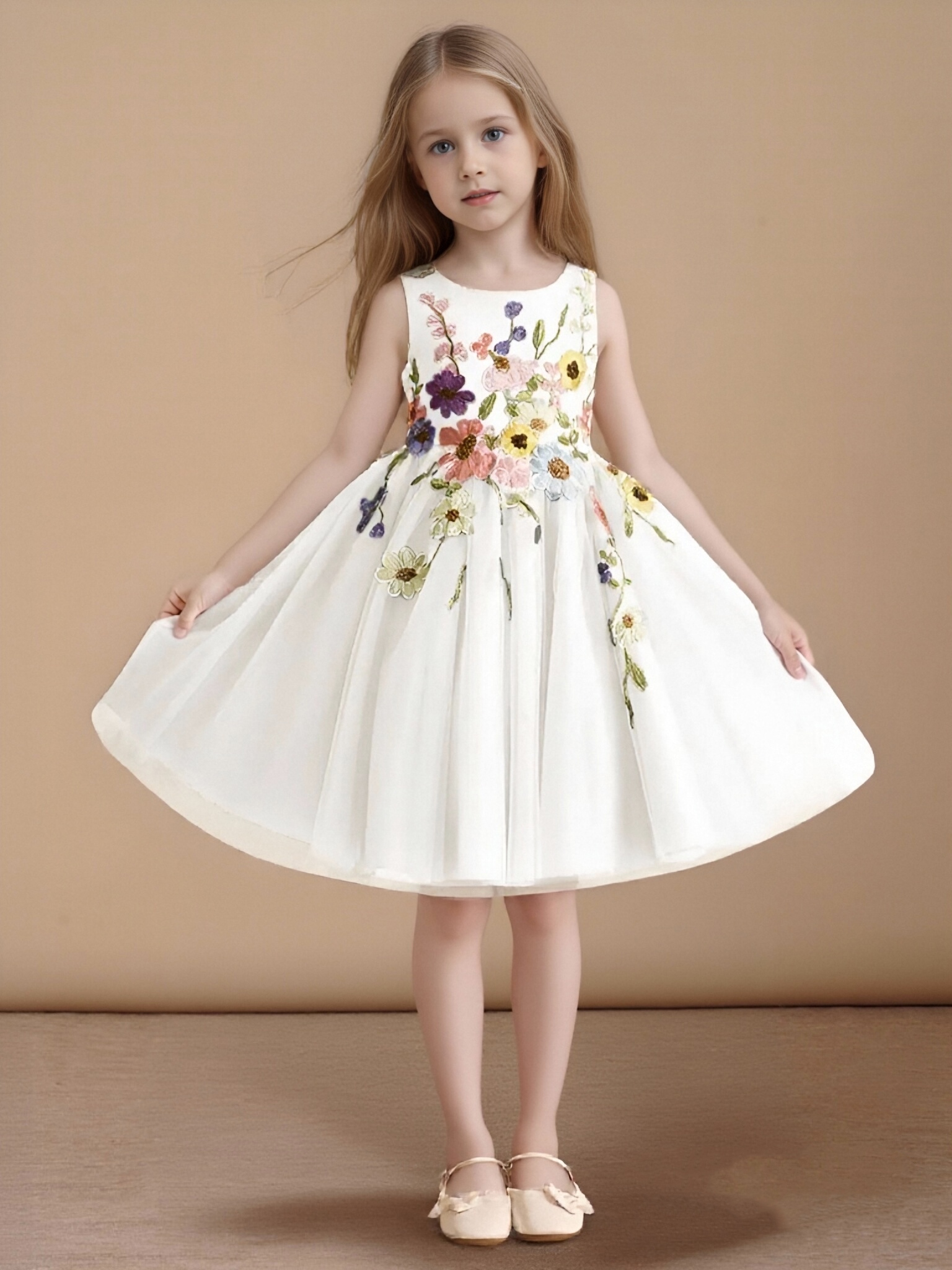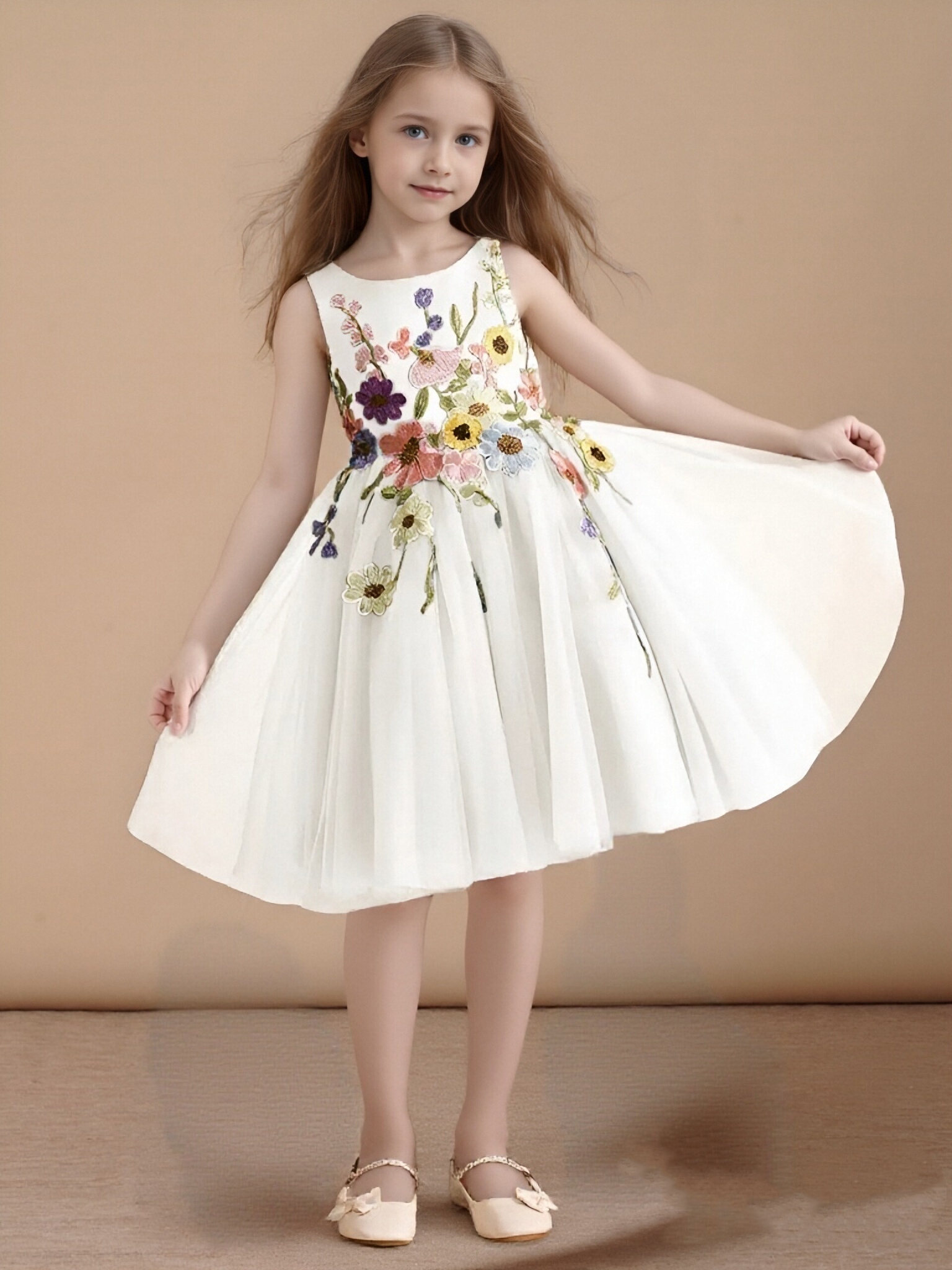 - Adorned with colorful 3D flowers and a flattering pleated A-line skirt, the Prima dress is a stunning mix of soft tulle and matte satin, perfect for twirling and celebrating in style. The subtle scoop neckline and charming bow at the back complete this beautiful design.