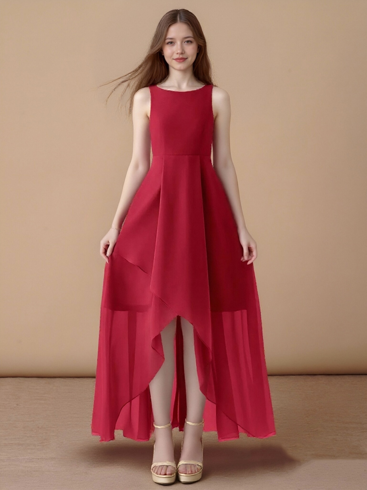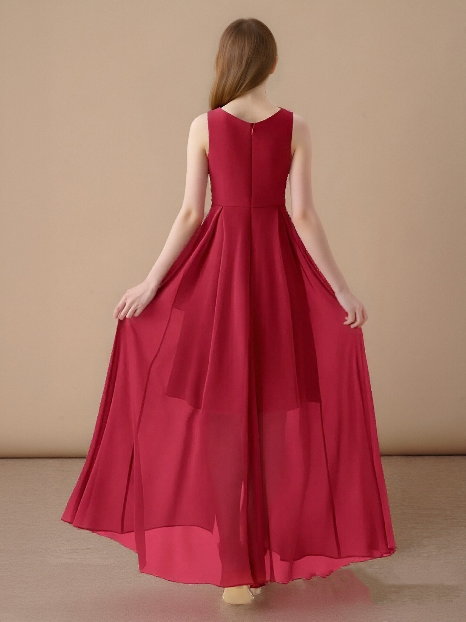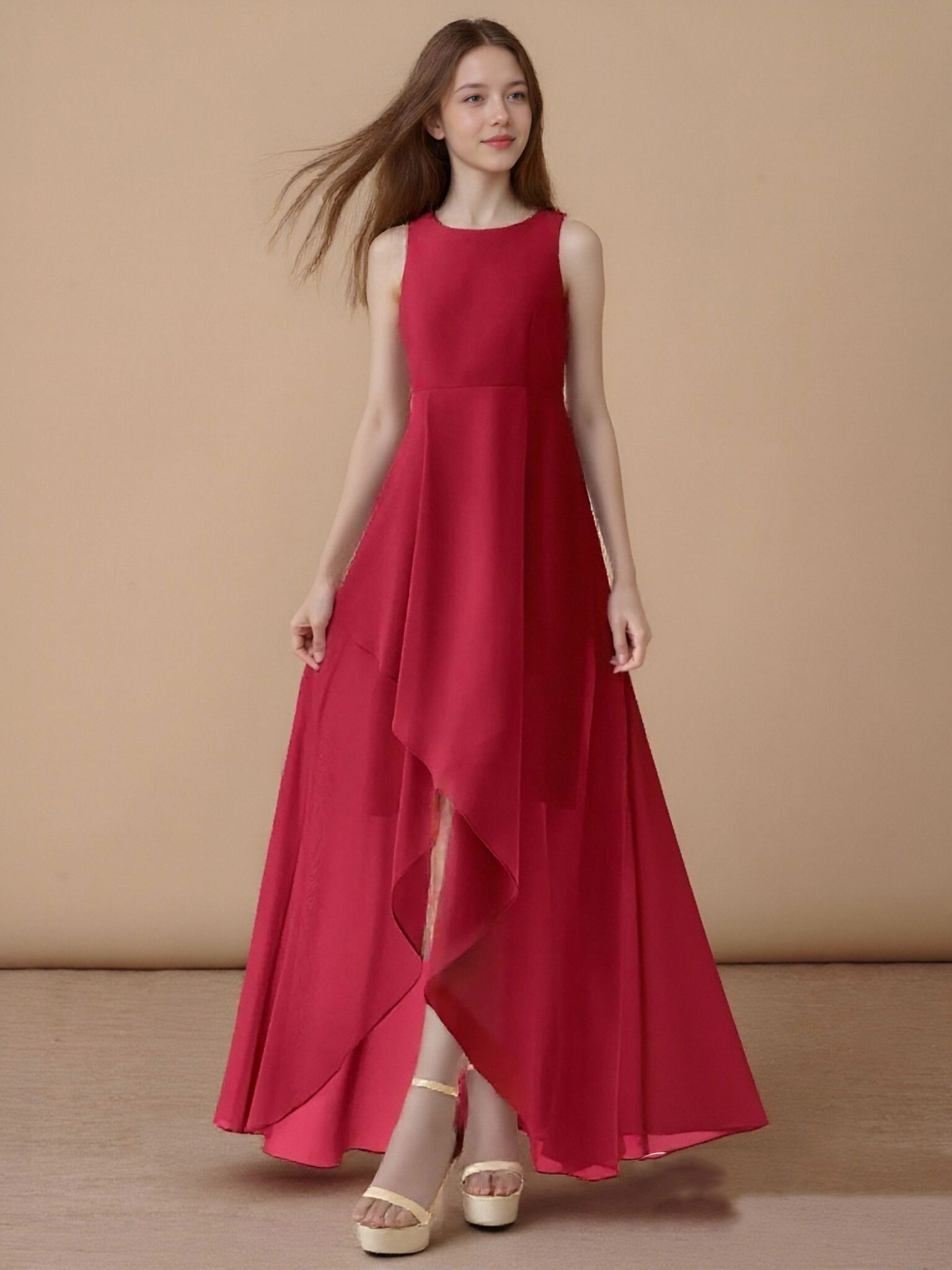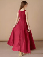 - Chic and graceful, the Lizette junior bridesmaid dress stuns with its sleeveless silhouette, flowing chiffon fabric, and a unique asymmetrical skirt accented by a delicate cascading ruffle.