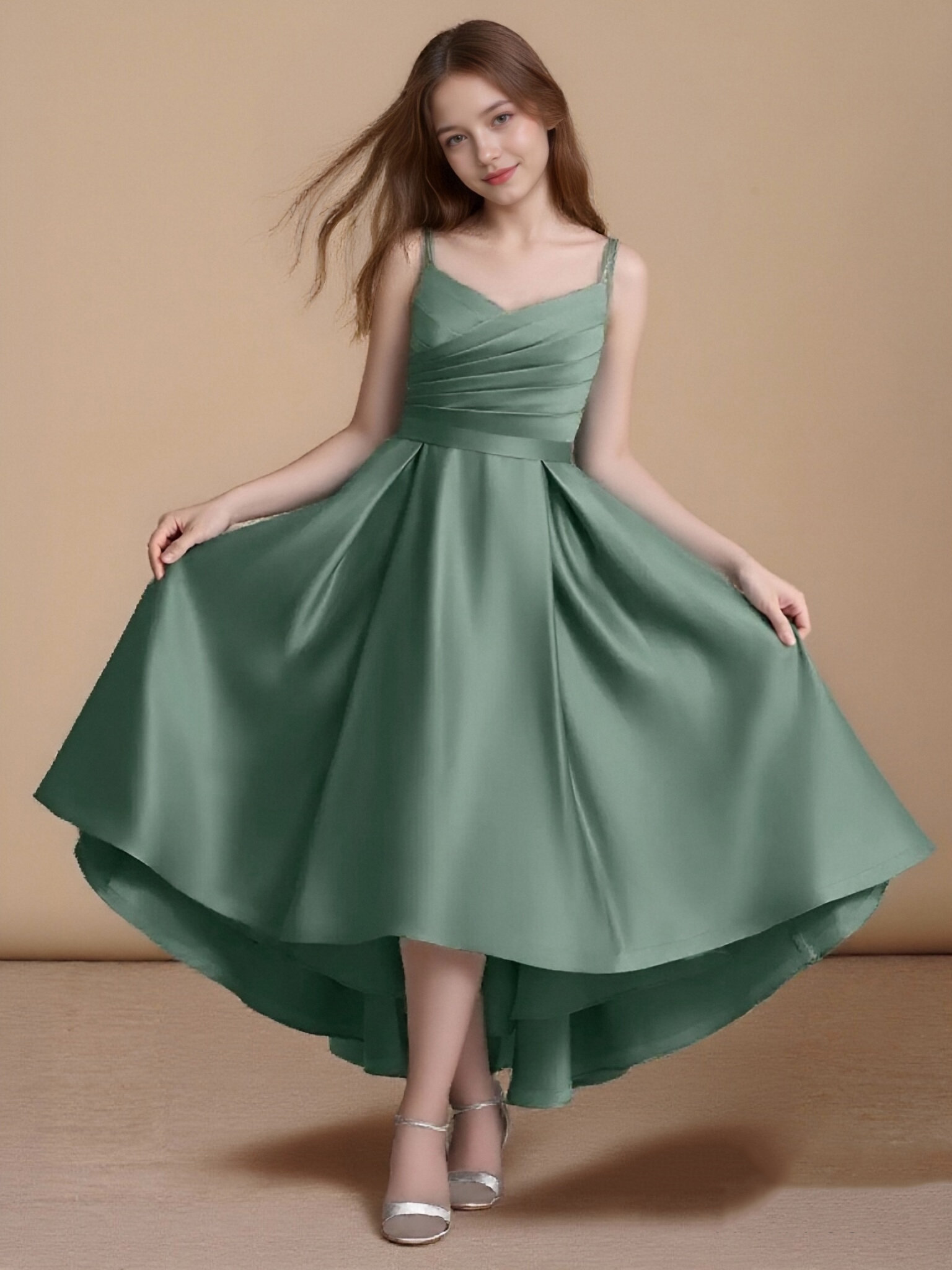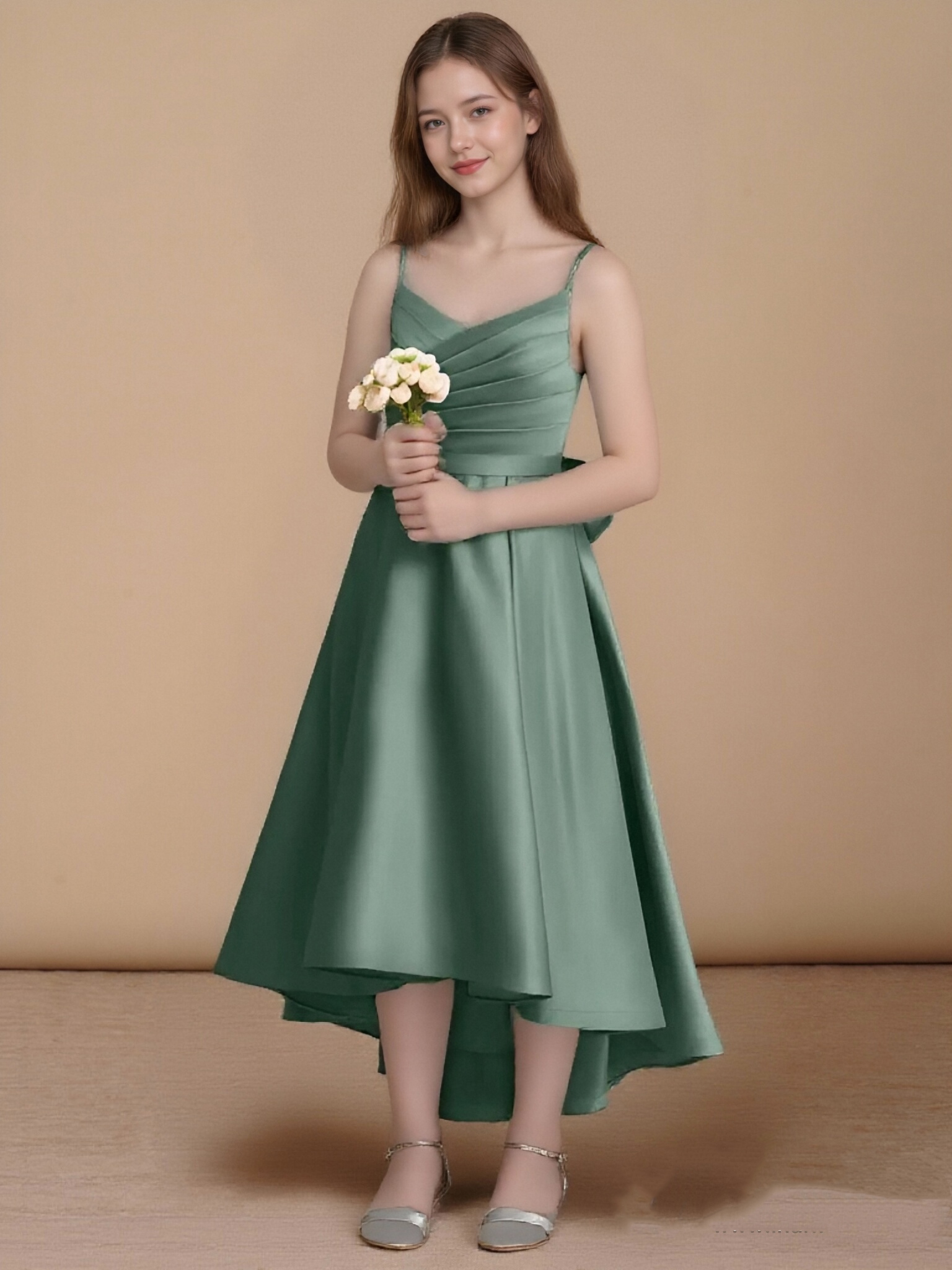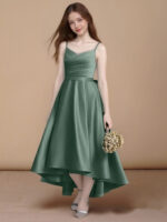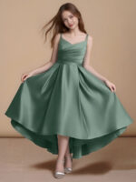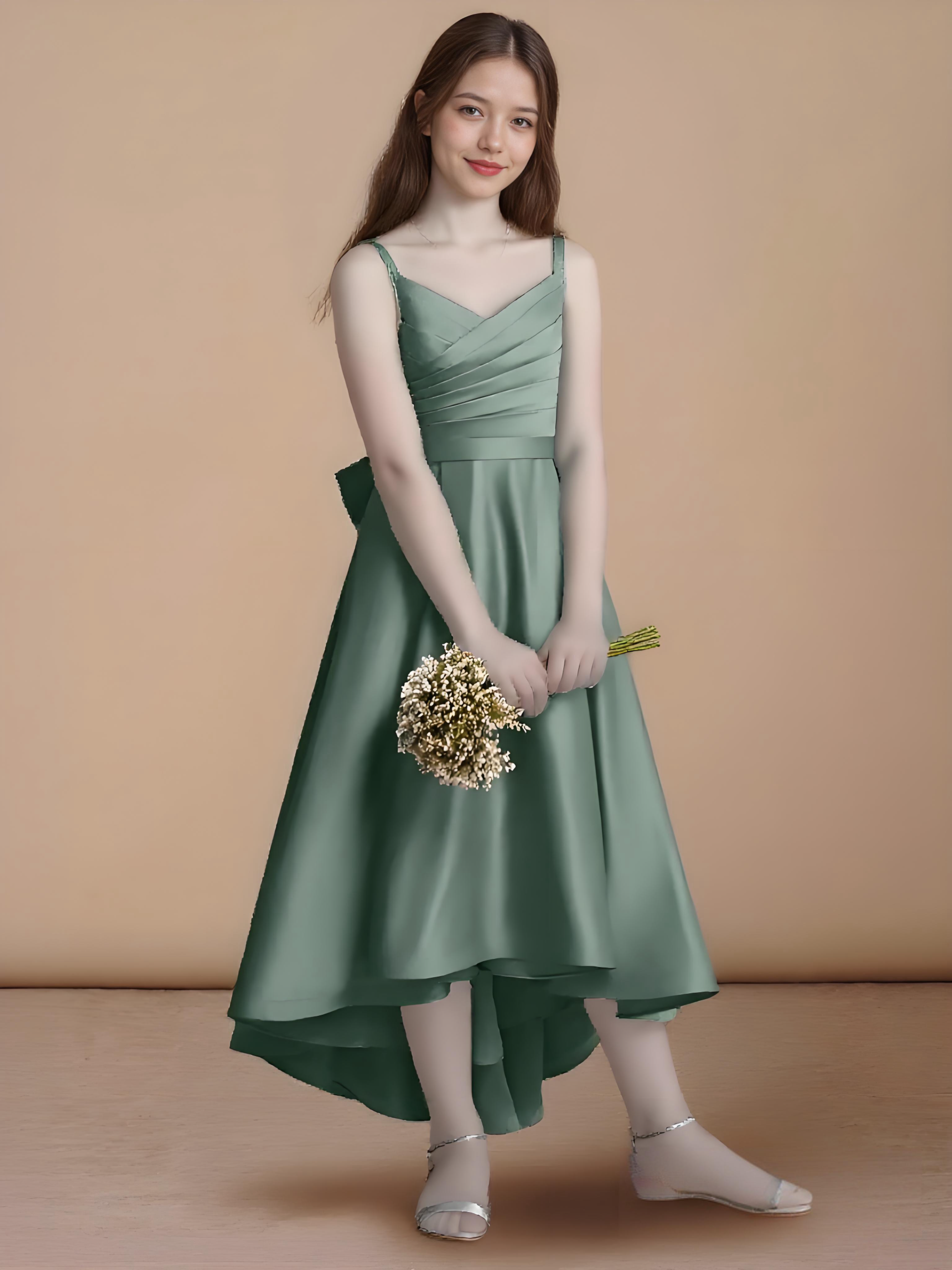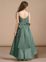 - The Sweets flower girl dress shines with its asymmetrical A-line silhouette in matte satin, featuring a sleeveless V-neckline with delicate spaghetti straps. Crossing bodice pleats, a double-layered statement bow at the back, and a box-pleated skirt create a look that’s both modern and delightfully elegant.