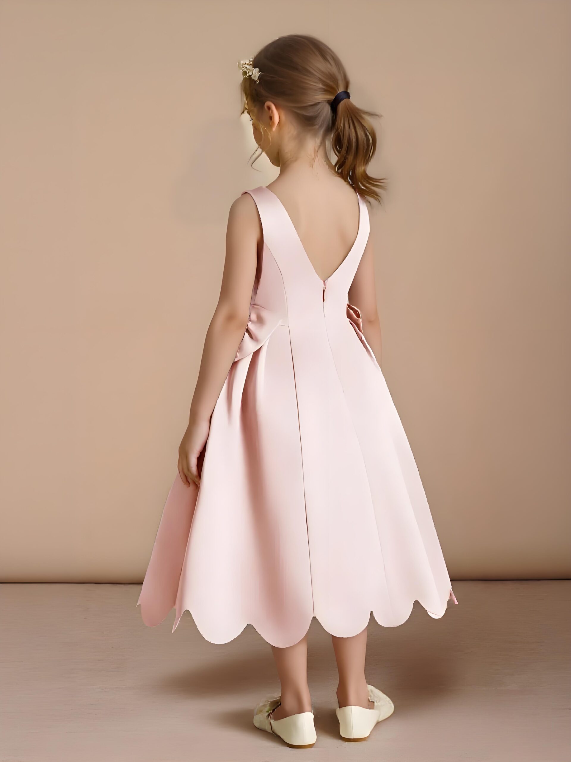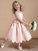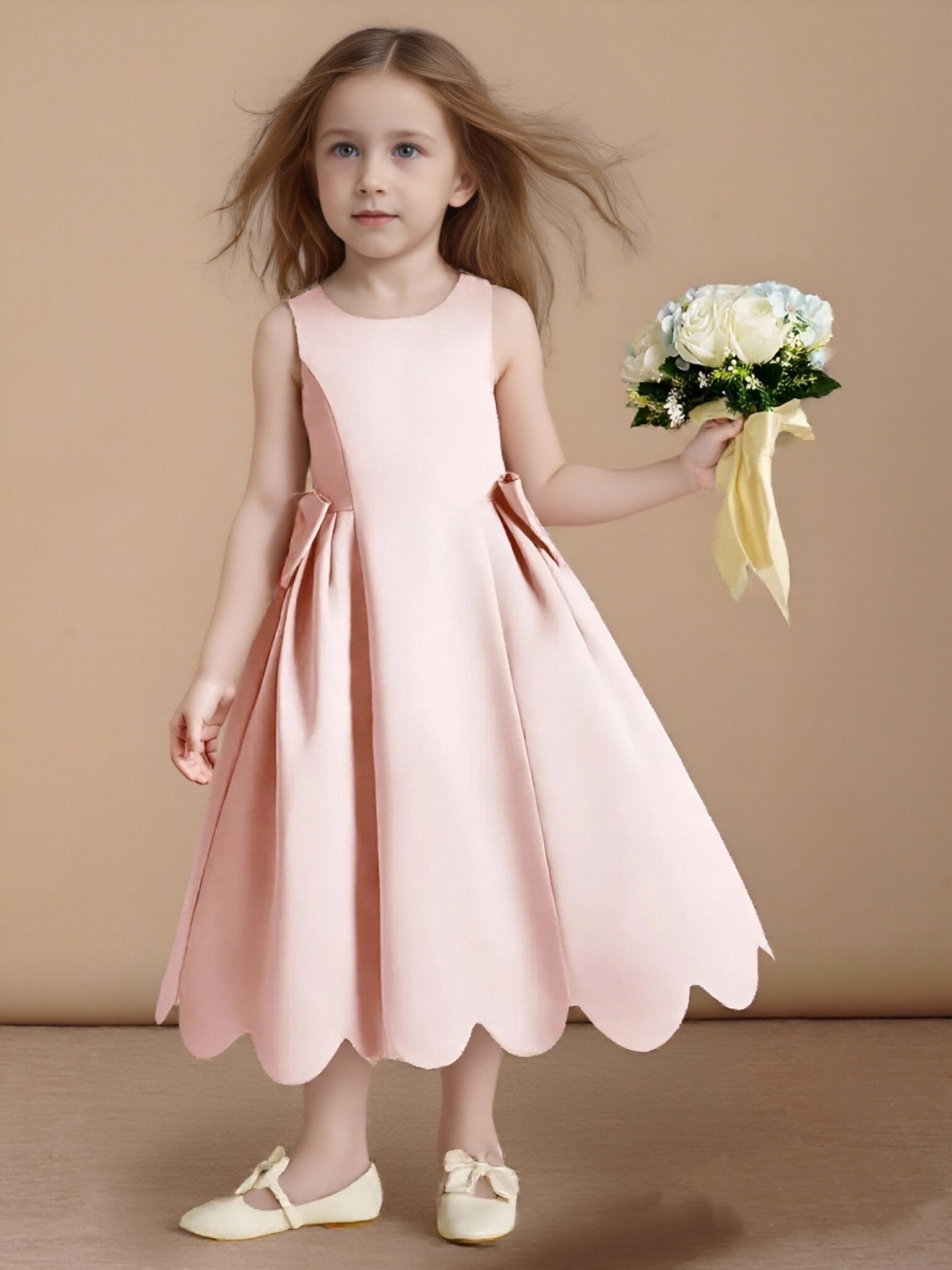 - Delicate yet full of personality, this sleeveless satin dress twirls with a full pleated skirt, scalloped hem, and oversized bows at the waist—an enchanting look for a little girl’s special walk down the aisle.