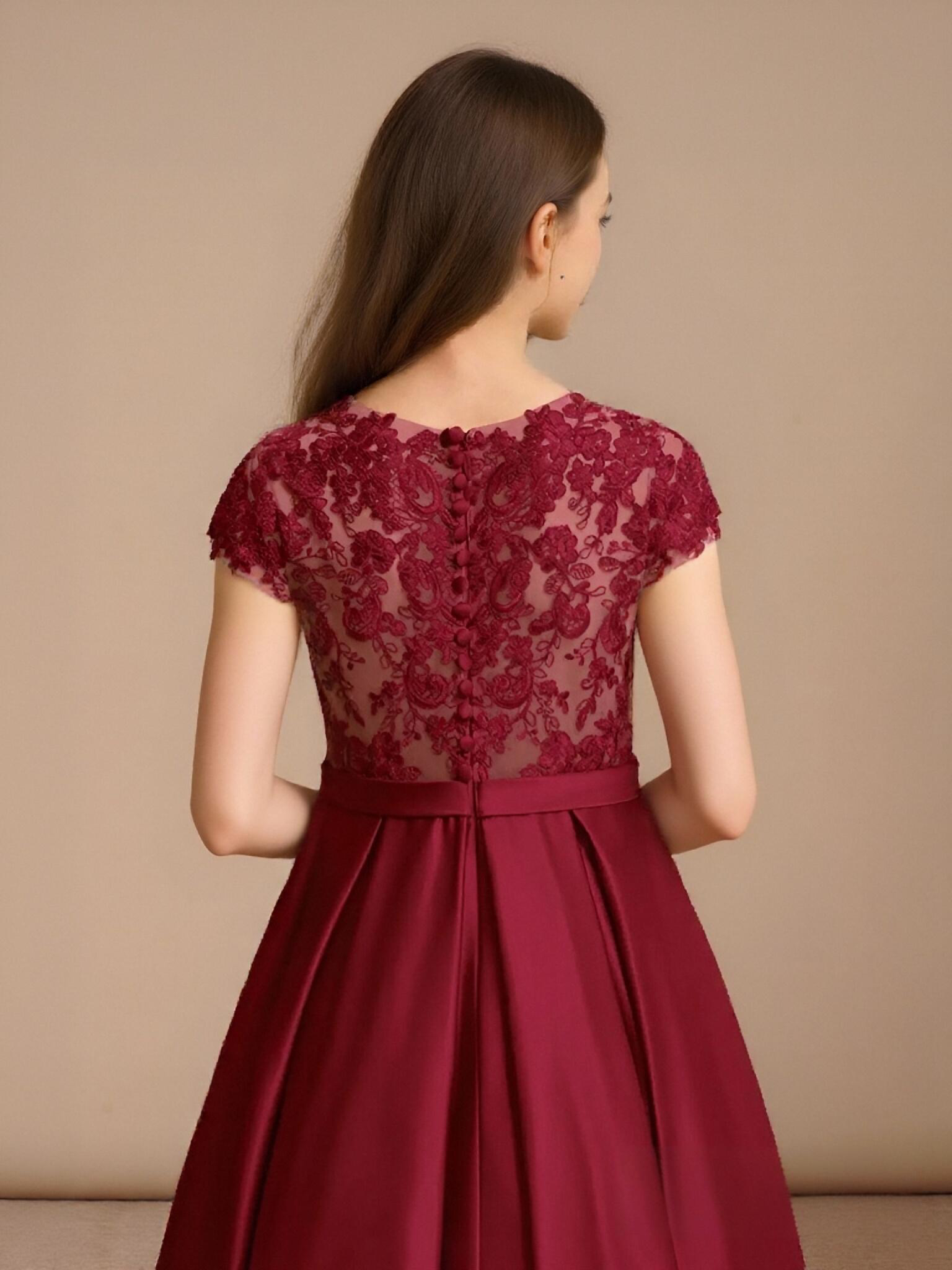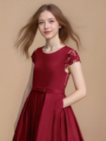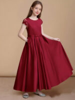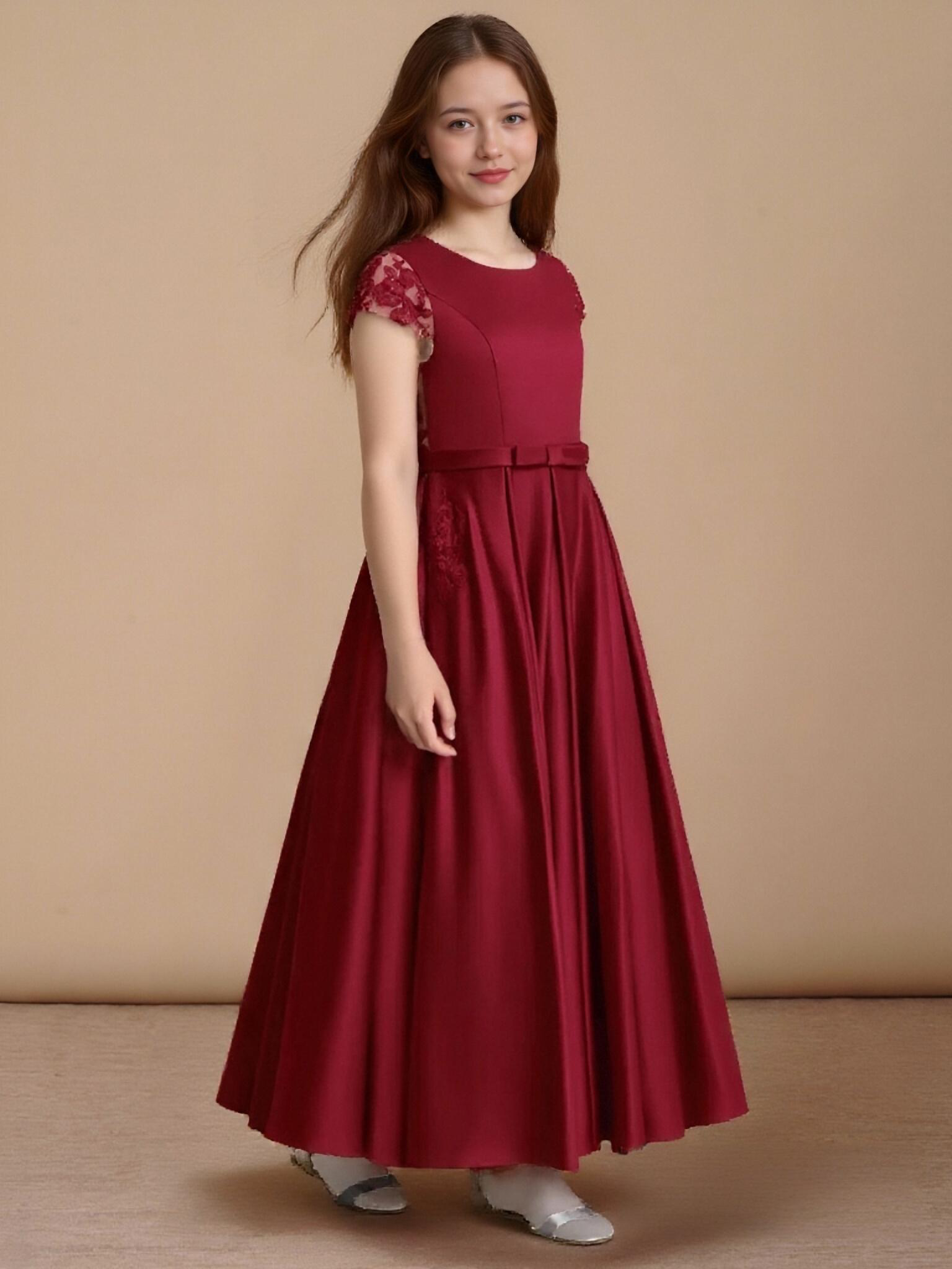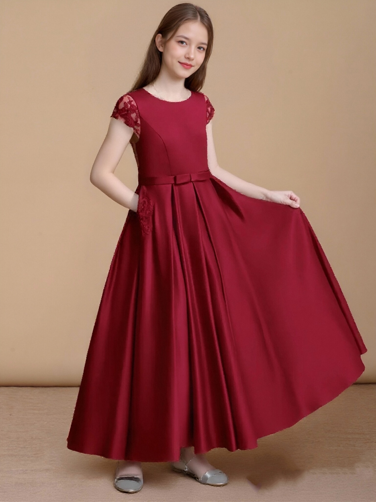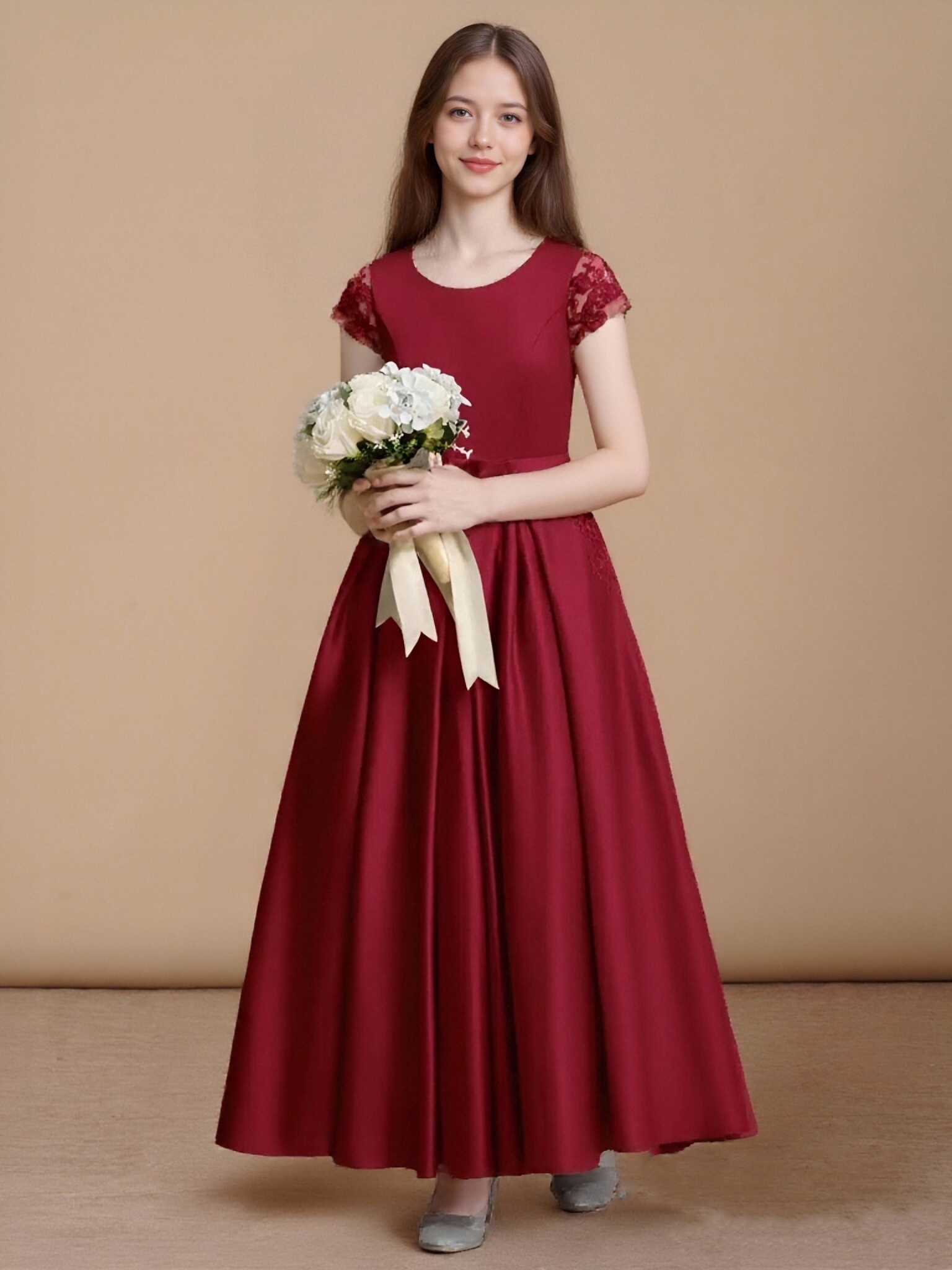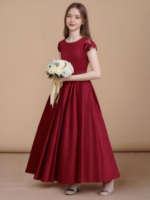 - The Bunny flower girl dress exudes classic charm with its ankle-length ball gown silhouette in matte satin. Featuring a scoop neckline, short lace sleeves, and an illusion lace back with button detailing, this design is finished with a dainty satin bow belt and structured box-pleated skirt for a polished, timeless look.