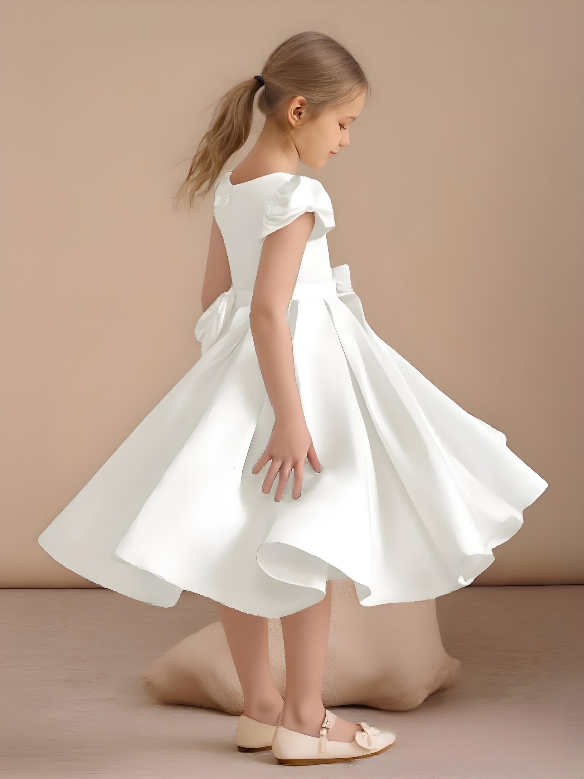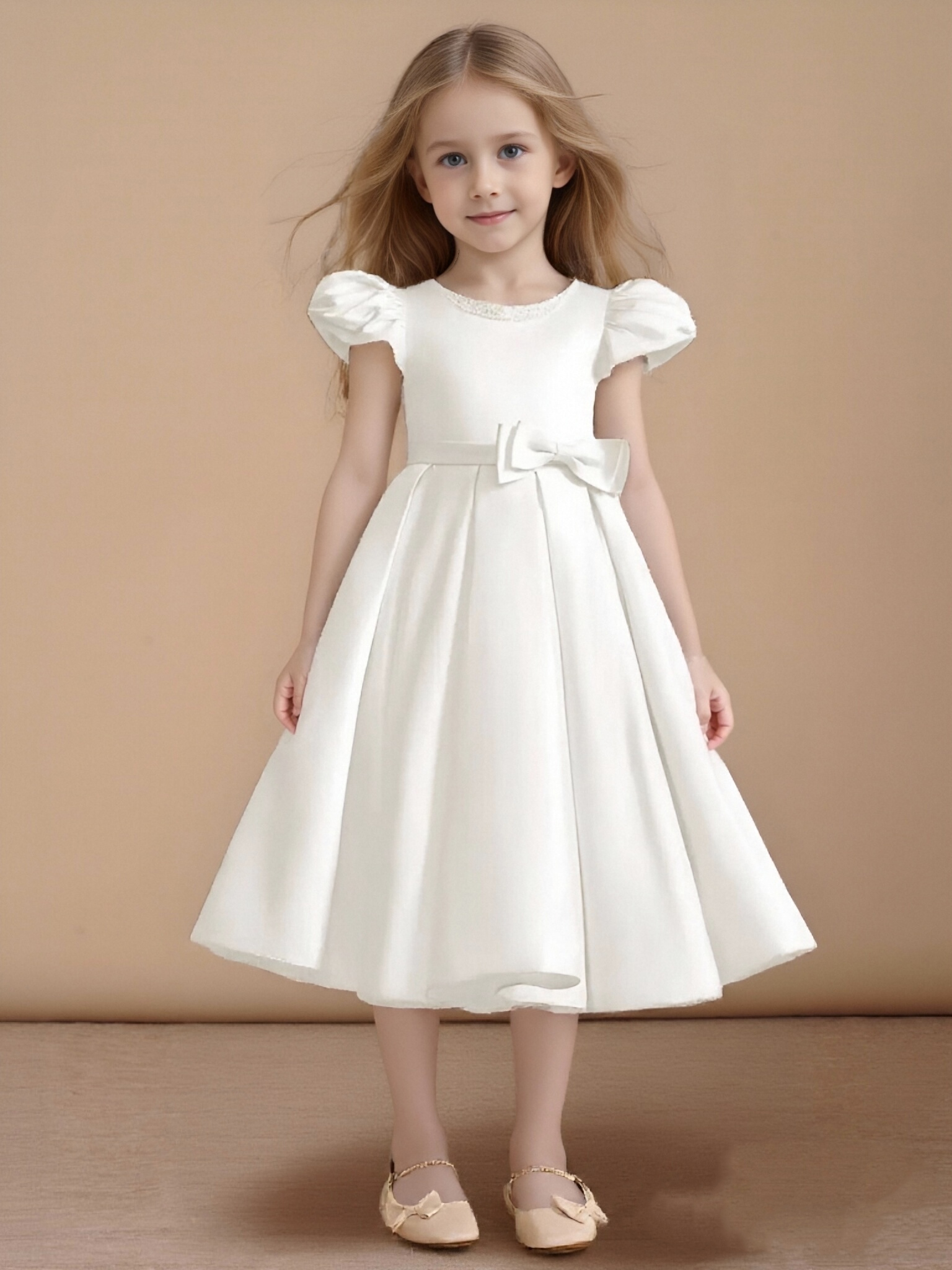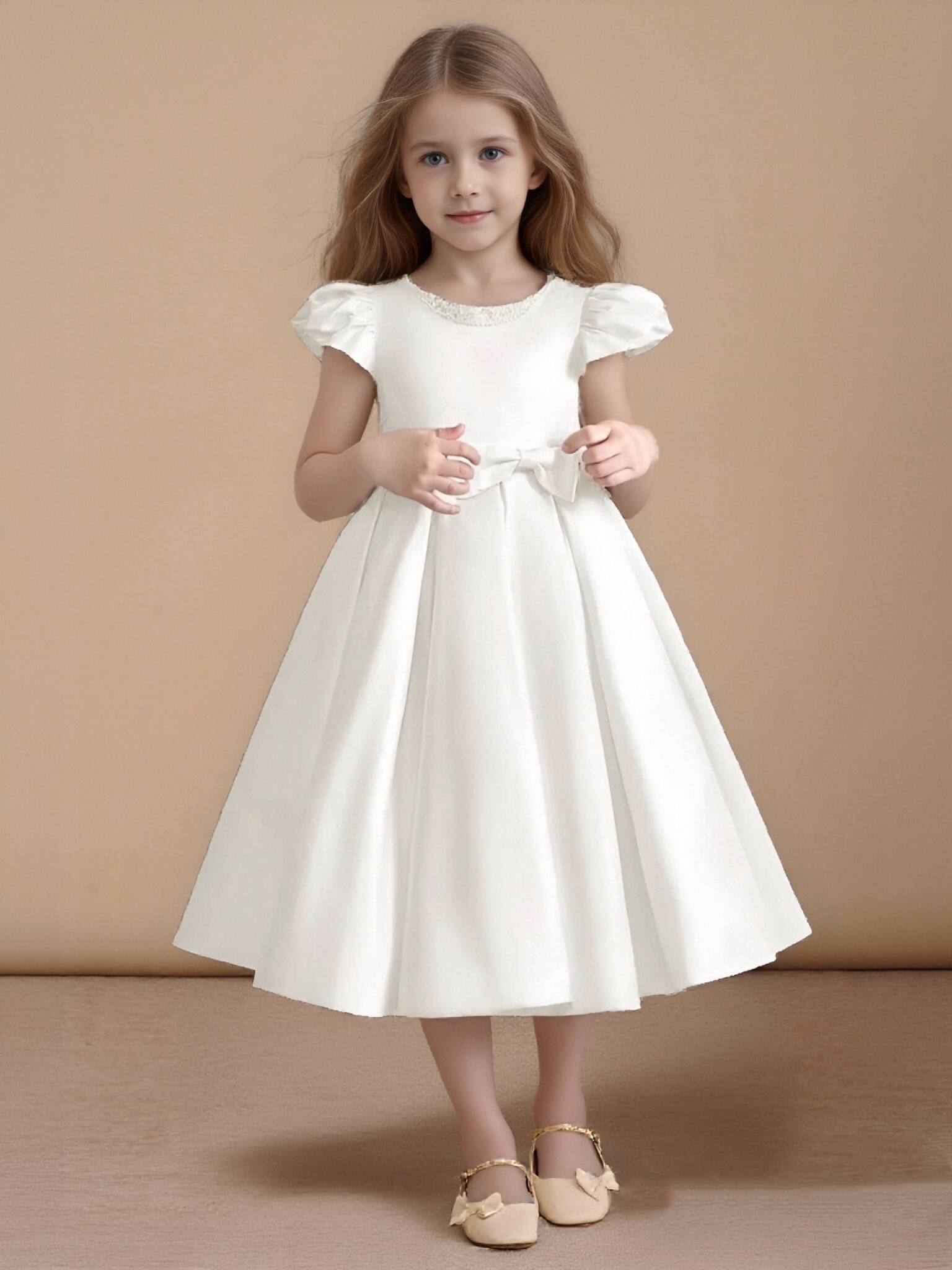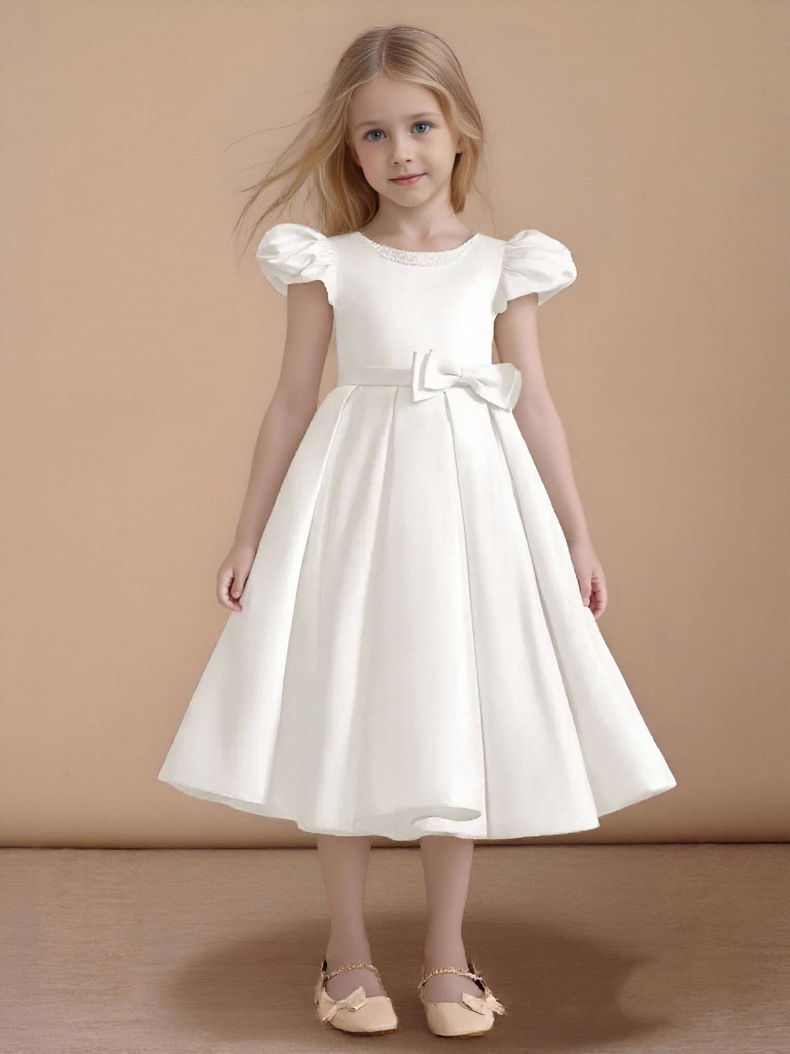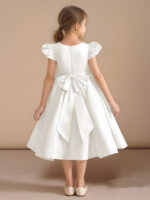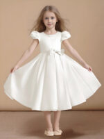 - Have your flower girl dressed to impress your friends and family while she wears our matte satin little ballgown, Pearl. Her neckline is jeweled with hand sewn beading, puff sleeves, and a beautiful bow belt that sits atop a full box-pleat tea length skirt. We have matching pearls at the sleeves and a removable back bow.