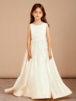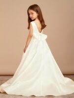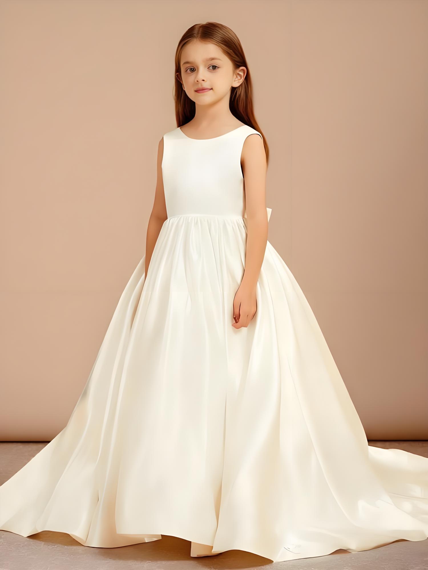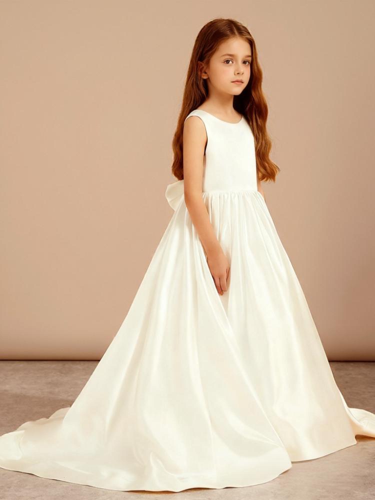 - The Bow Satin Sweep Train Flower Girl Dress showcases a timeless design with a graceful A-line silhouette, a luxurious satin finish, and a playful bow detail, ensuring your little one looks enchanting as she walks down the aisle.