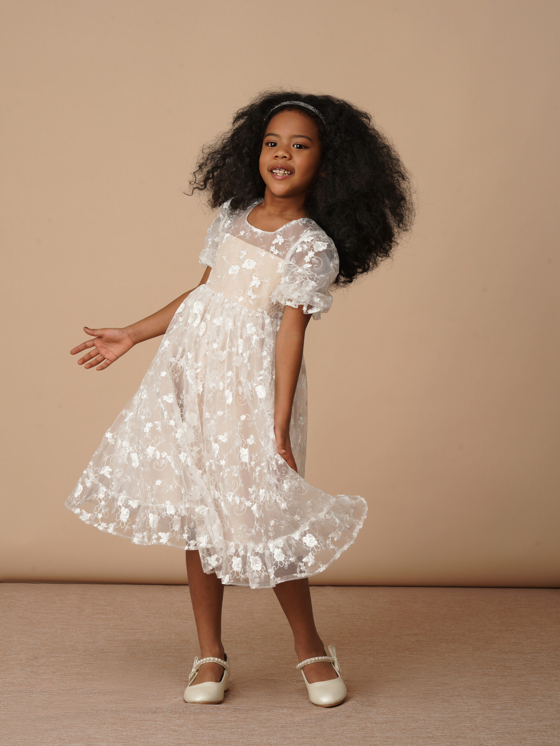 Floral – lace kids’ dresses with puffed sleeves, blending fairytale charm & comfort for magical moments.