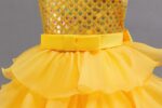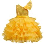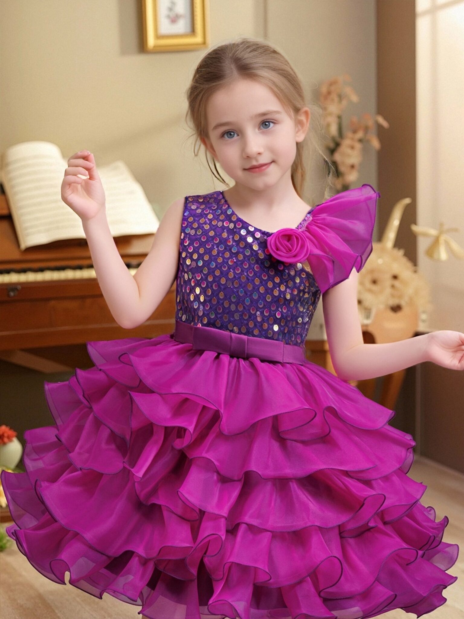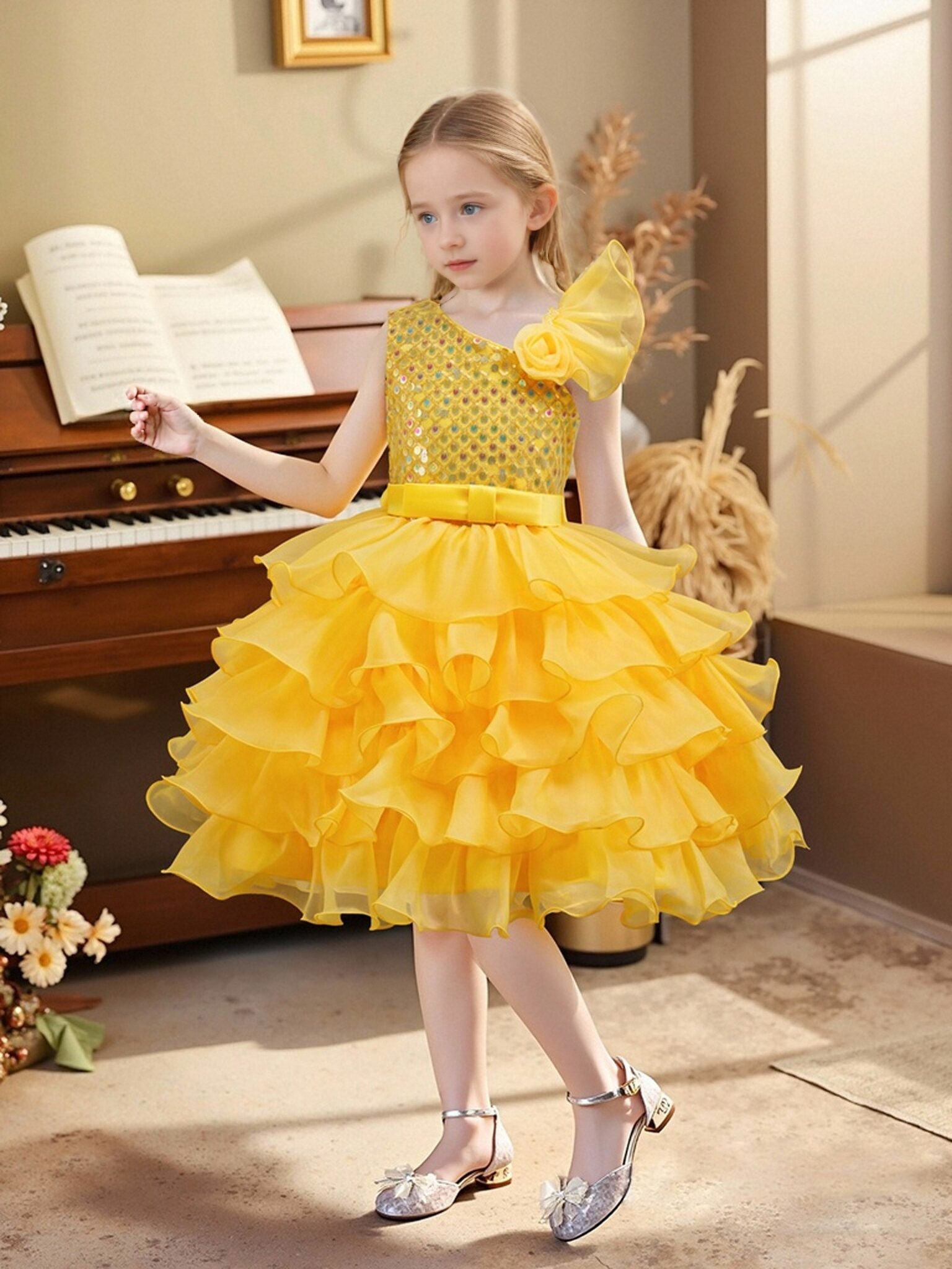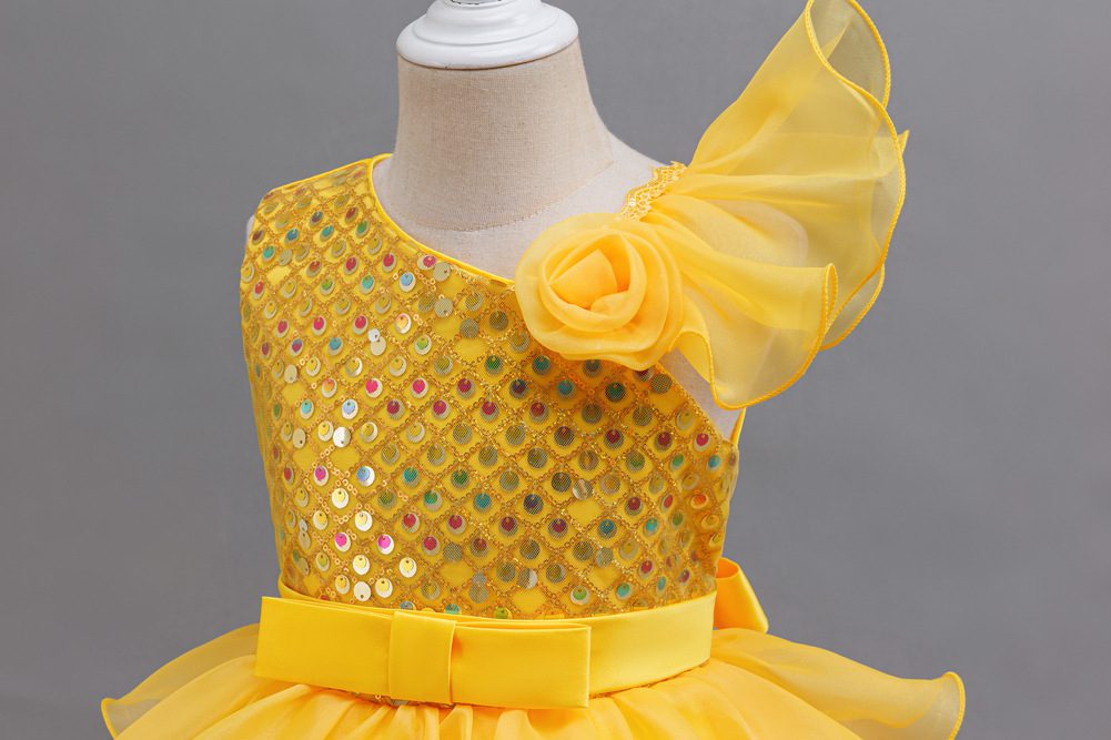 The unique one-shoulder style matched with a three-dimensional flower decoration is brimming with delicacy; the upper body is covered with shiny sequins, which glitter brilliantly under the light; the high-waisted satin belt defines the waist + multi-layer ruffled puffy skirt, featuring rich layers and a lively touch. When the child moves, it looks as romantic and elegant as a flower fairy~