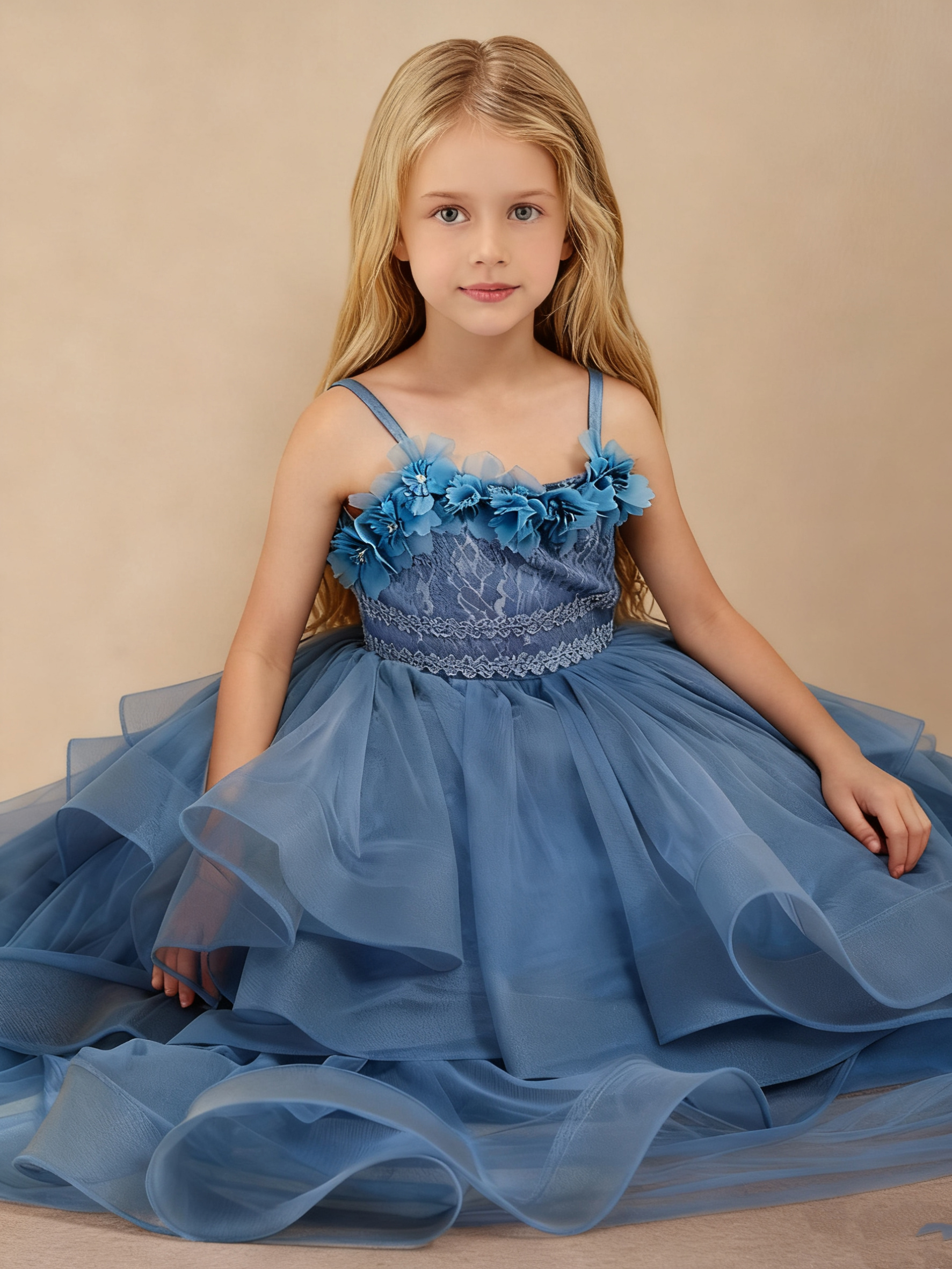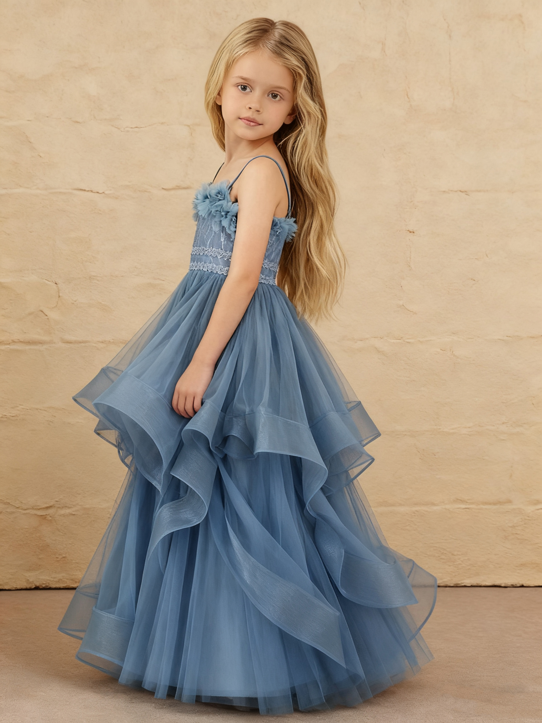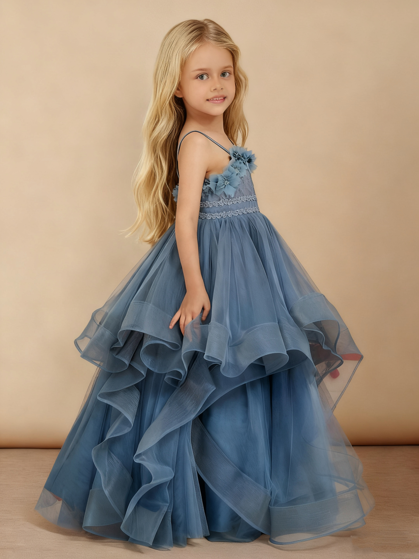 - Our Floral Applique Tiered Tulle Long Flower Girl Dress features a square neckline and a floor-length tiered tulle skirt. Adorned with floral and lace appliqués, this sleeveless ball gown includes a lace-up and zipper back for a perfect fit—ideal for any special occasion.