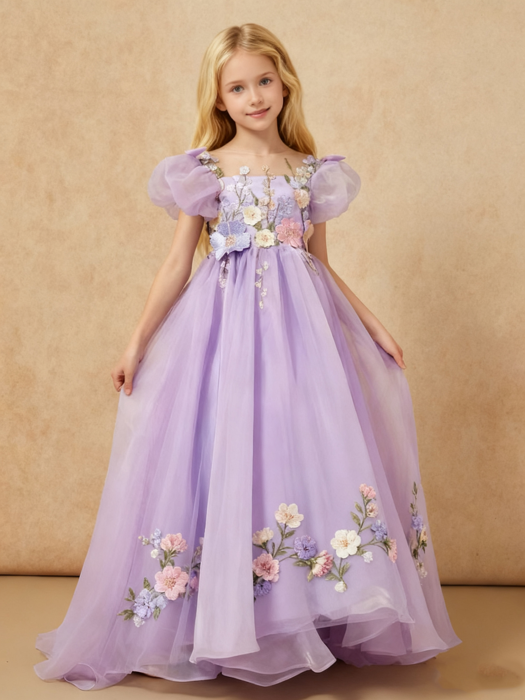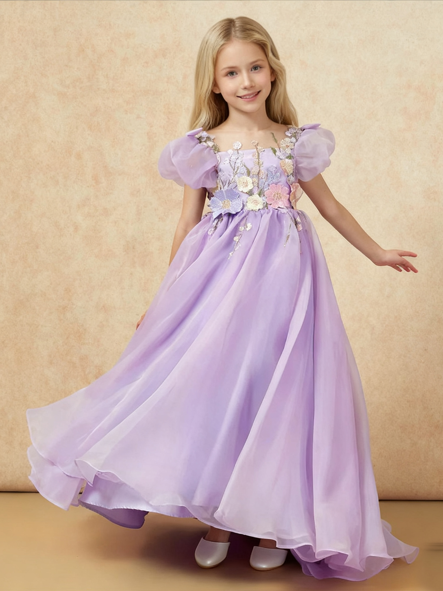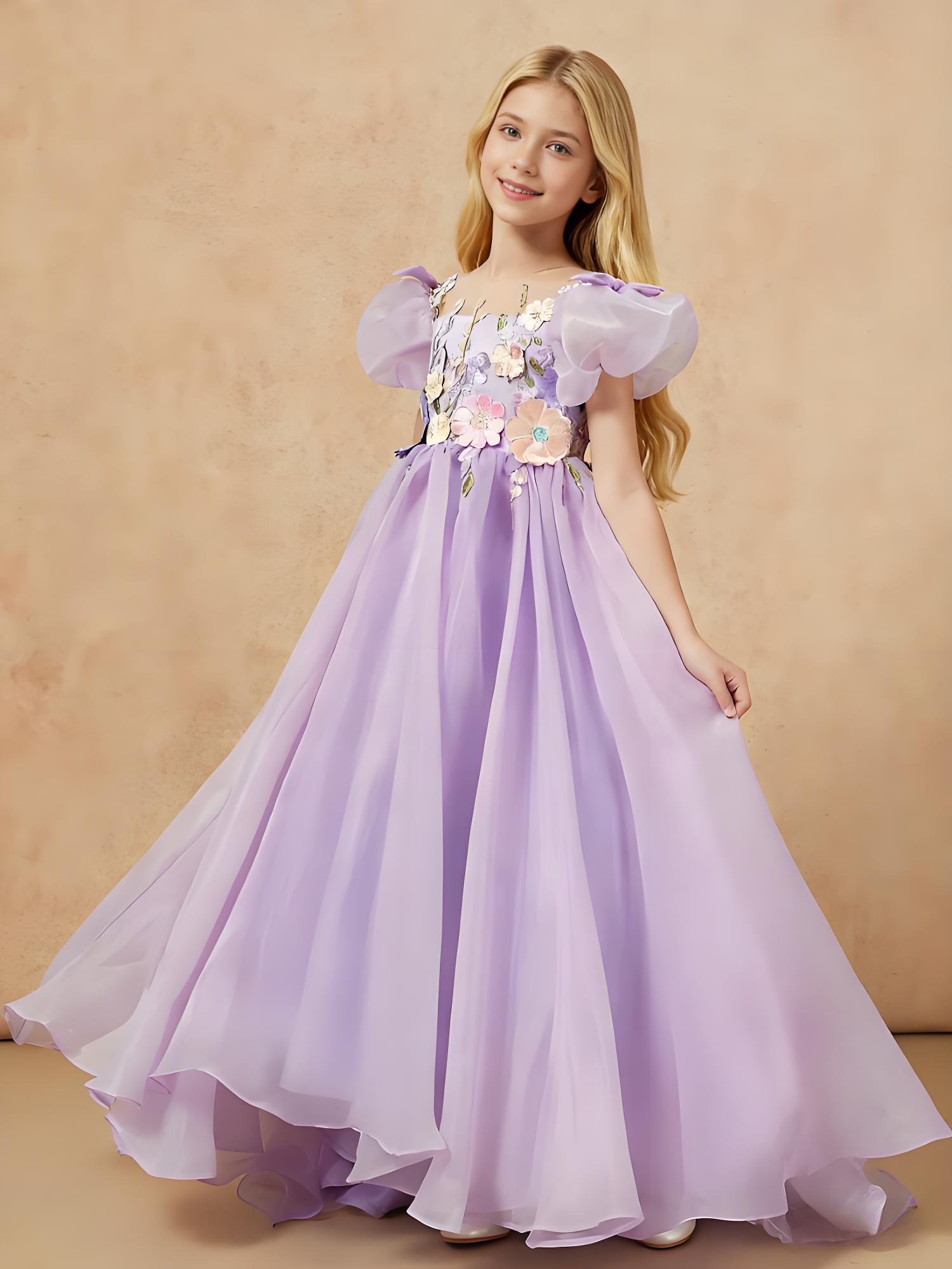 Floral Appliqued Illusion Neck Cap Sleeve Girls Dresses