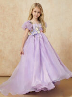 • Elegantly crafted for a fairytale look, this girl’s dress features a delicate illusion neckline and charming cap sleeves adorned with bowknot accents. Intricate floral appliques decorate the bodice, adding a touch of enchantment. The ball gown silhouette flows into a soft sweep train.