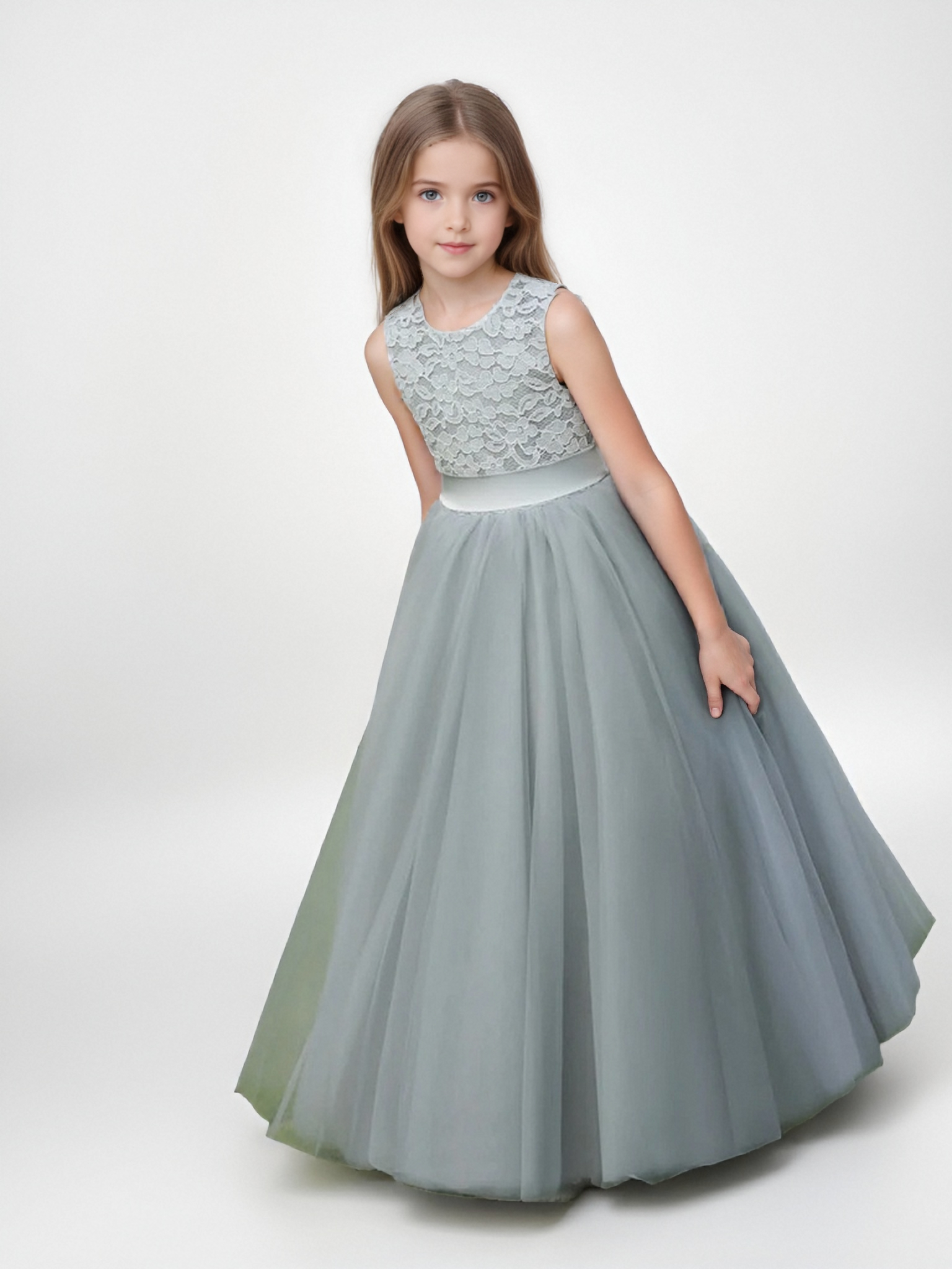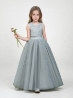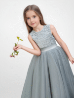 The sleeveless round neckline offers a timeless look, complemented by a satin waistband and a lovely bow at the back. Every detail is carefully crafted to make your little one shine with confidence and charm.