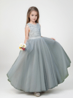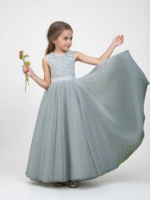 This charming flower girl dress is designed with a beautiful lace bodice and a full tulle skirt. The delicate lace adds a soft and graceful touch, while the voluminous skirt creates a dreamy and elegant silhouette.