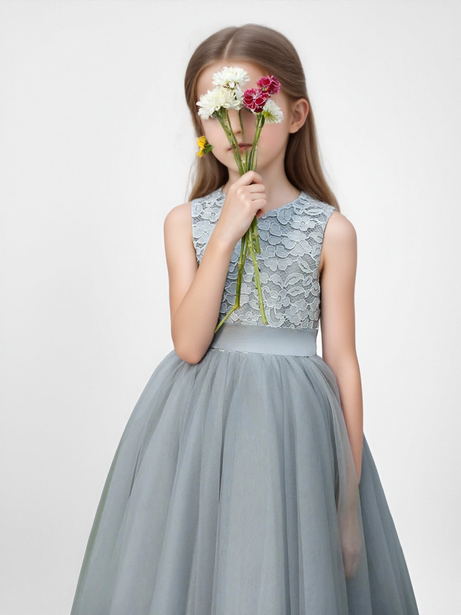 Made from premium tulle fabric, the dress feels light and comfortable, perfect for little girls to move freely during weddings, parties, and special occasions. The high-quality material gives it a gentle sheen and a graceful drape.