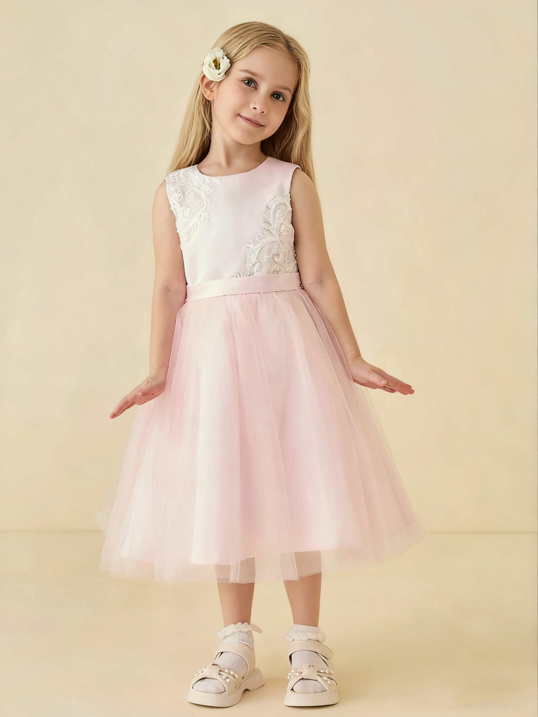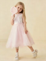 - Imagine your flower girl shining in a dazzling dress adorned with intricate beaded and sequin appliques, adding a touch of sparkle and charm to her look.