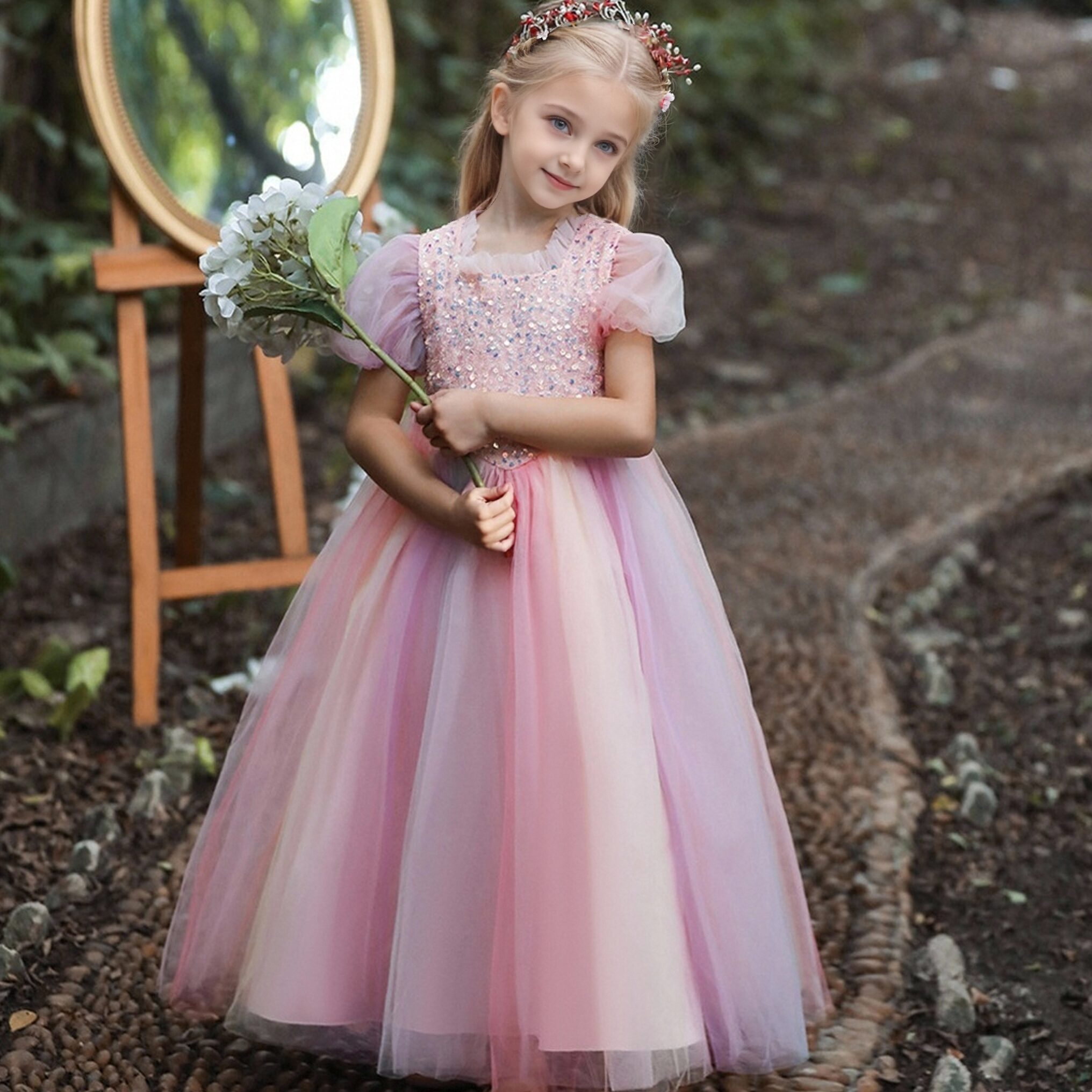 - Skirt & Silhouette: The skirt, made of airy tulle, is incredibly voluminous. It has a dreamy, flowy quality that makes every twirl feel like a dance in a magical realm. The way the tulle layers cascade gives the gown a truly royal silhouette fit for a little princess.