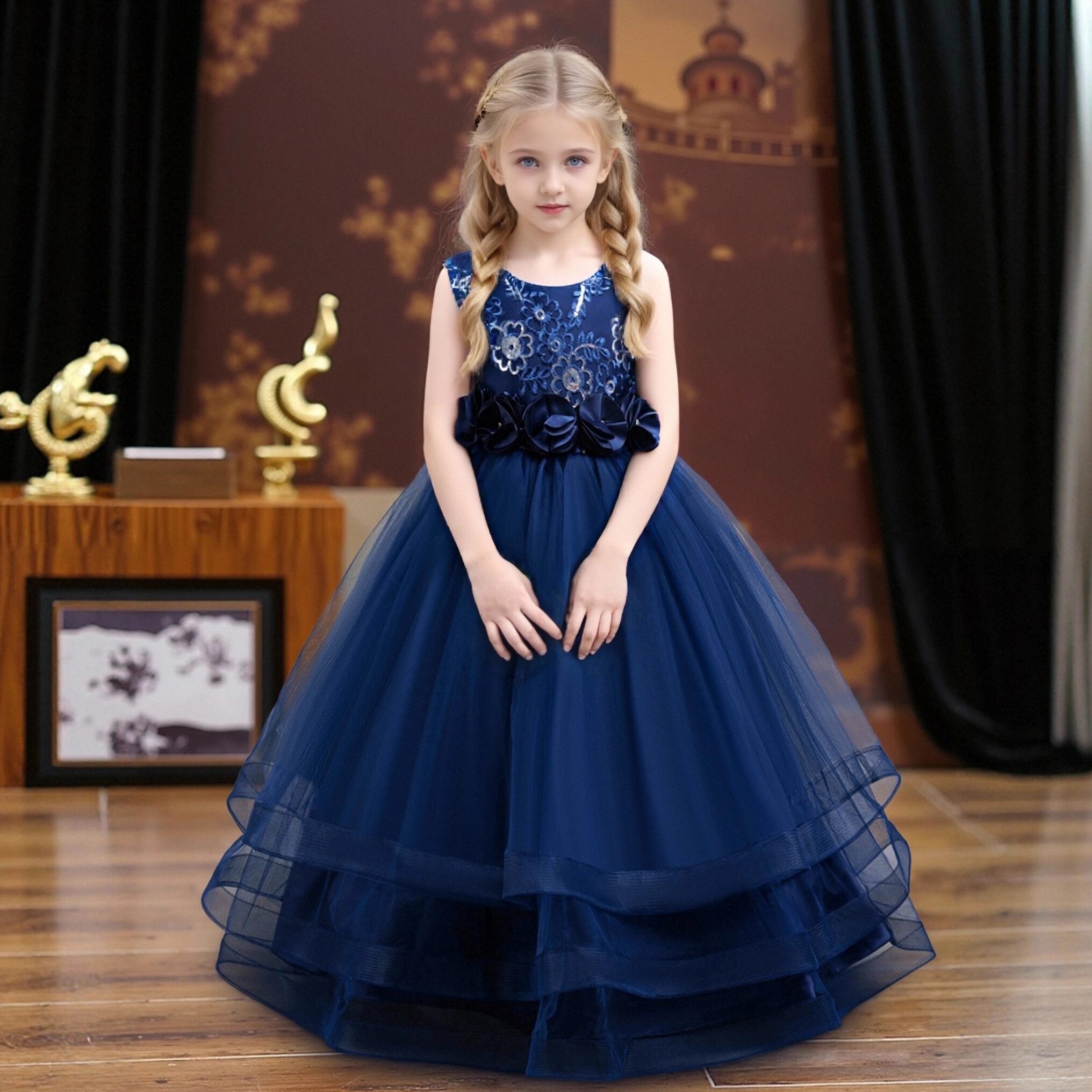 Imagine a gown that whisks kids into a fairy tale—this is it 🔮! Crafted from a cotton – polyester blend (snug yet durable), it’s a masterpiece of details: