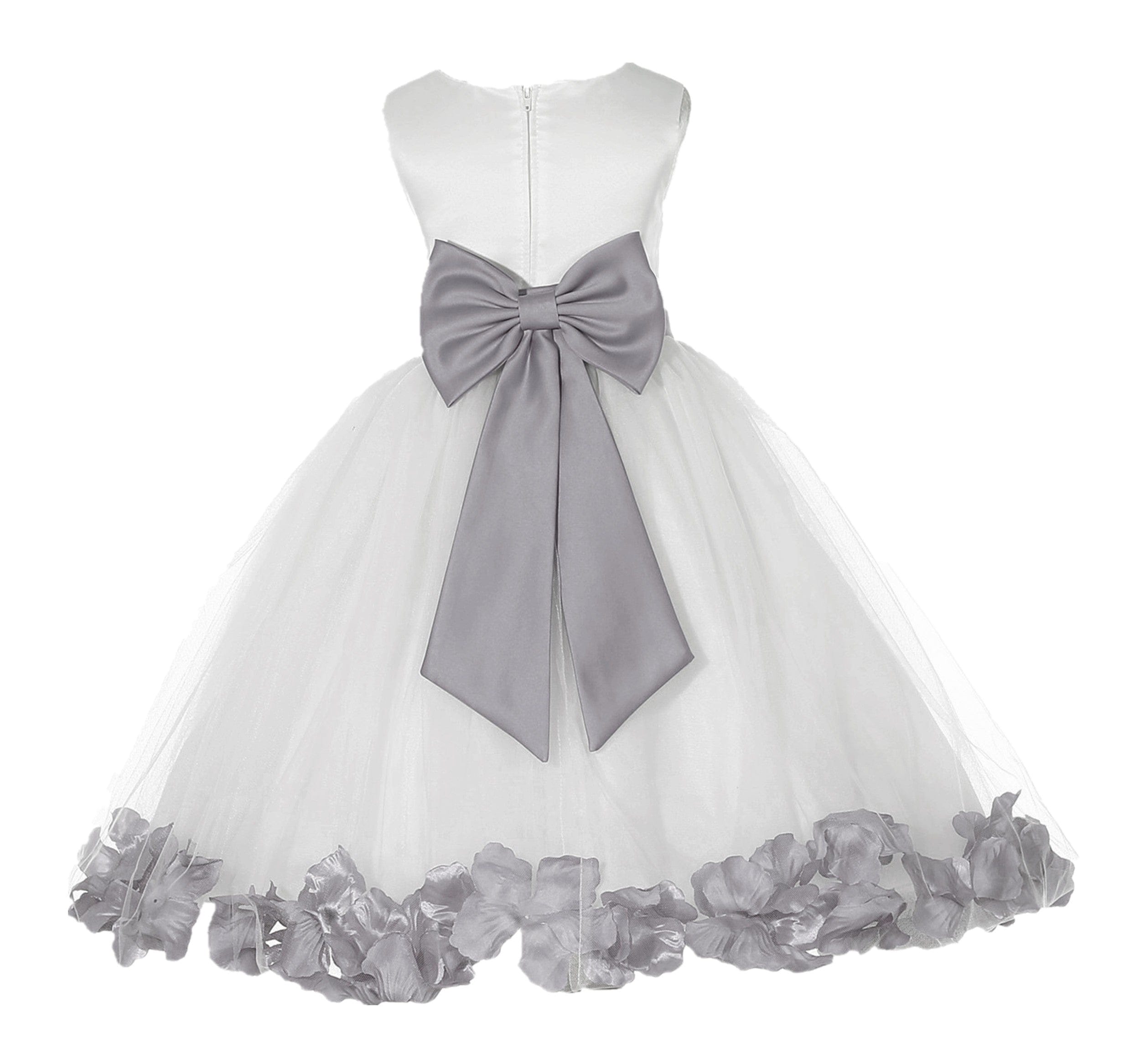 - The elegant bodice feature is made of ivory poly satin. The waistline is decorated with Your Choice of Color Tiebow Sash and flower to make this dress more elegant. The back of the dress has a zipper closure and a nice Tie Bow in the back.