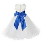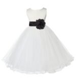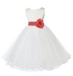 • The elegant upper bodice feature is made out of Ivory Satin Poly. The waistline is decorated with a removable choice of color sash and flower to make this dress more elegant. The back of the dress has a zipper closure and a nice bow you can tie for a snug fit.