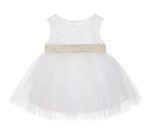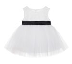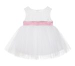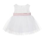 The elegant bodice feature is made of delicate lace with cotton lining and heart cutout design in the back. The waistline is decorated with a tiebow sash and flower to make this dress more elegant. The skirt has 4 layers, top 2 layers are made of elegant soft tulle. 3rd is layer of satin, the 4th layer is a cotton lining to bring comfort to your little girl while wearing the dress. The back of the dress has pearl button closure on top and zipper closure on the waist.