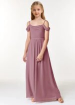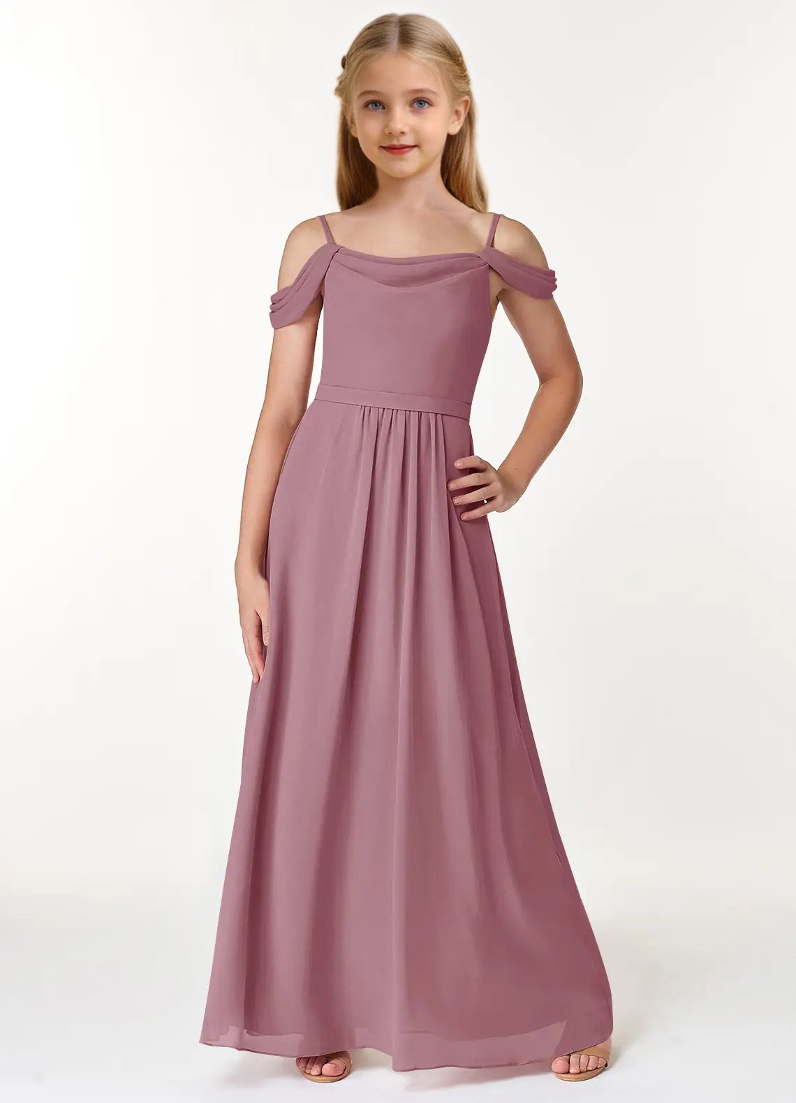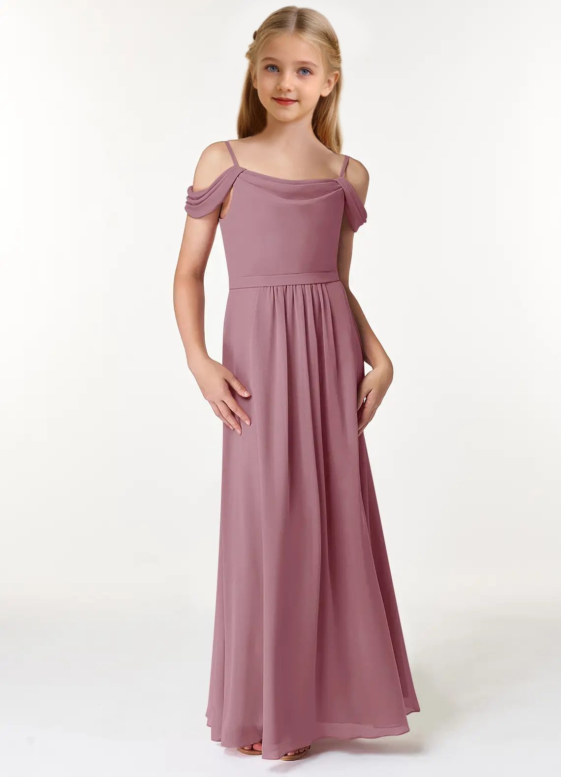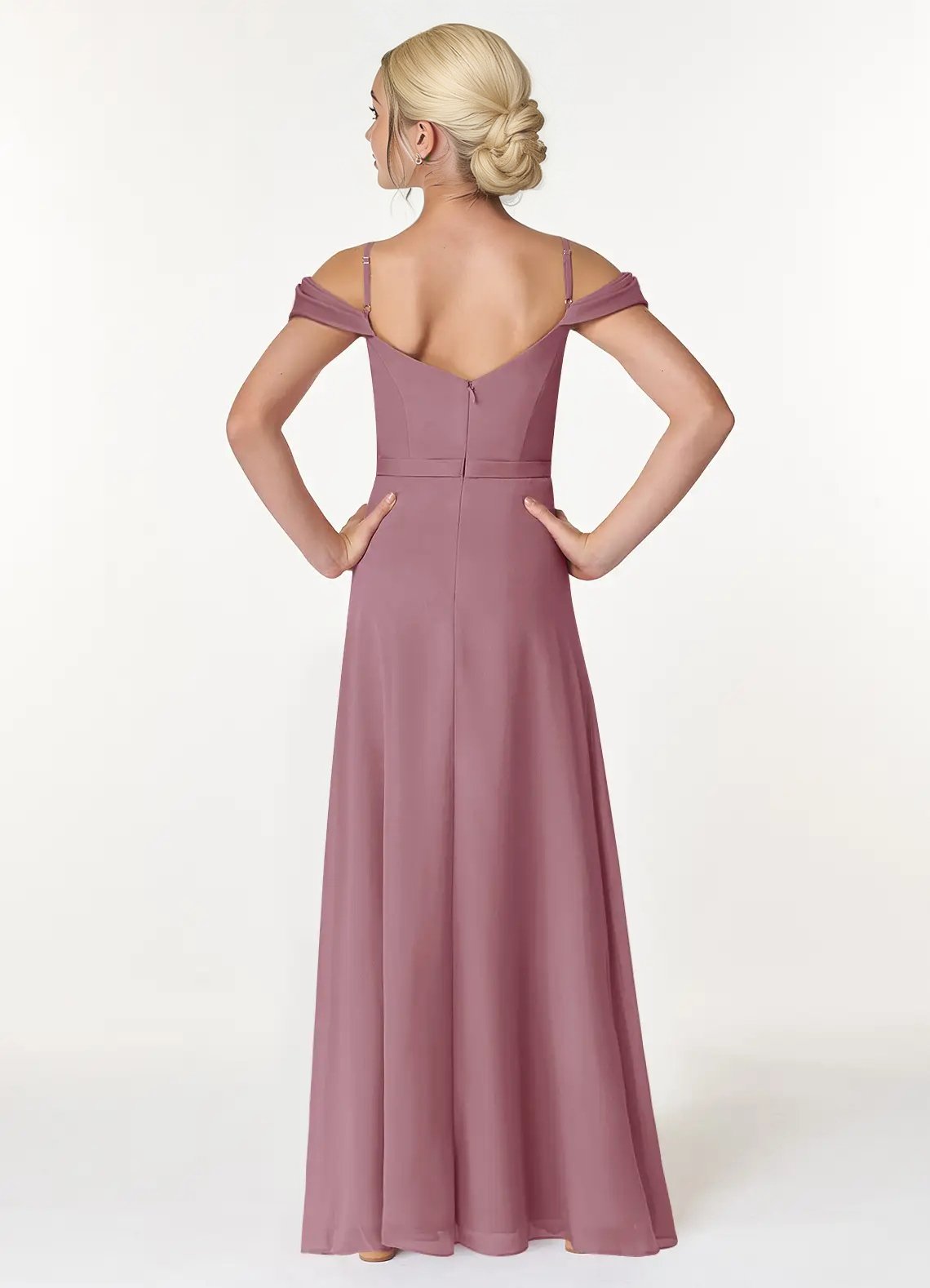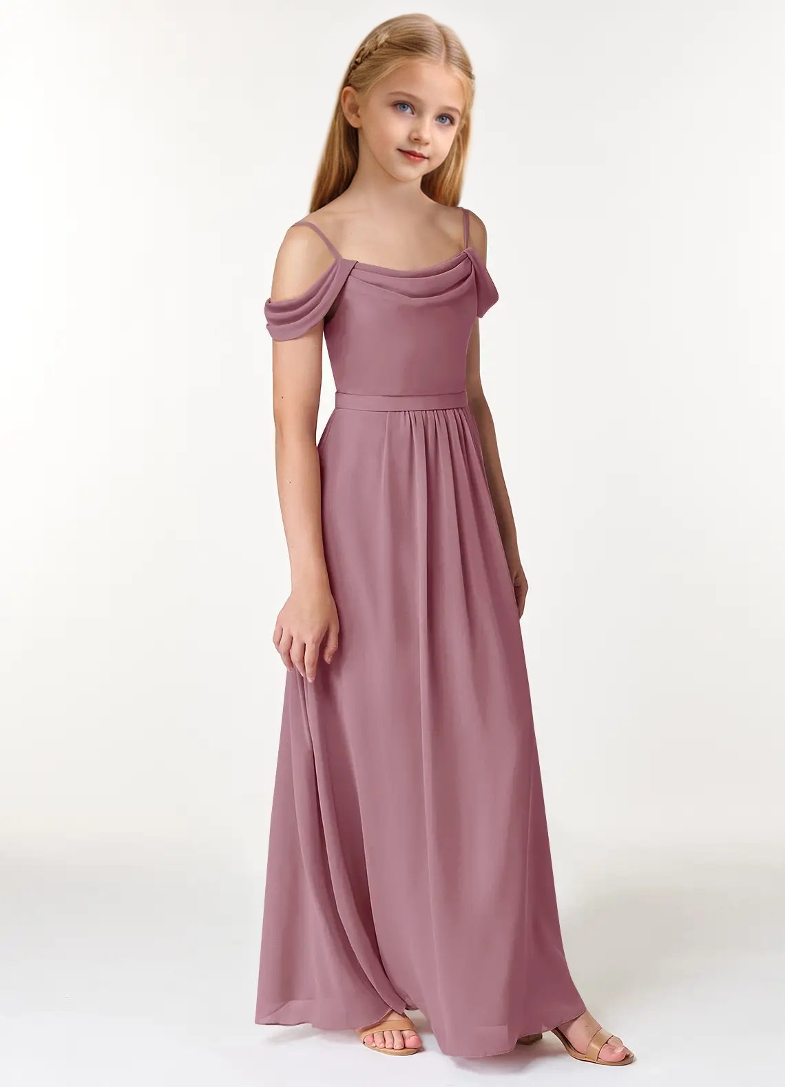 Joyous Alivia JBD is a floor-length chiffon dress in an A-line cut. She features spaghetti straps Off-the-Shoulder. Azazie’s Alivia style comes in sizes J6-J16 and custom sizing.