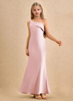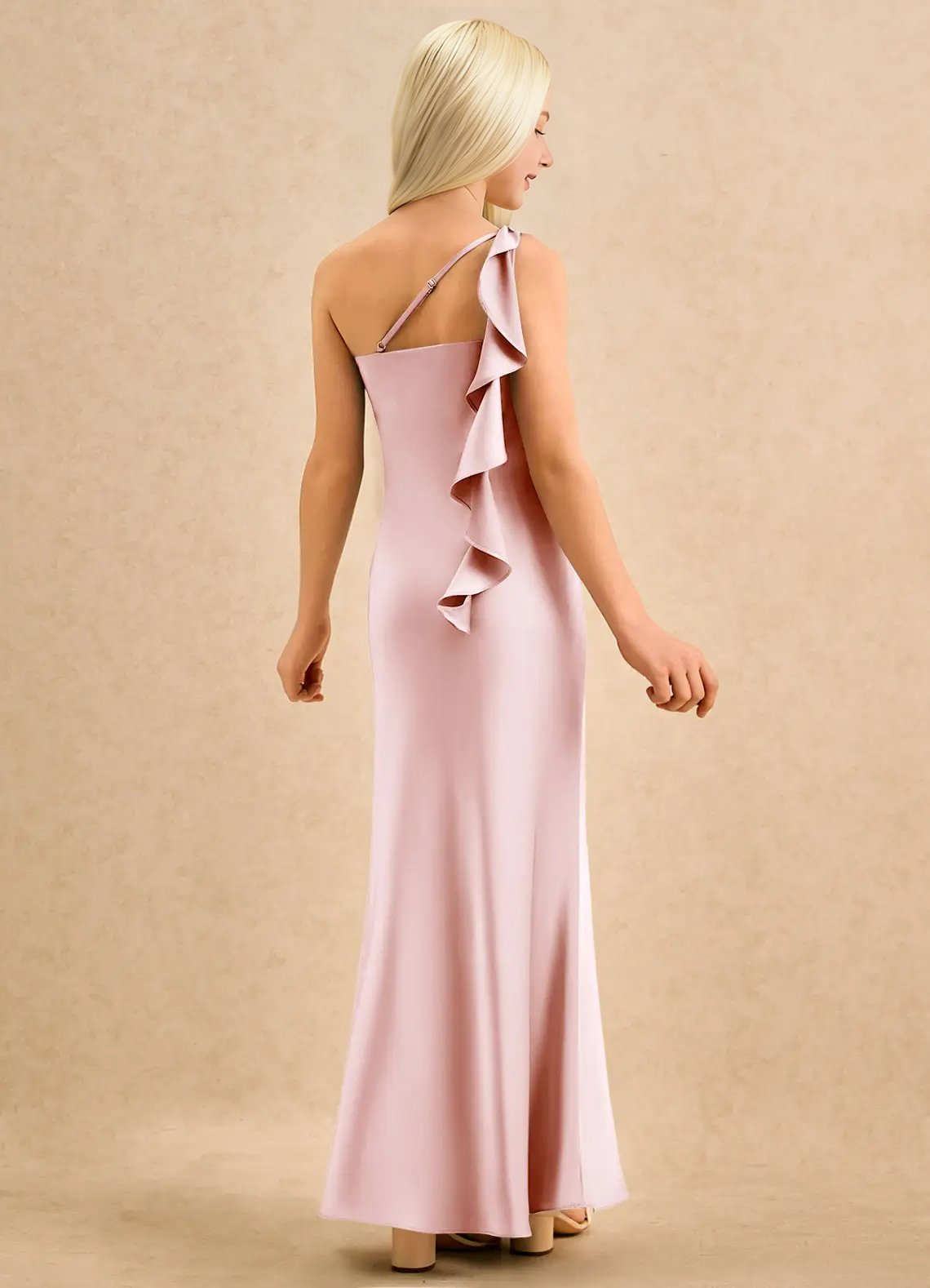 The Almond flower girl dress is a sleek sheath gown made from stretch satin, featuring a stylish one-shoulder neckline with a fold-over detail. Double spaghetti straps cross the back, while a cascading ruffle flows gracefully from the shoulder for a modern, elegant finish.