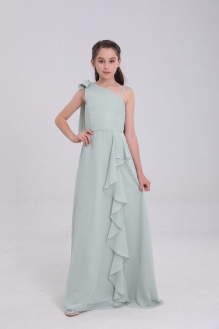 Let the flower girl be all dolled up in our tulle and satin dress Amber. She has delicate ruffled tulle at the neckline that drapes over her shoulders and ends at a removable bow in the back. With this full skirt she can twirl to her heart’s content. We’ve added most of our available colors to match any wedding party. Please note that the satin and tulle will differ slightly in shades of color due to difference in fabric, this is in no way a defect. Please note that for sizes 10-14, adjustments are made to both the sizing and the shape of this dress to make it more suitable for a girl’s figure.