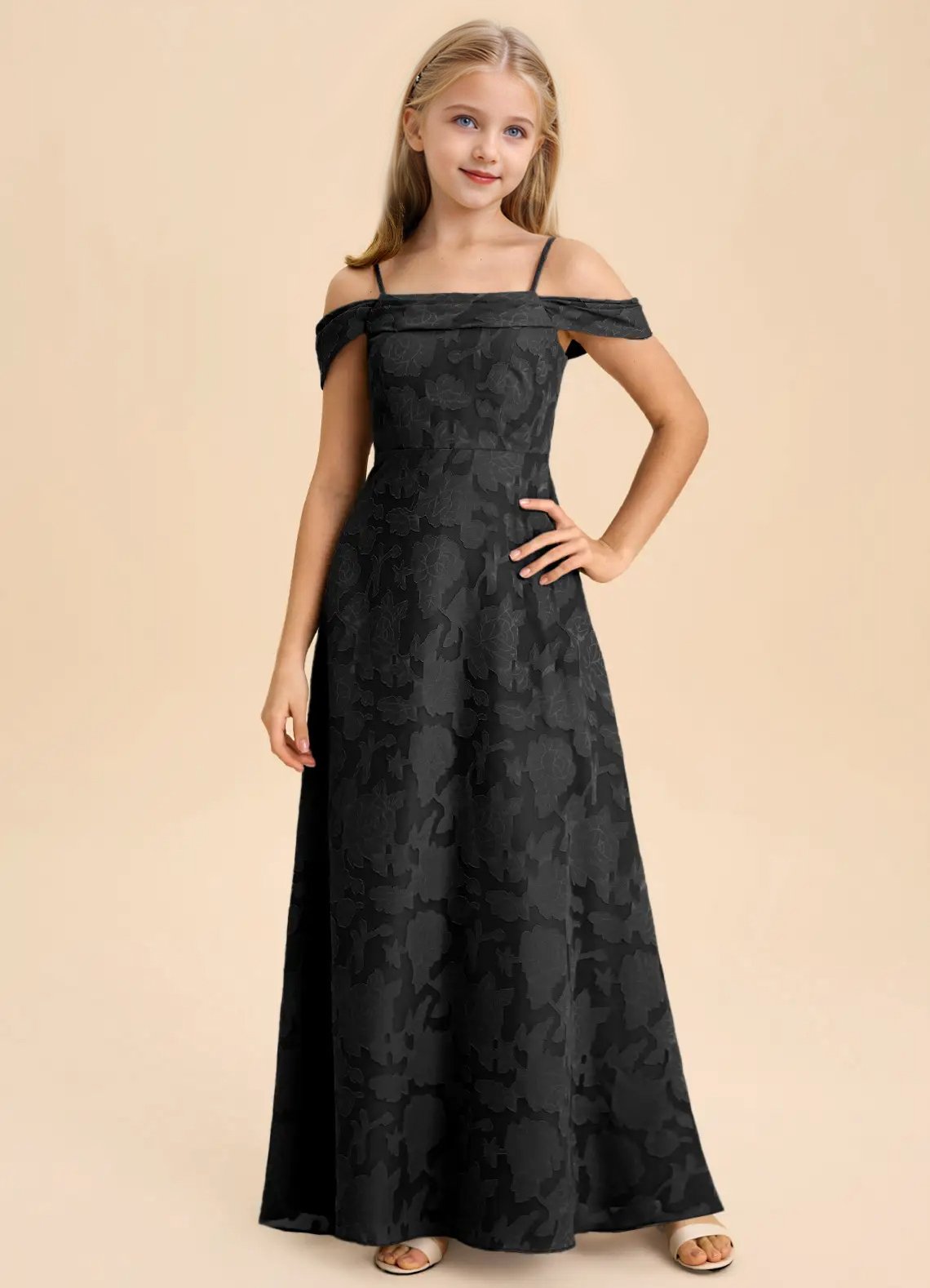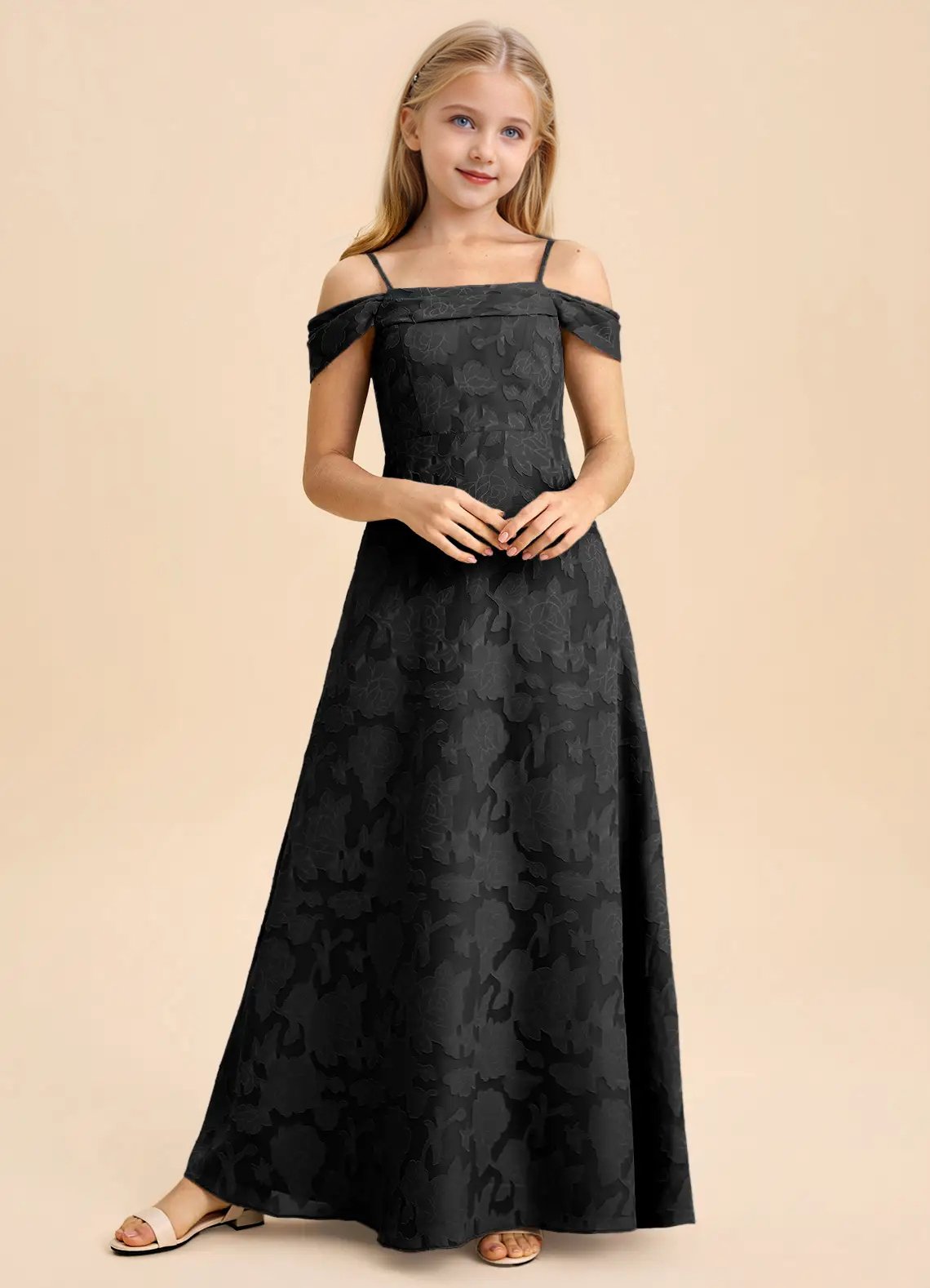 Anselie features a gently pleated off-the-shoulder neckline and a twirl-ready skirt for a look that’s full of charm and perfect for celebrating in style.