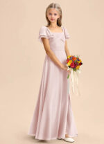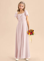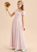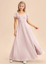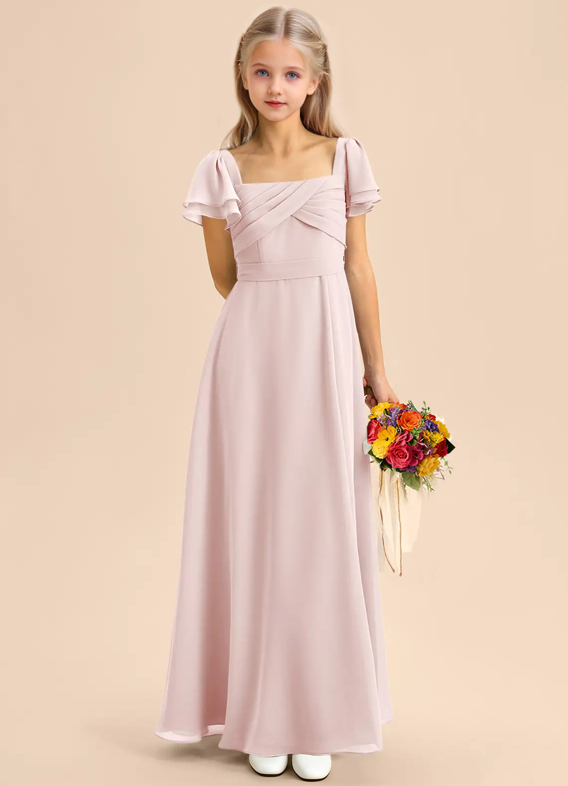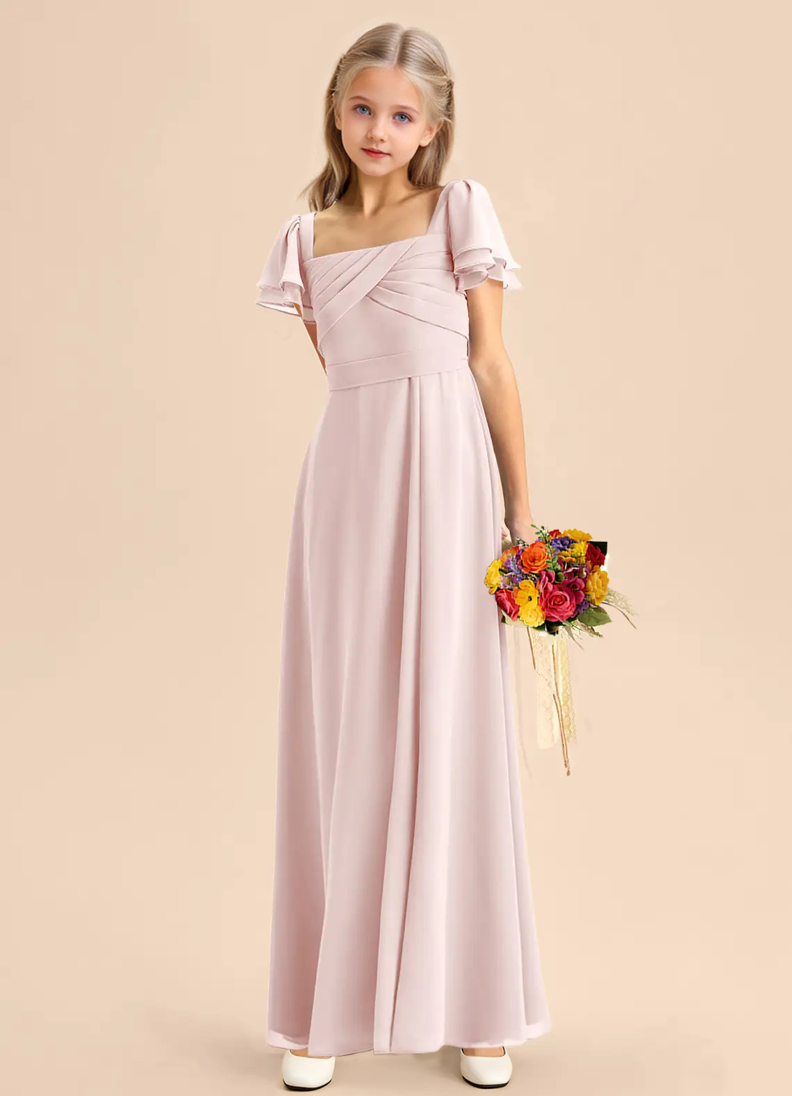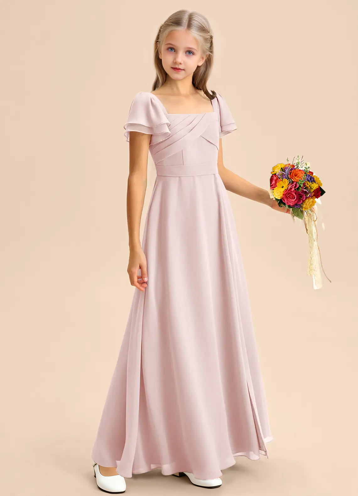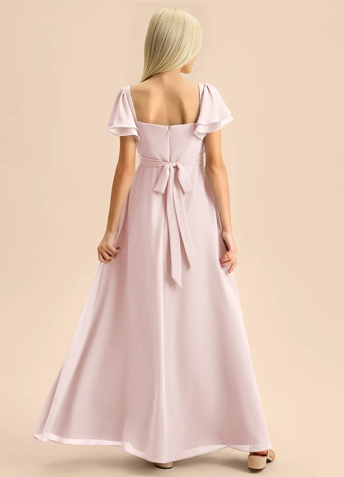 Azey is a floor length junior bridesmaids dress crafted from airy chiffon in a flattering A-line silhouette. It features a square neckline, short flutter sleeves, and a pleated crossover bodice with a belted waist that ties into a self-tie bow at the back. The softly pleated skirt is finished with a subtle leg slit for graceful movement.