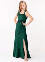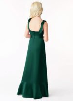 Look adorable while wearing our Barbara JBD dress. Cut in stretch satin, this dress features a square neckline and straps with bows. A self fabric belt accentuates the waist.This style is A line skirt with Floor Length.