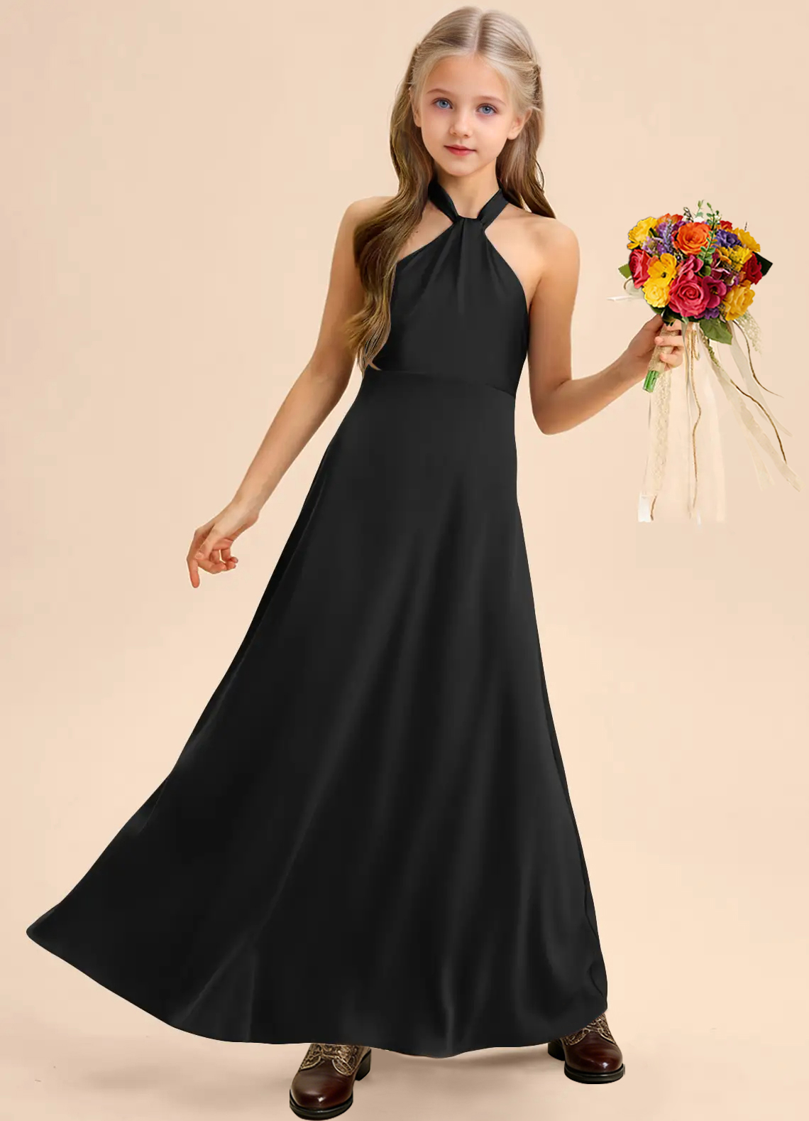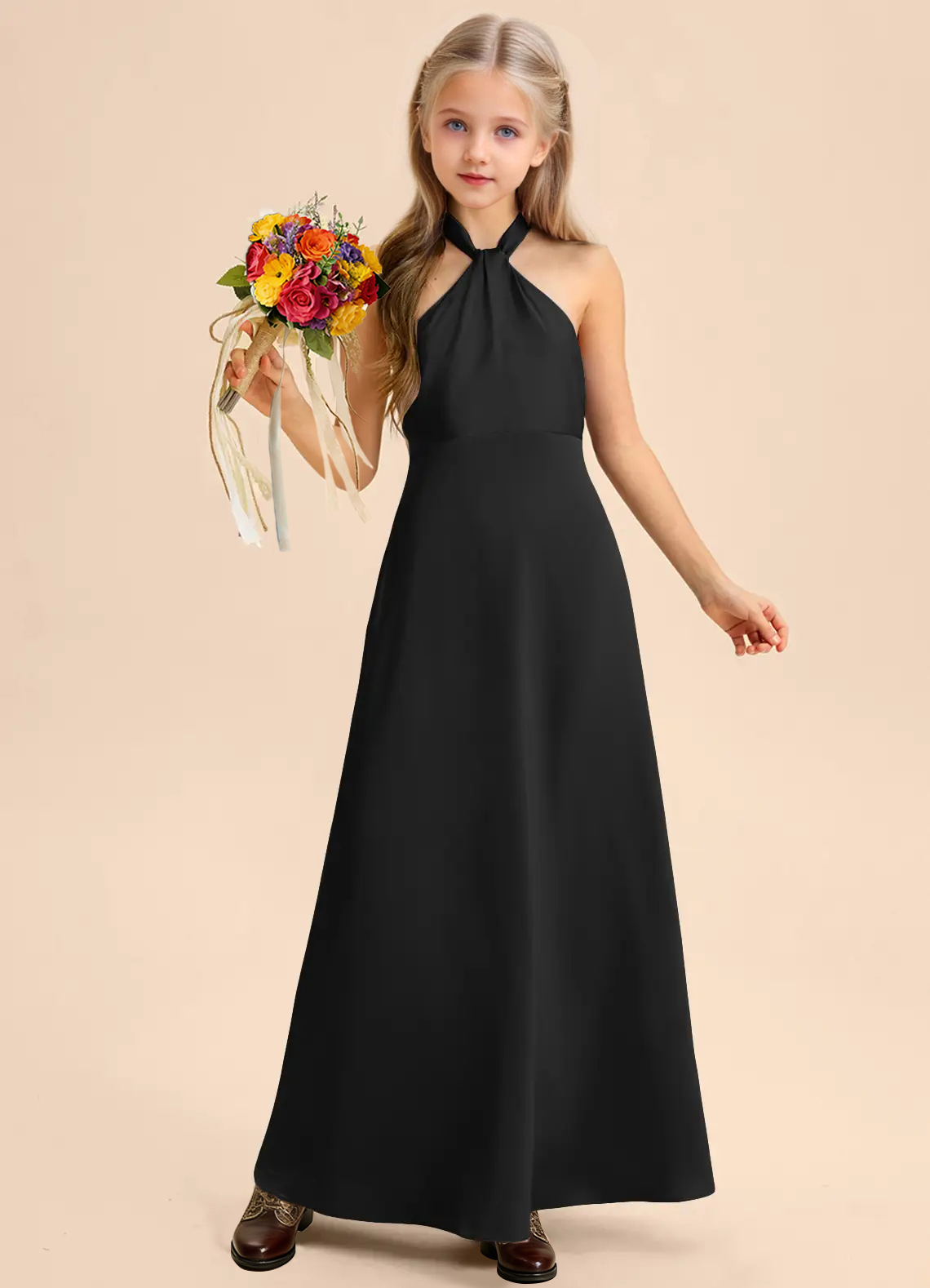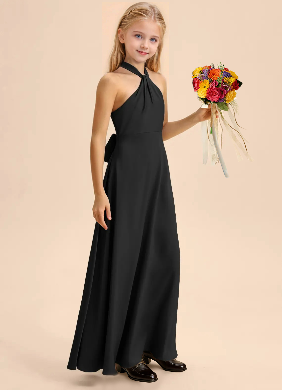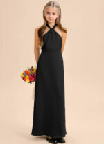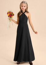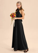 This floor-length junior bridesmaids dress features a graceful A-line silhouette crafted from smooth stretch satin. The sleeveless halter design showcases a high Y-shaped neckline that forms an elegant keyhole back, finished with a self-tie bow at the waist. A softly pleated skirt adds fluid movement for a polished finish.