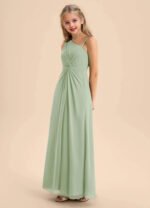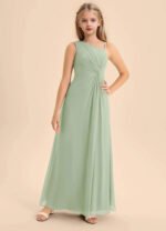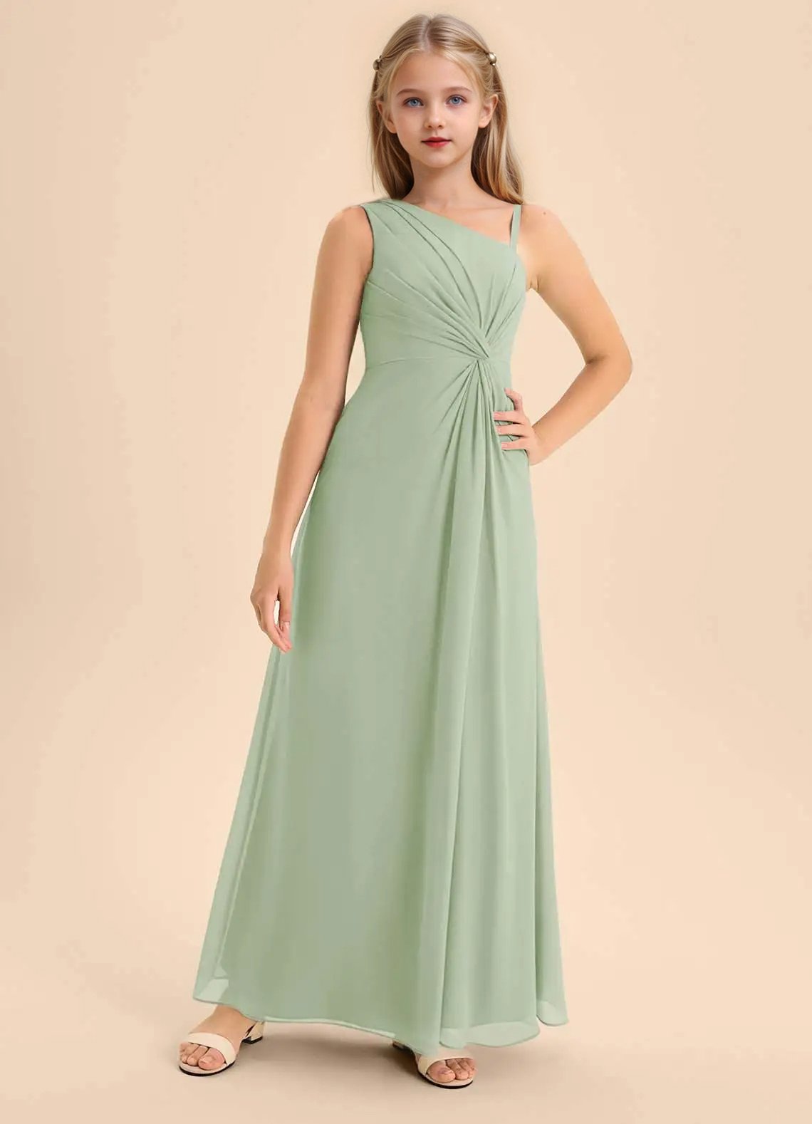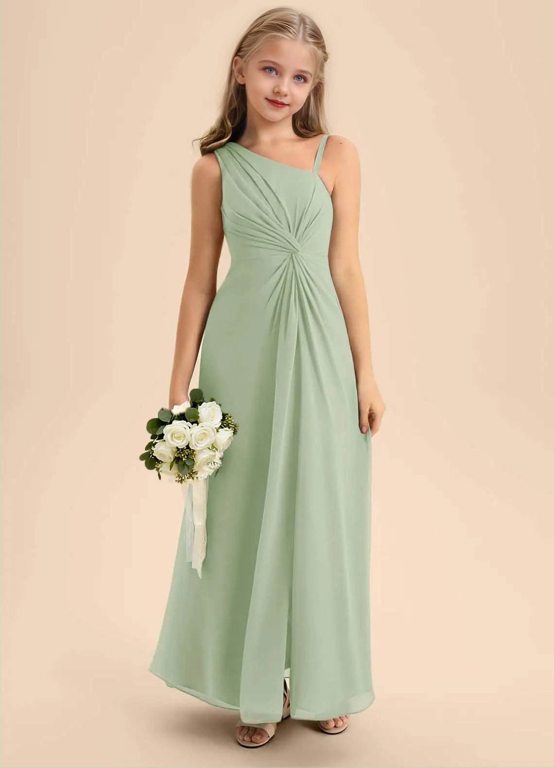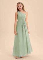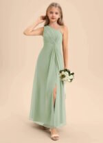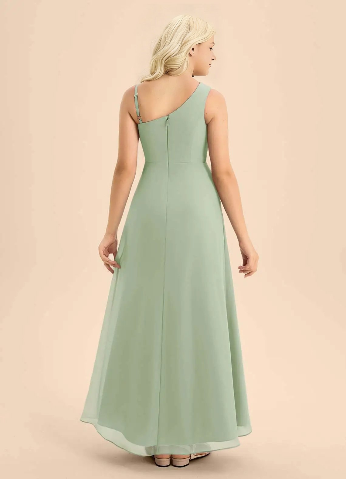 Have your junior bridesmaids match your leading ladies wearing our Brooke dress. This one-shoulder gown is made of a flowing chiffon, giving your bridesmaids a look of modern elegance. Her bodice pleating and side waist knot accentuate the waistline, and a side leg slit adds a lovely touch to her classic A-line skirt.
