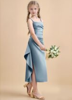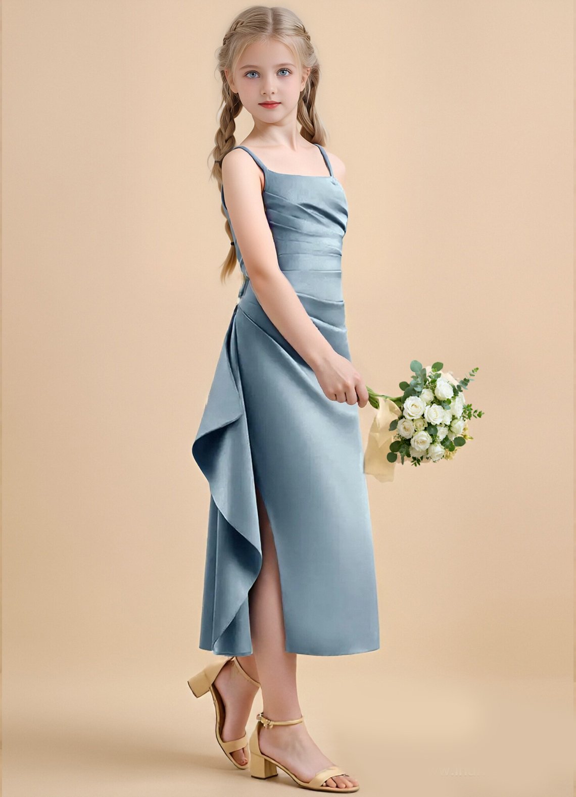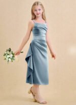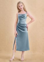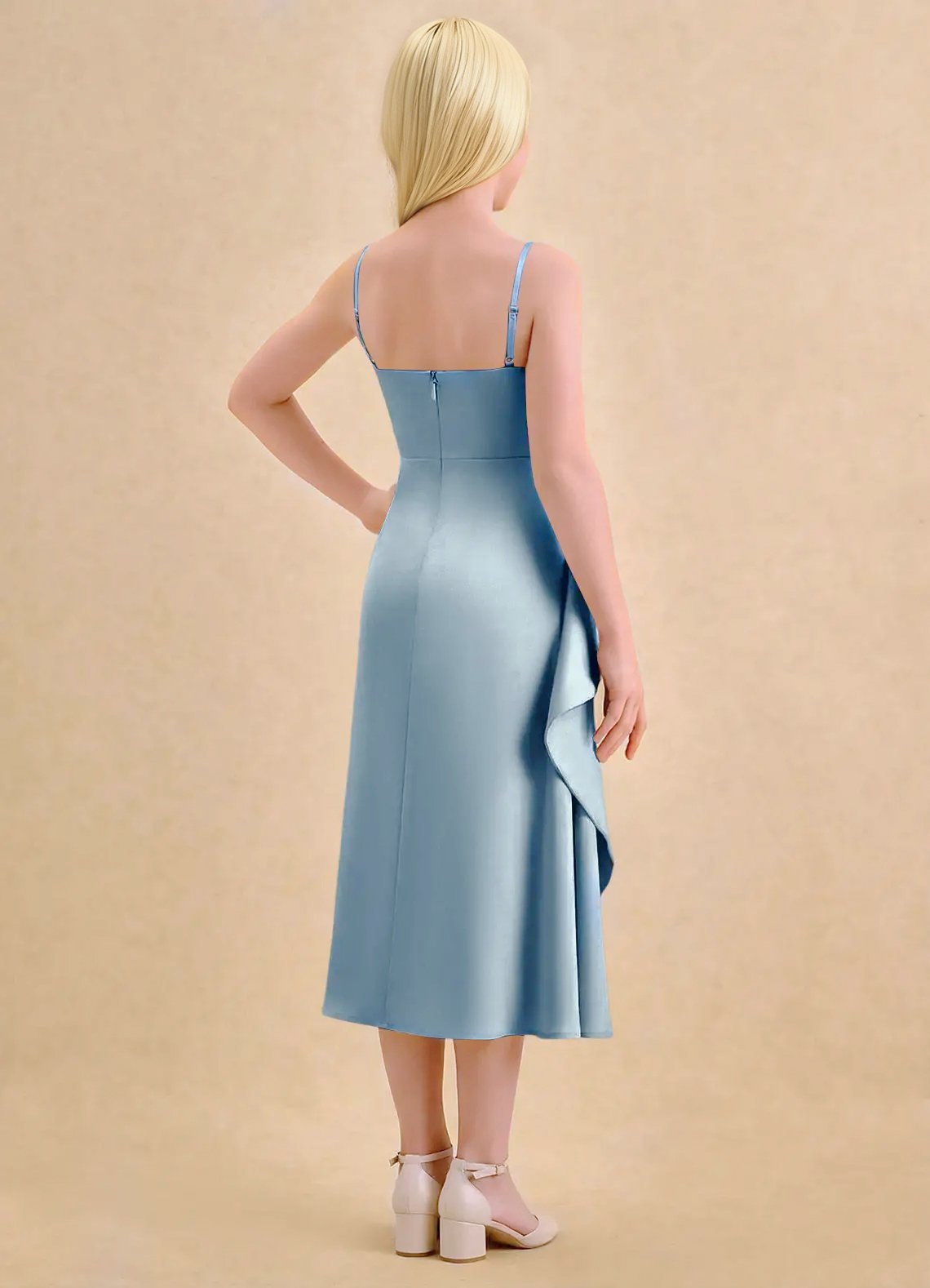 Canna is designed with delicate adjustable spaghetti straps and a gently ruched bodice; this tea-length silhouette flatters beautifully while offering a comfortable fit. A subtle side slit adds a modern touch and allows for easy movement, creating a perfect balance of sophistication and youthful charm.