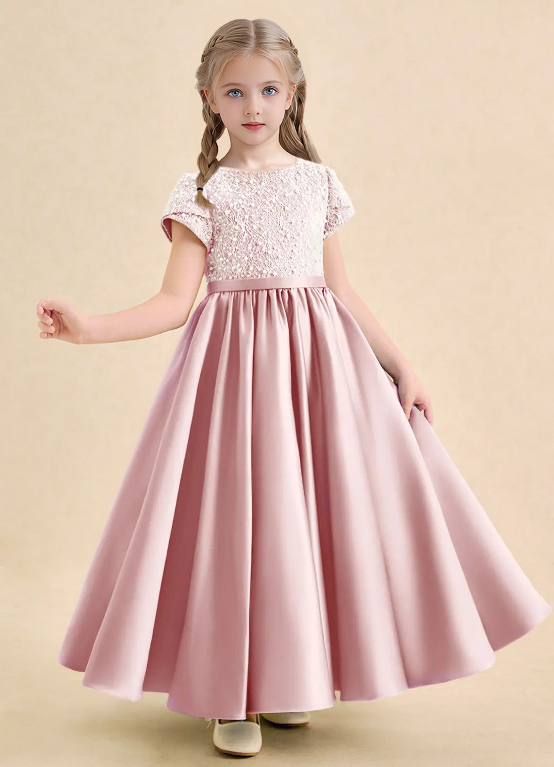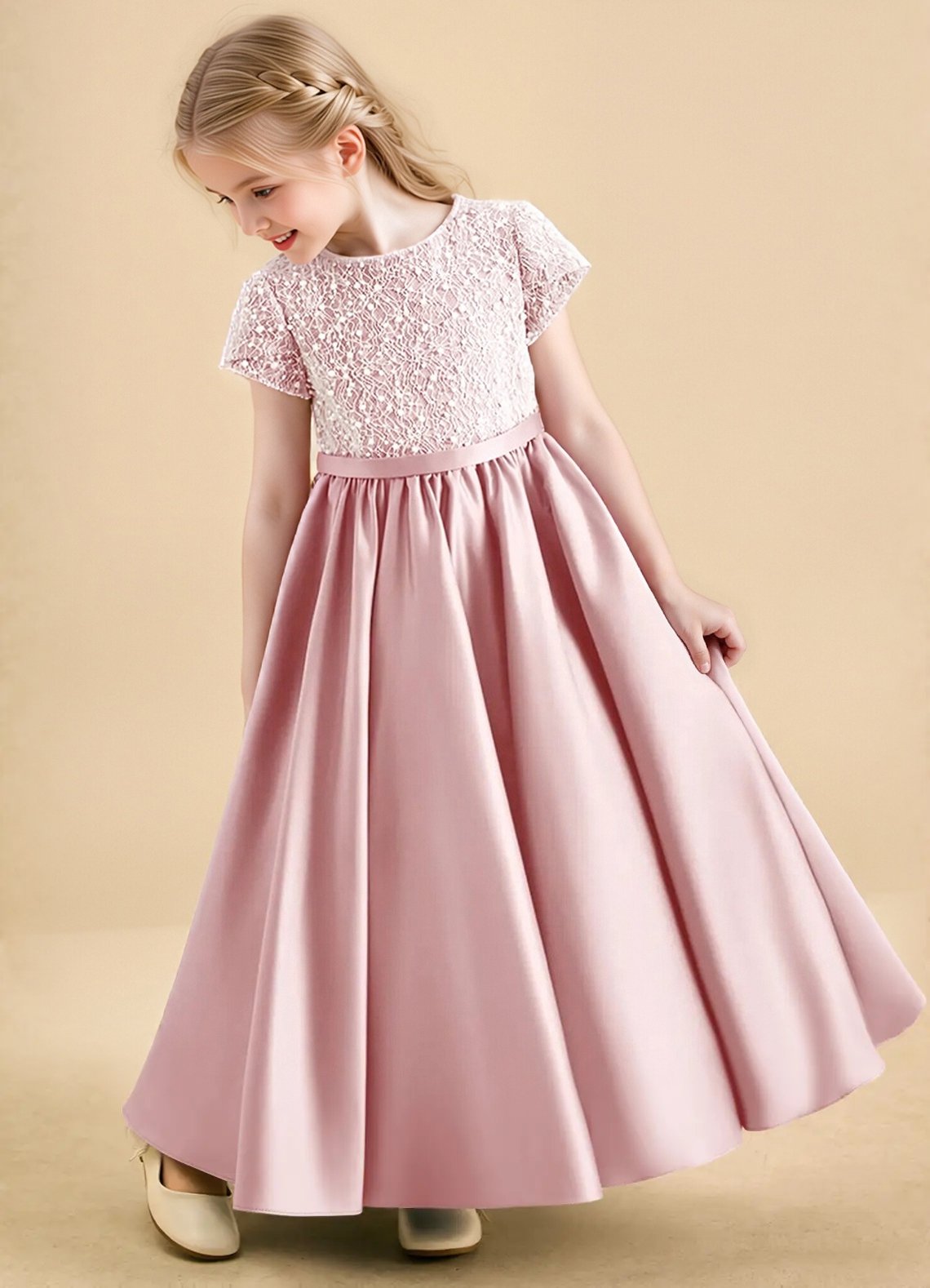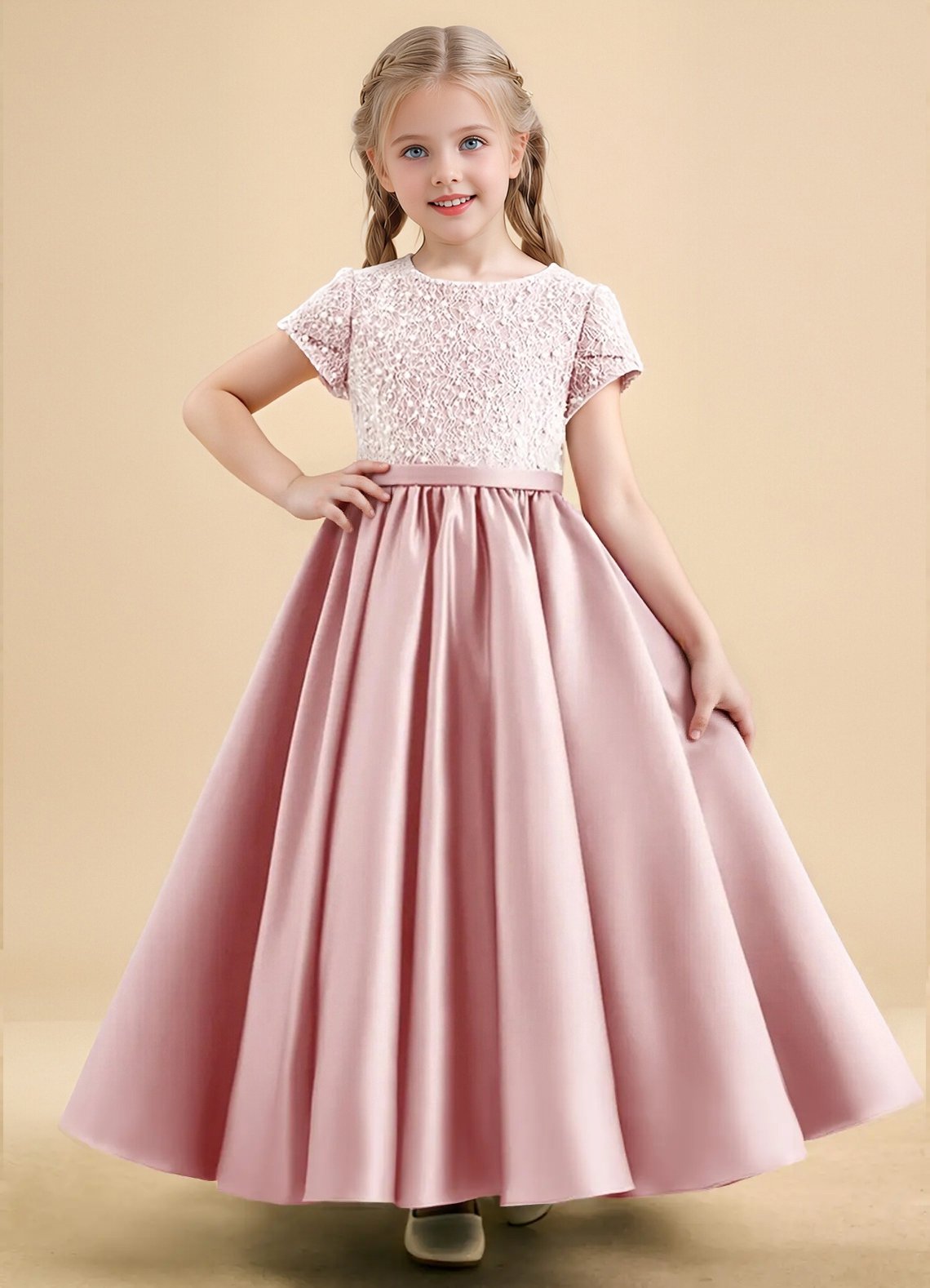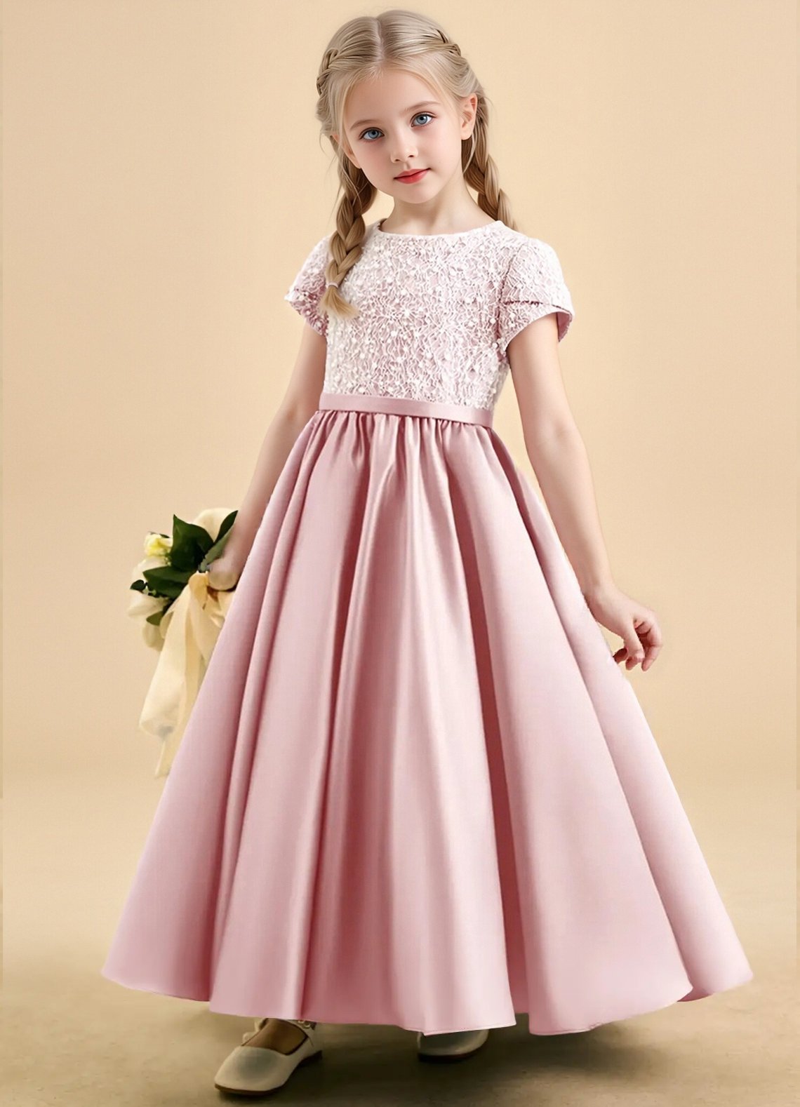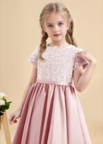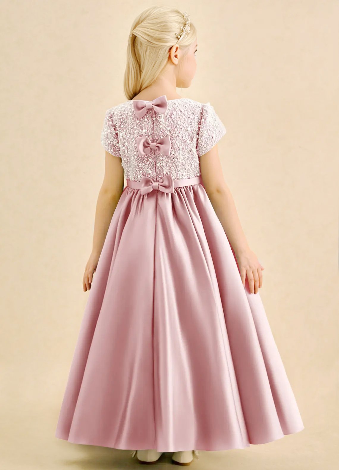 The Cashew flower girl dress is an ankle-length ball gown crafted from matte satin with a beautifully beaded bodice for a touch of sparkle. Featuring a scoop neckline, short sleeves, and three satin bows down the center back, the look is finished with a narrow sash and a pleated skirt for elegant volume.