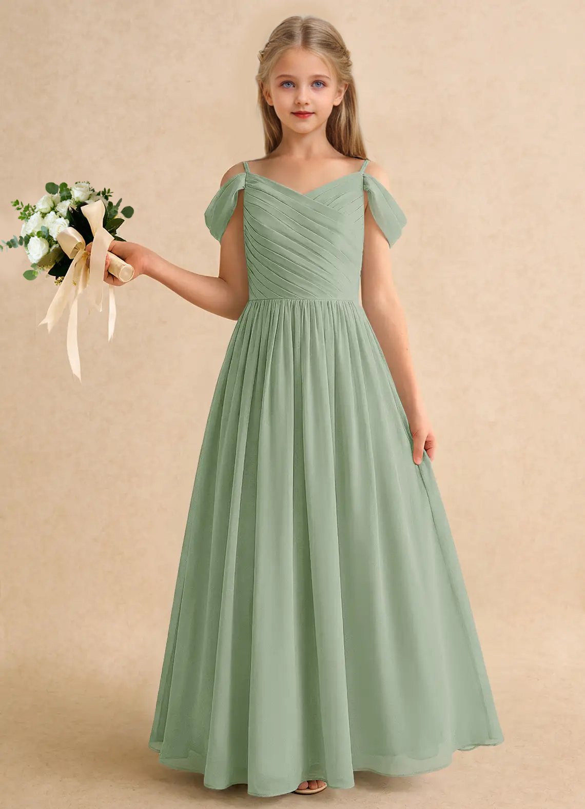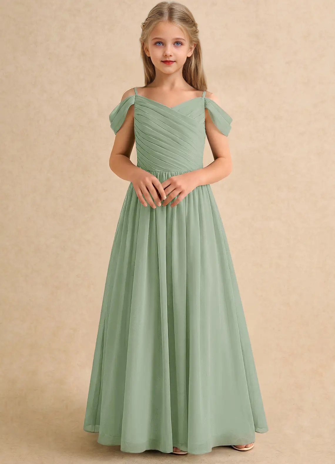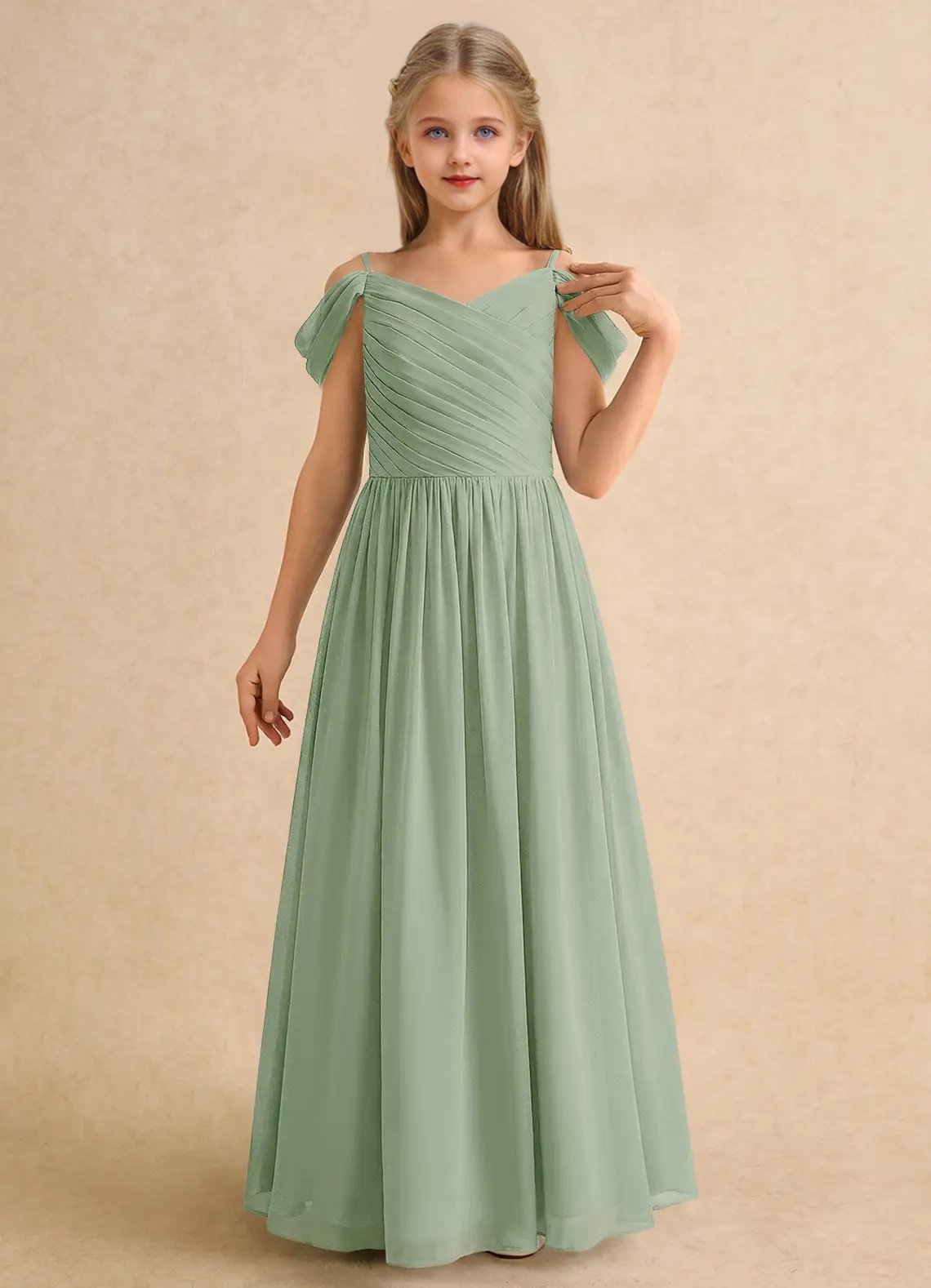 Chelo is our adorable chiffon A-line flower girl dress. She features a V-neckline that is fully hand-pleated and framed with off-shoulder sleeves. The gathered A-line skirt allows for playful twirling at any special occasion.