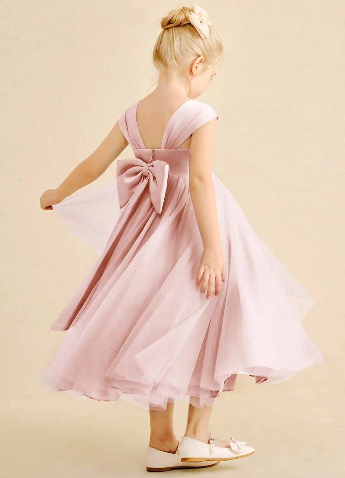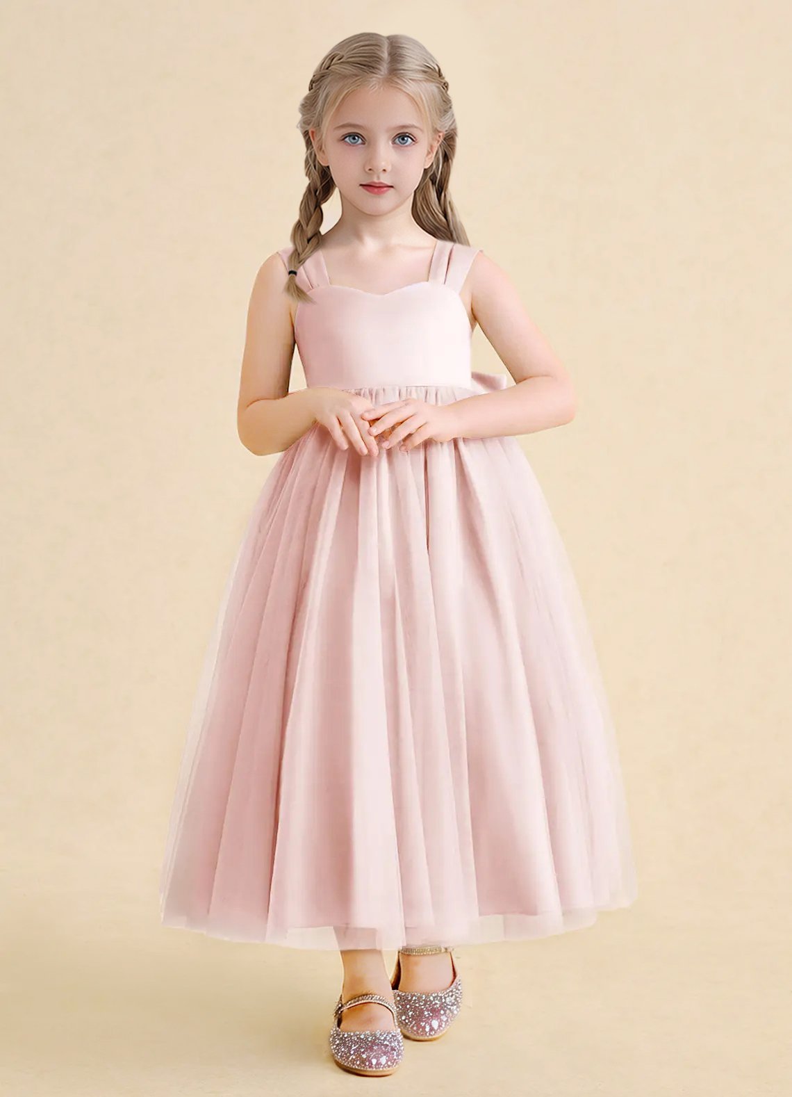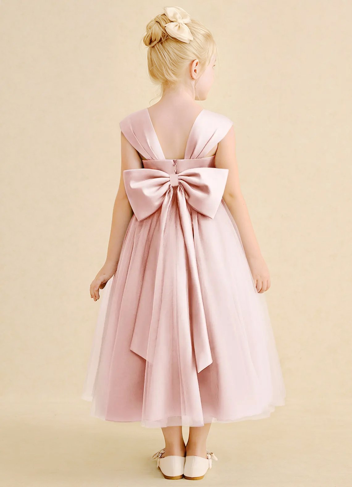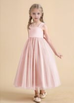 Chic and sweet, the Chickadee flower girl dress is crafted with a smooth matte satin bodice and a voluminous pleated tulle skirt that twirls with every step. Finished with a delicate sweetheart neckline, a V-back, and a large satin bow, this ankle-length ballgown is an enchanting choice for your celebration.