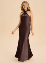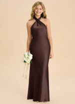 Sleek and modern, the Chickie junior bridesmaids dress is a floor-length column silhouette crafted from smooth stretch satin. Featuring a sleeveless crossover halter neckline that ties into a charming bow at the nape of the neck, it delivers polished elegance with a playful touch.