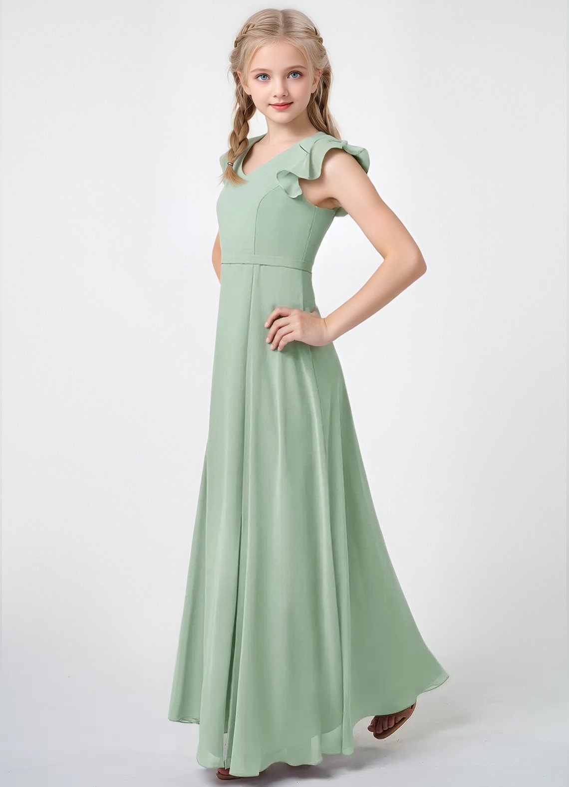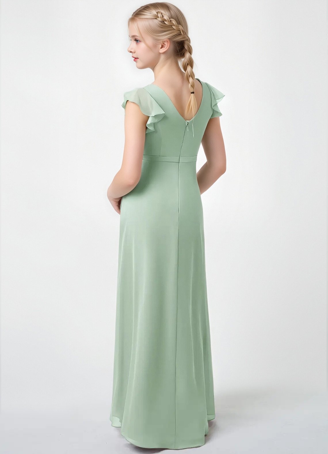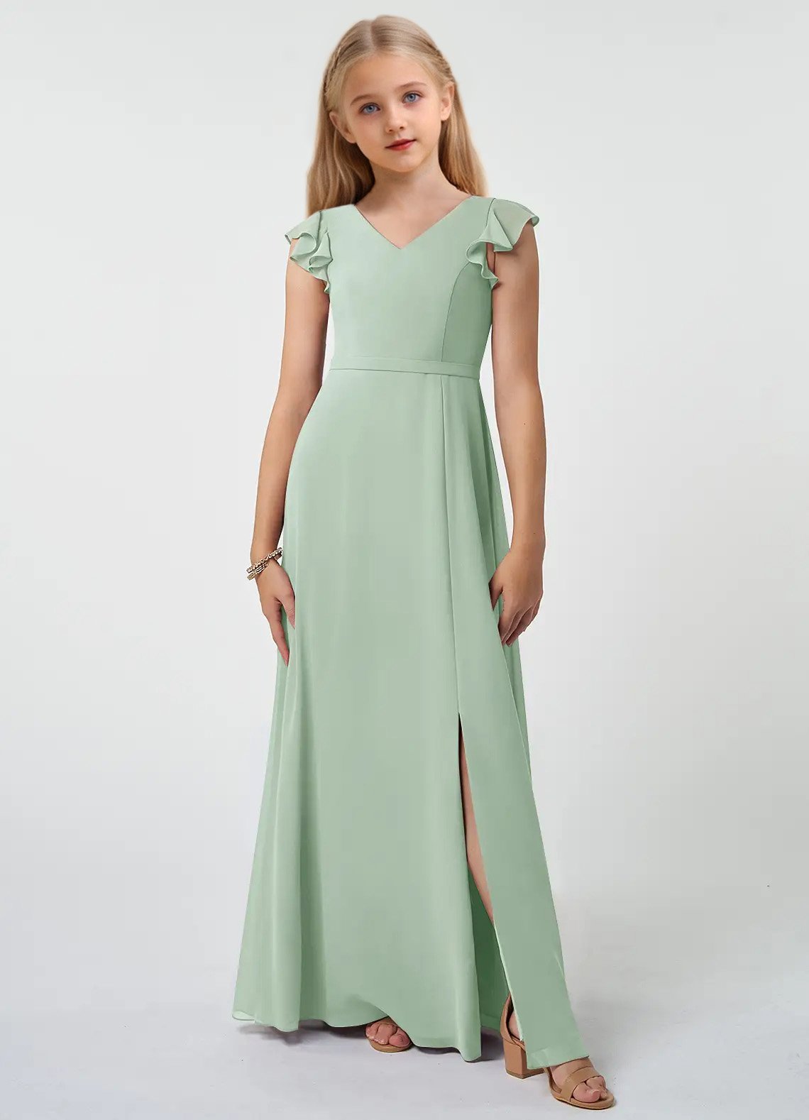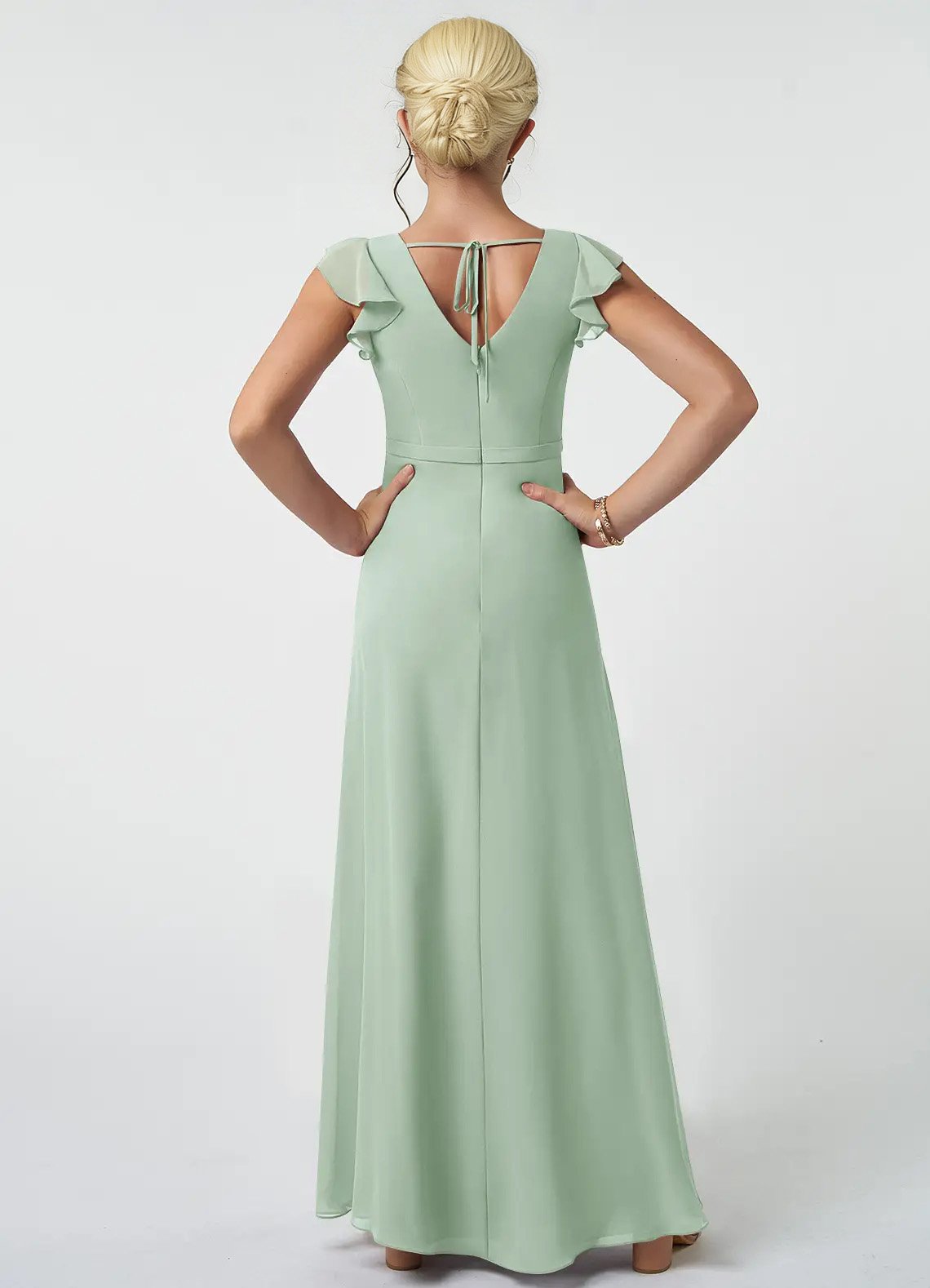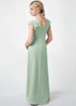 Claudine is a sweet, feminine choice for your junior bridesmaids. She has a V-neck bodice with cap flounce sleeves that highlight the silhouette, finished with a bow ties closure at the back. Made of flowing chiffon, she is cut in a floor length A-line silhouette with a leg slit that offers comfort for walking.