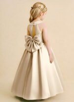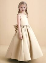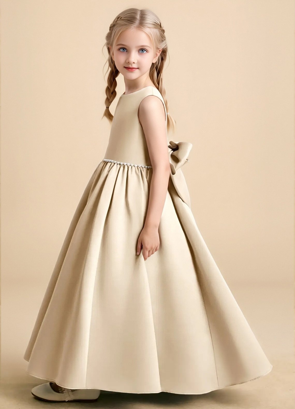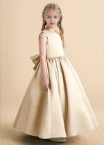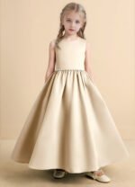 The Star dress is a timeless ankle-length ball gown crafted from matte satin, featuring a sleeveless scoop neckline and a sparkling beaded belt at the waist. A keyhole back with a double button closure and a statement bow add elegant charm, while the pleated full skirt brings extra volume for a picture-perfect flower girl look.