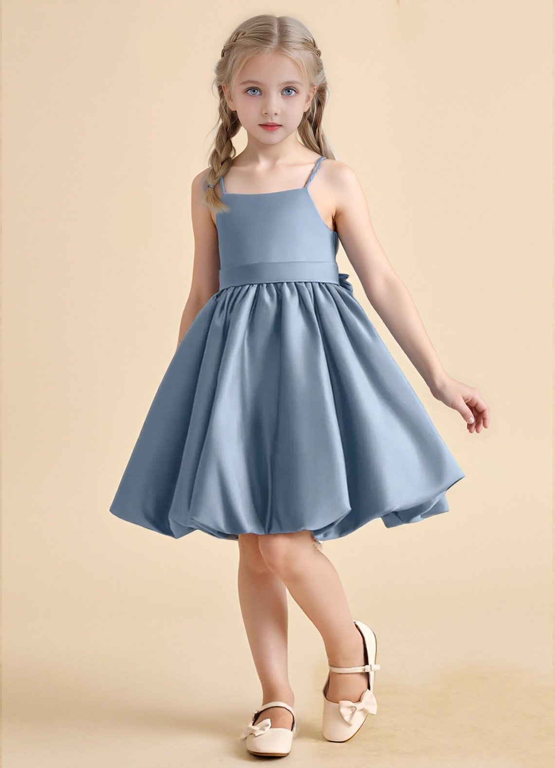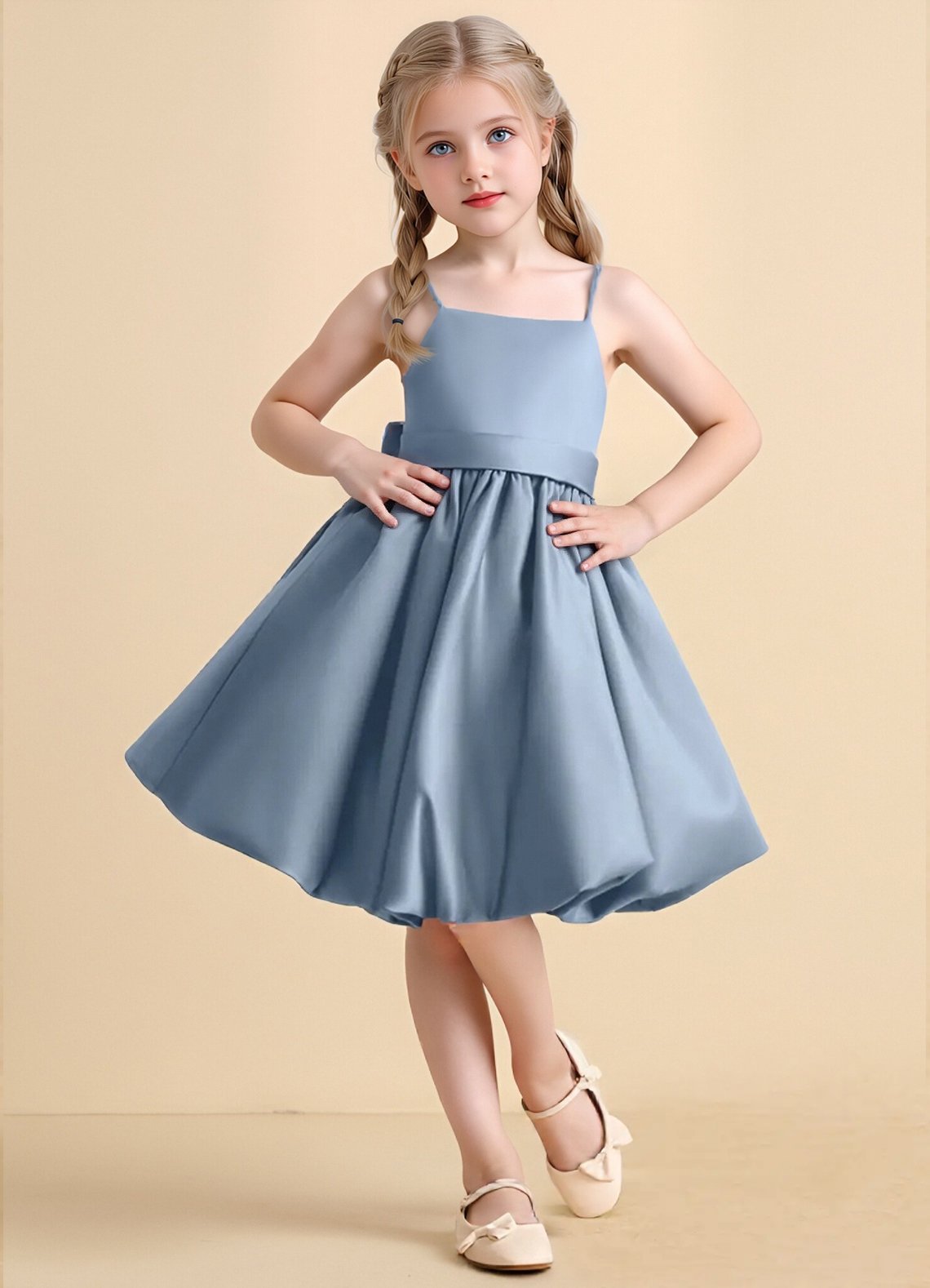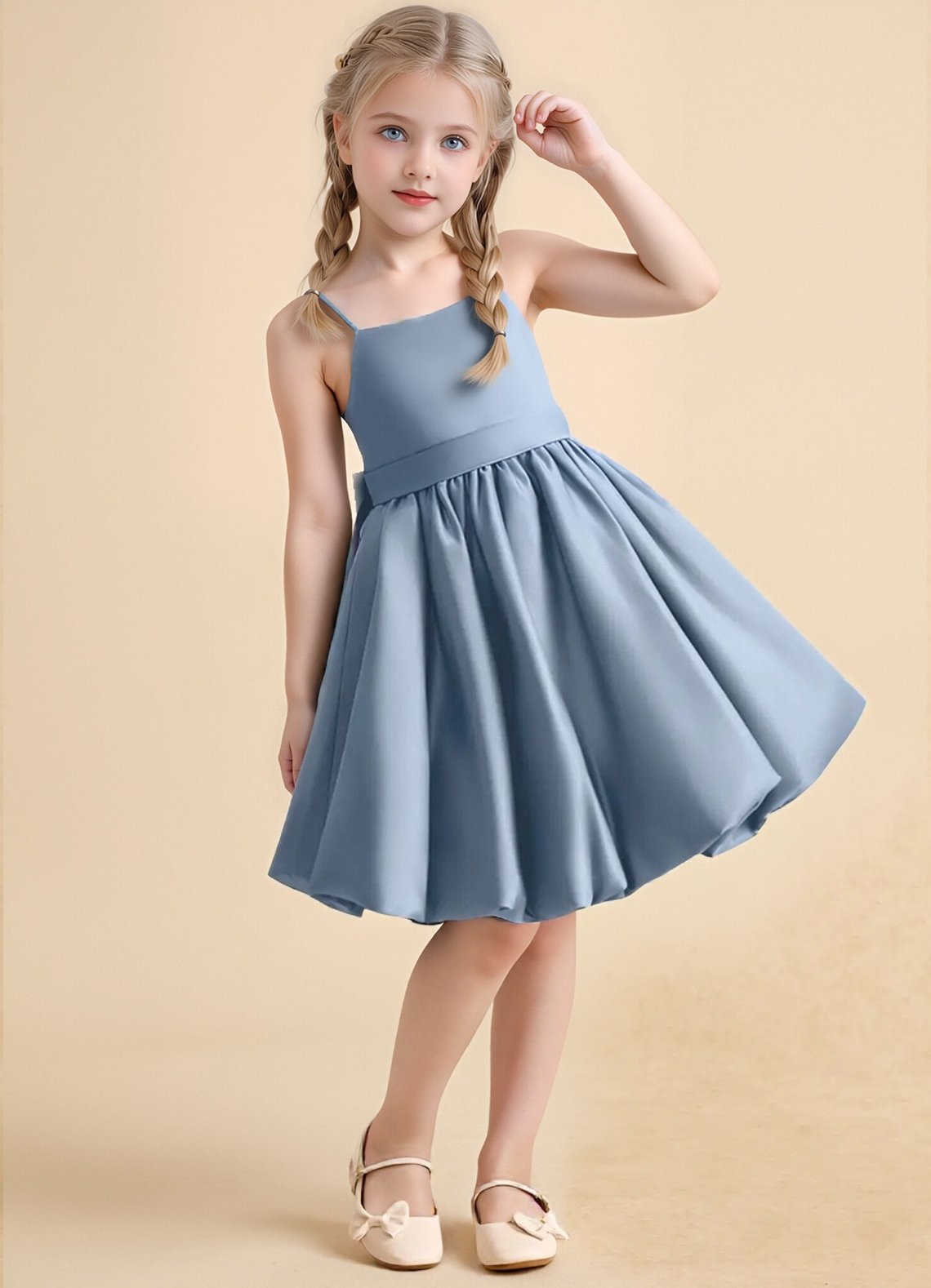 The Davine Dress is a stunning choice for your young fashionista. Made from matte satin, this knee-length A-line dress boasts a timeless square neckline and spaghetti straps for an effortlessly chic look. The highlight of the design is its permanent belt, which ties into a large bow at the back, adding a touch of whimsy and sophistication to the overall silhouette. Perfect for weddings, parties, or any special event.