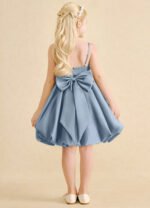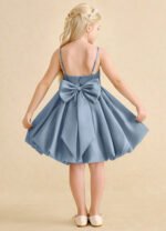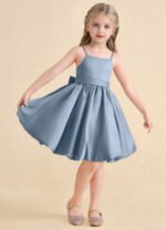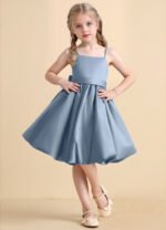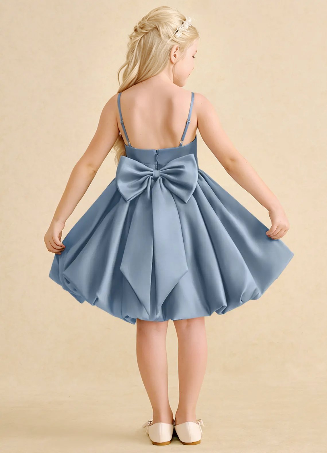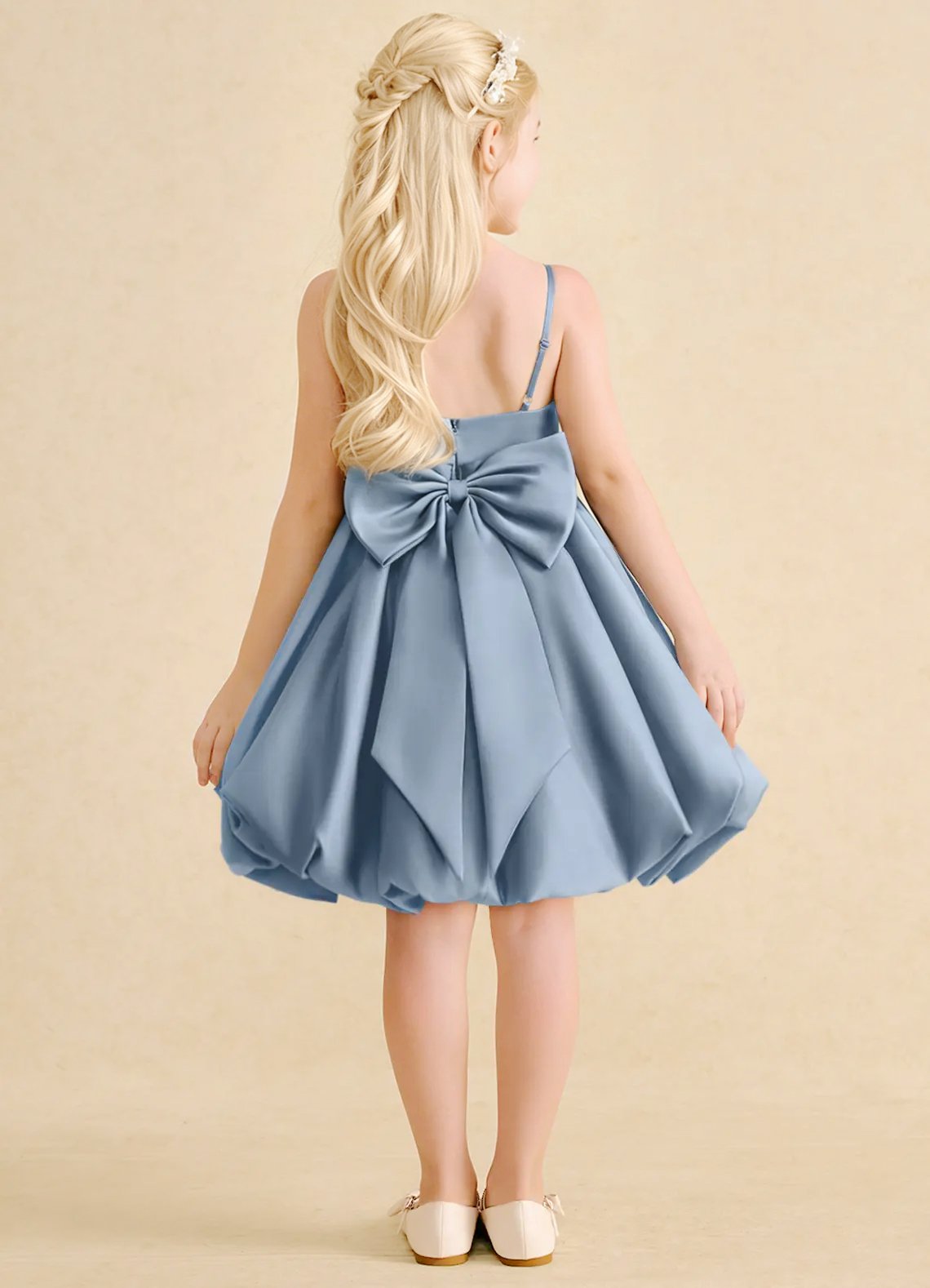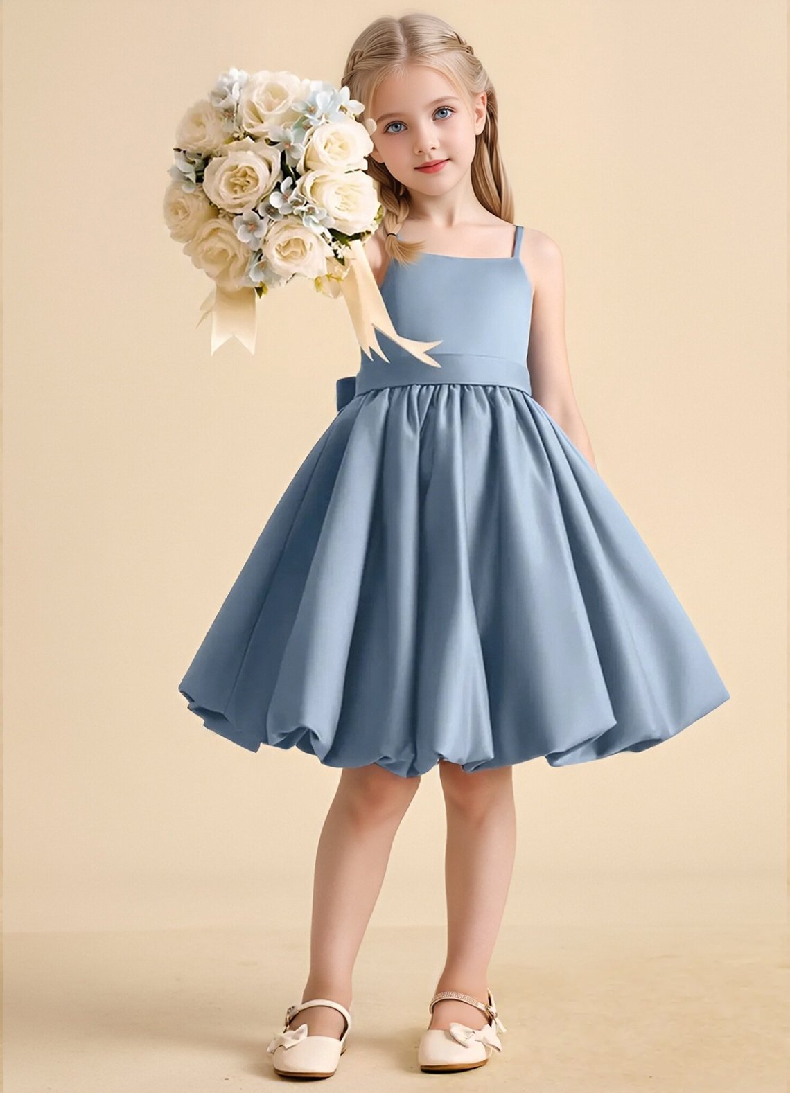 The Davine Dress is a stunning choice for your young fashionista. Made from matte satin, this knee-length A-line dress boasts a timeless square neckline and spaghetti straps for an effortlessly chic look. The highlight of the design is its permanent belt, which ties into a large bow at the back, adding a touch of whimsy and sophistication to the overall silhouette. Perfect for weddings, parties, or any special event.