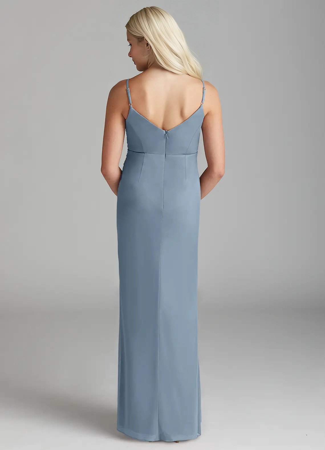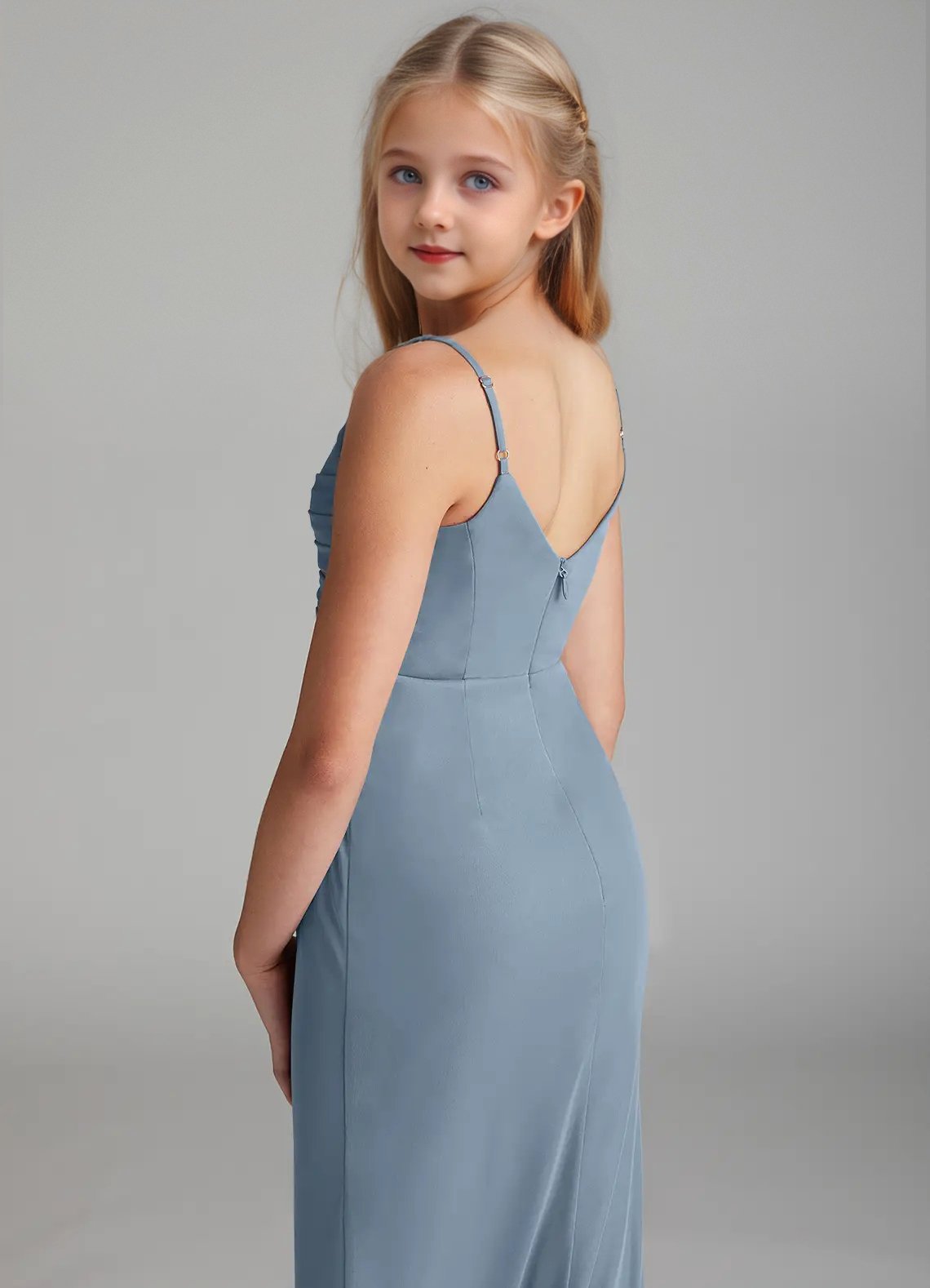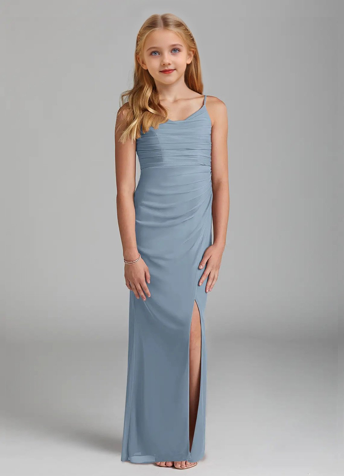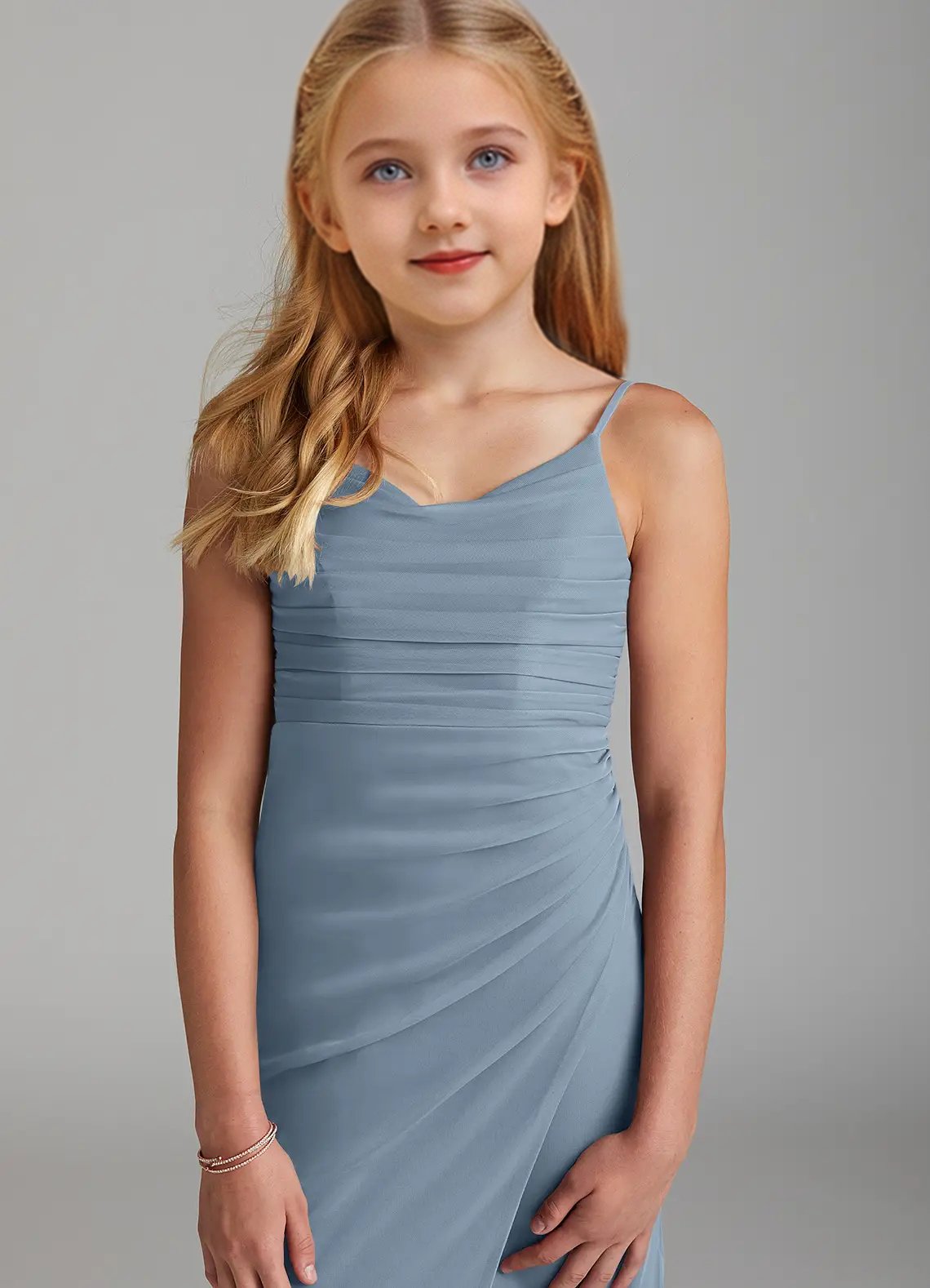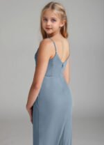 Deandra is a stunning junior bridesmaid dress cut from mesh. She features a front cowl neck and a V-back with adjustable spaghetti straps. The pleated mermaid skirt comes with a leg slit and back darts for a perfect fit.