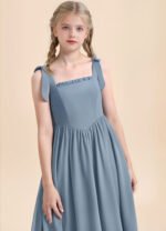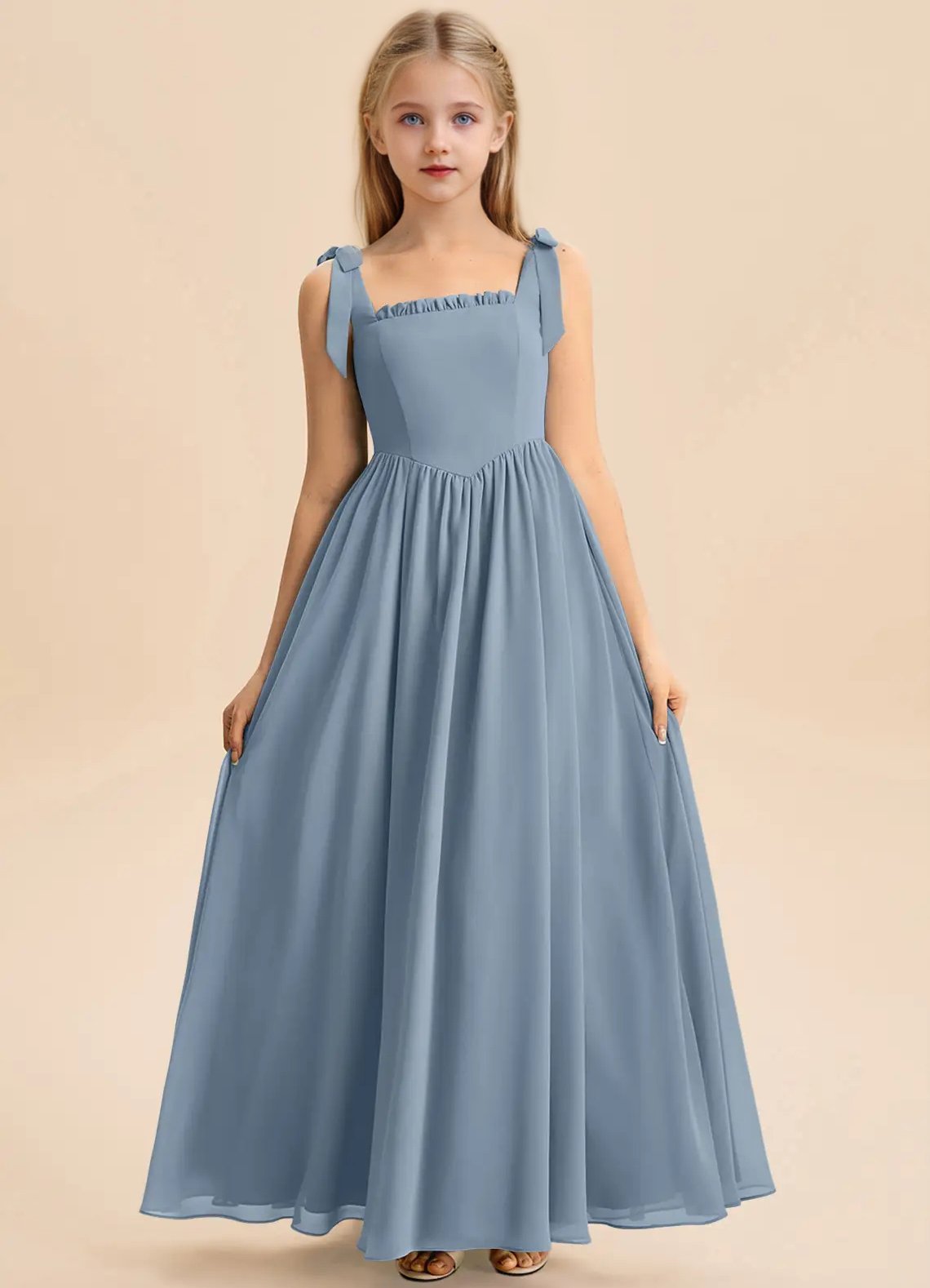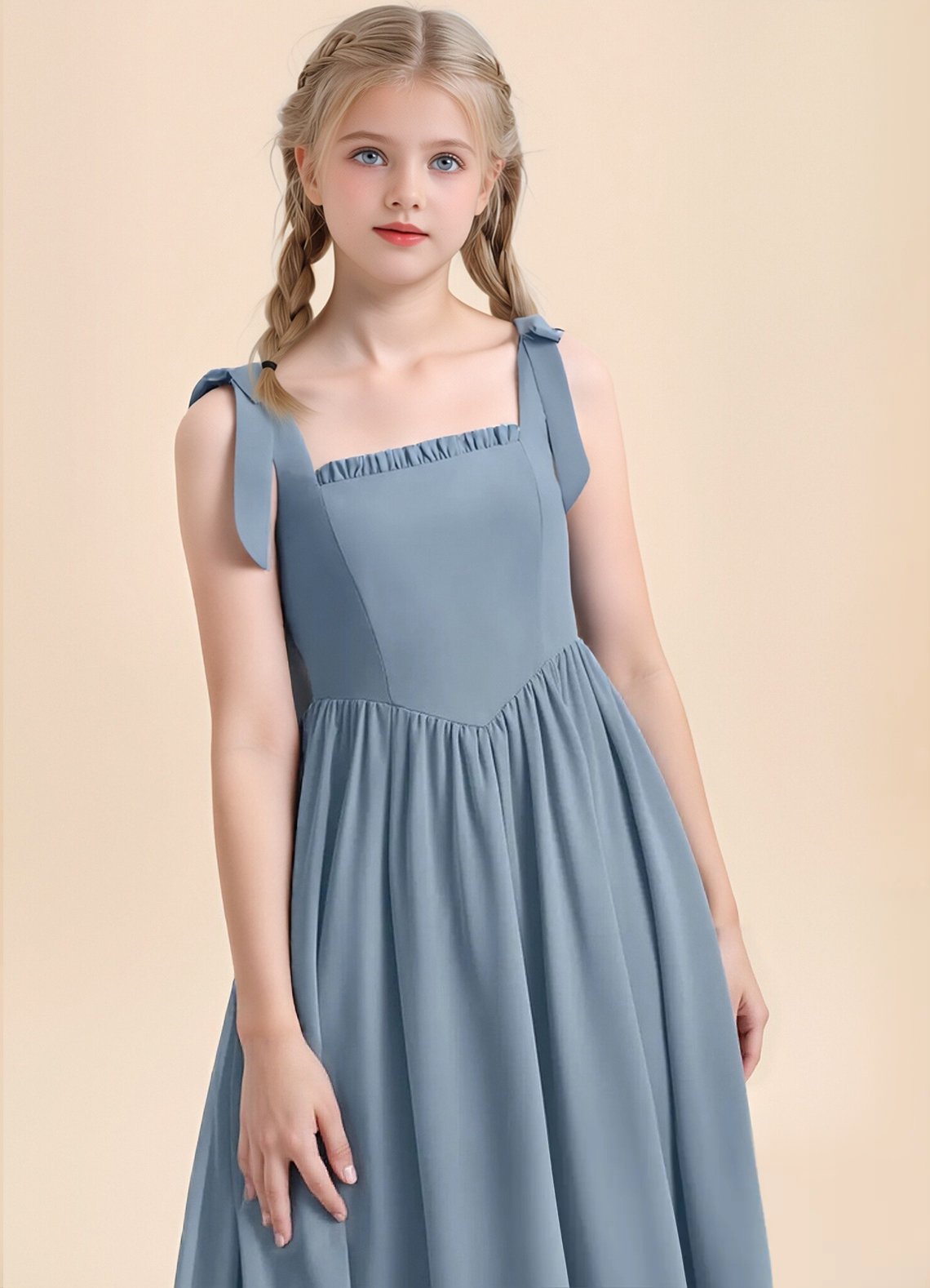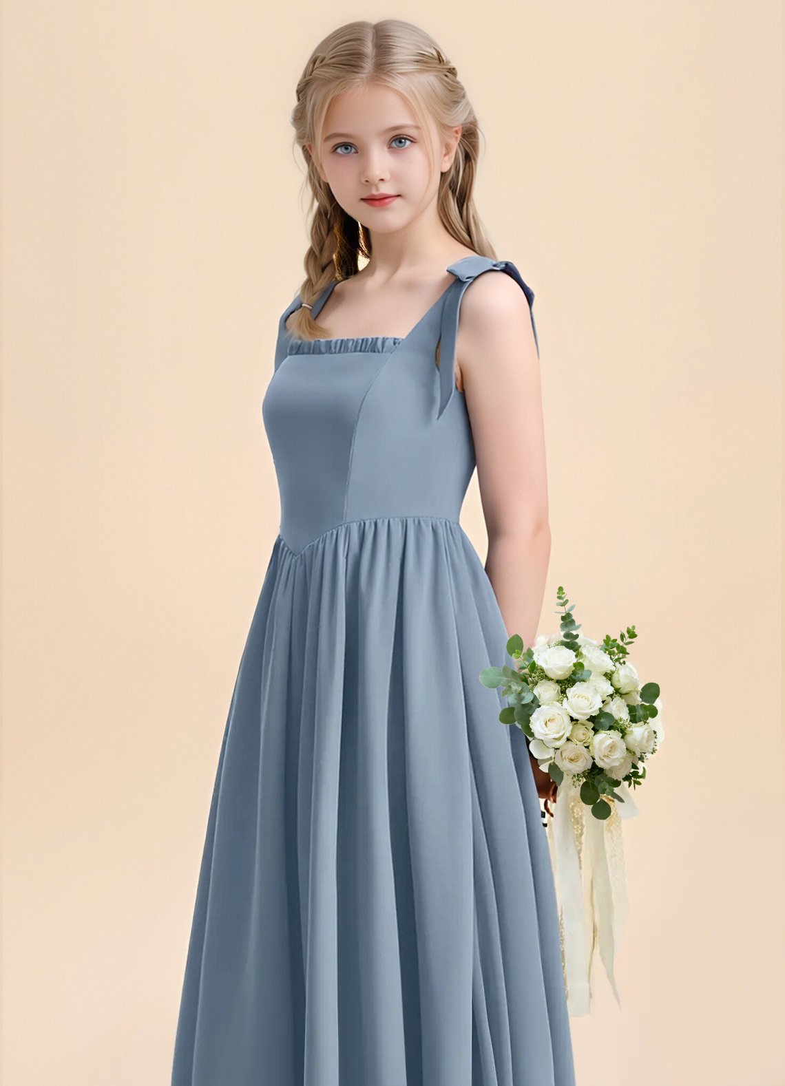 The Delia Junior bridesmaid dress blends classic sophistication with contemporary style, offering a sleeveless A-line design with charming bow straps, a straight neckline, for both comfort and elegance.