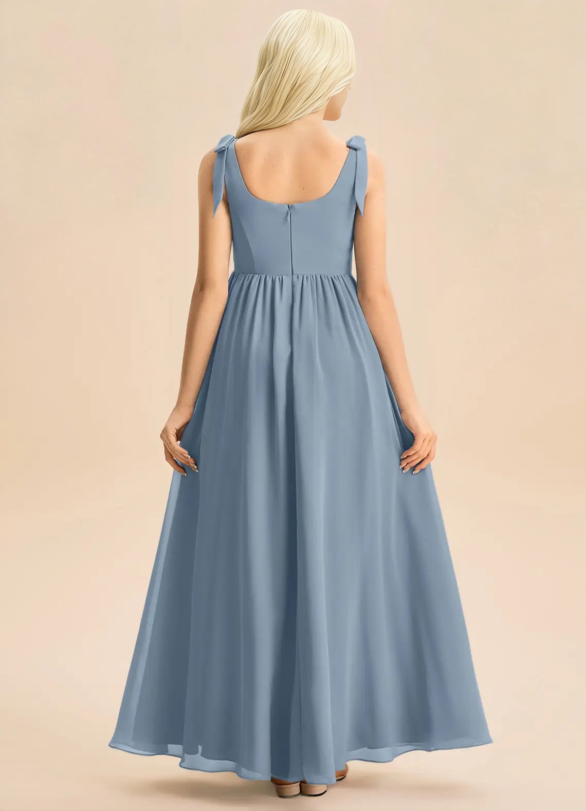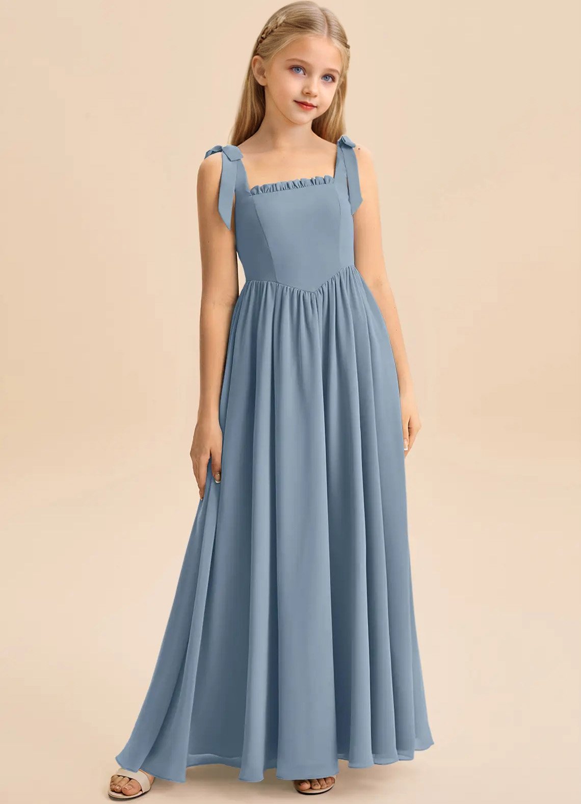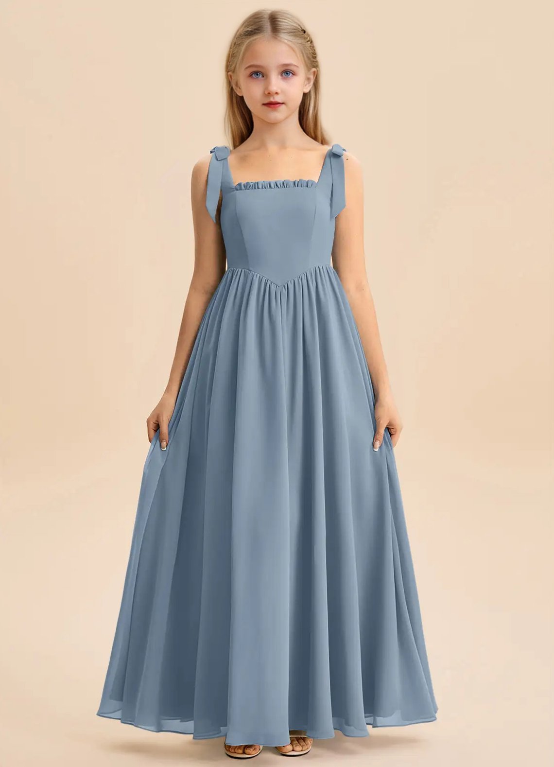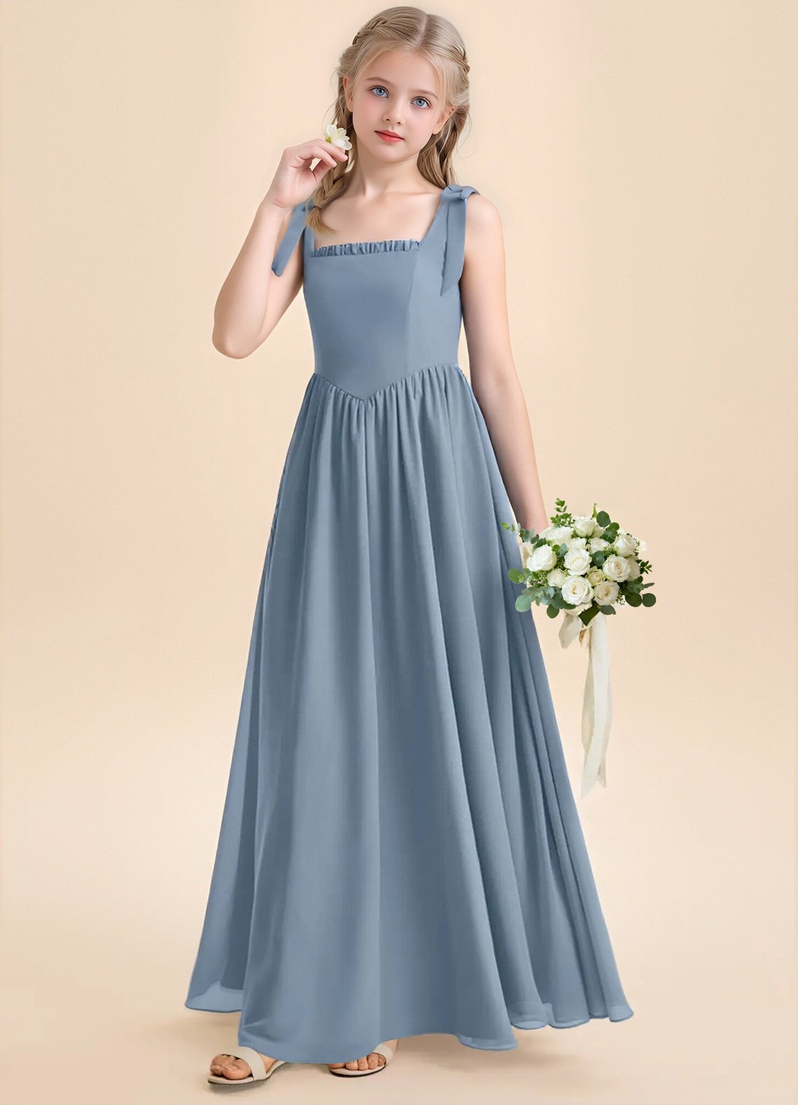 The Delia Junior bridesmaid dress blends classic sophistication with contemporary style, offering a sleeveless A-line design with charming bow straps, a straight neckline, for both comfort and elegance.