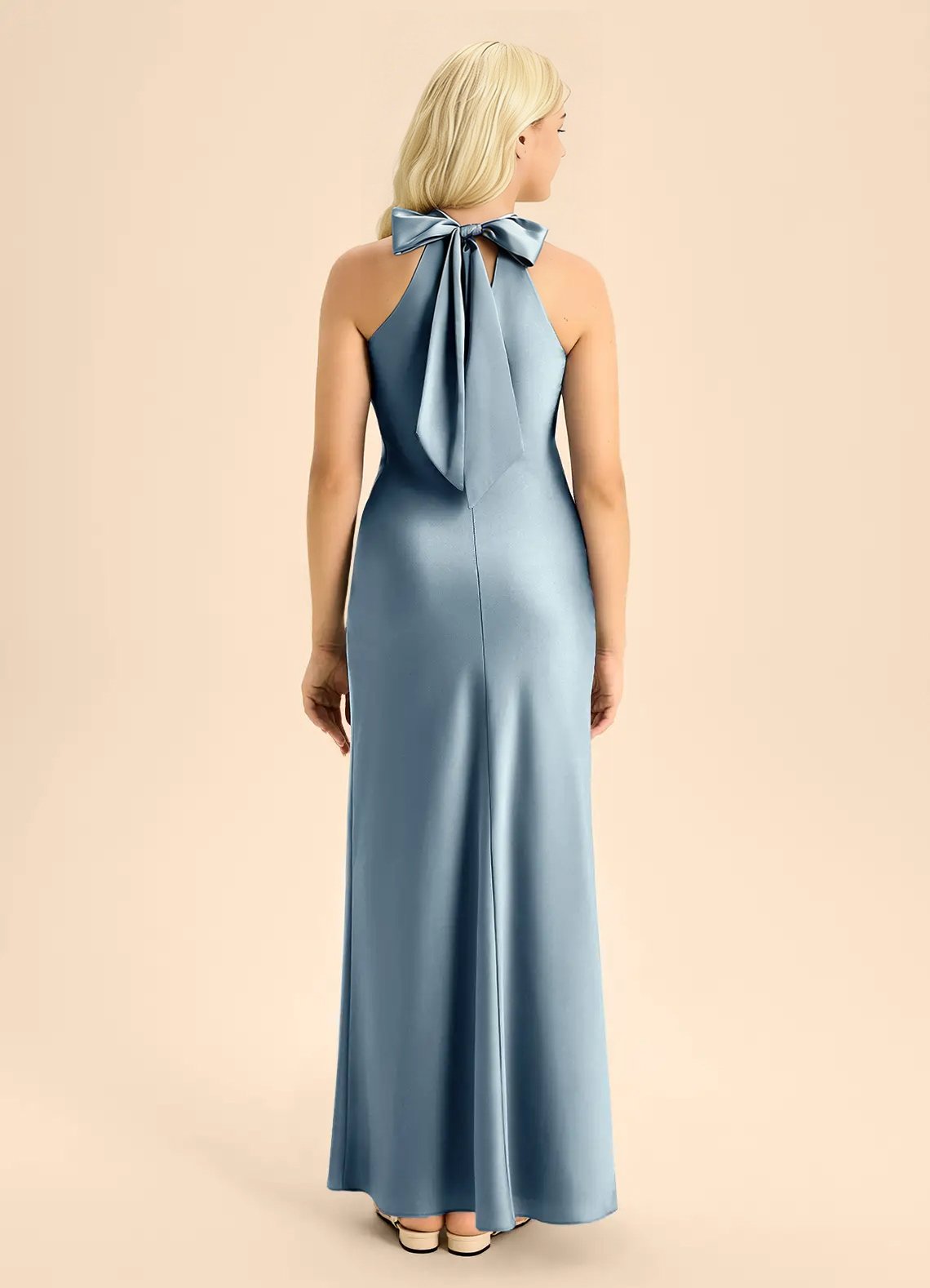 Doretta is a lovely stretch satin gown with a softly flared skirt that flows beautifully with every step. A charming halter neckline ties into a sweet bow at the back, with a cute keyhole detail adding just the right touch of whimsy.