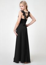 Coordinate your junior bridesmaids in complementing styles by dressing your ladies in Emily. This dress is the sister to our best seller Everett. Emily provides plenty of coverage in the front, and cascading ruffle straps add coverage to the back. She features a surplice V-neckline with bodice pleating and a belted bow tie sash in the back. Her floor length A-line skirt also comes with a low leg slit.