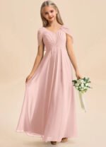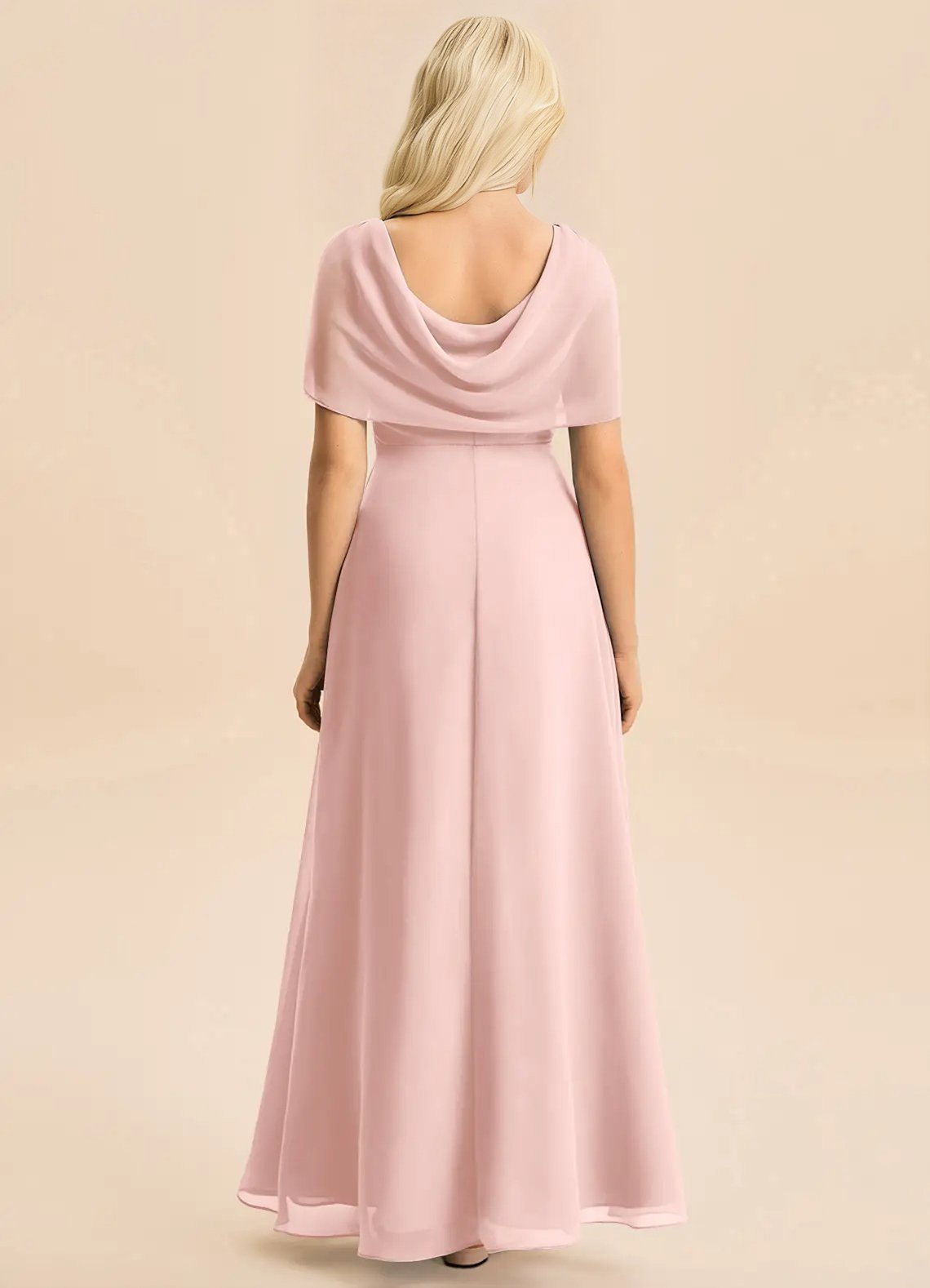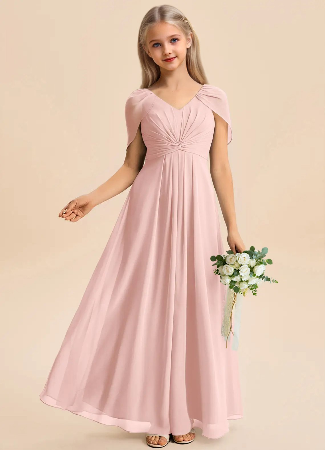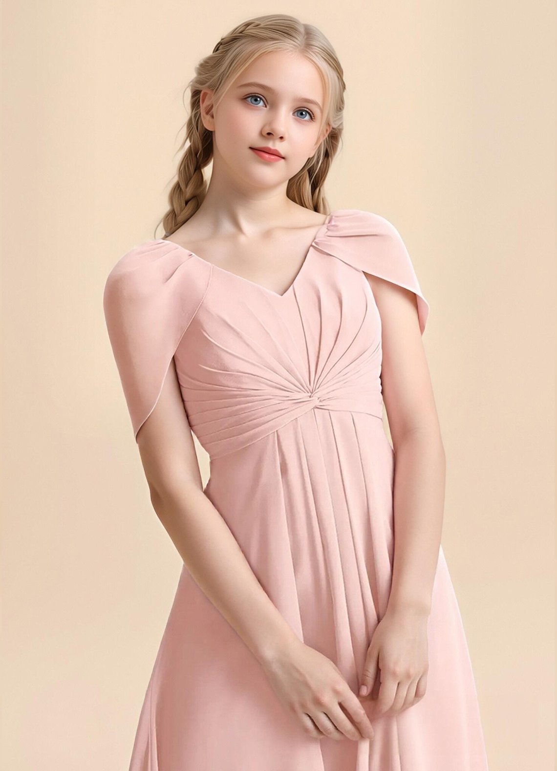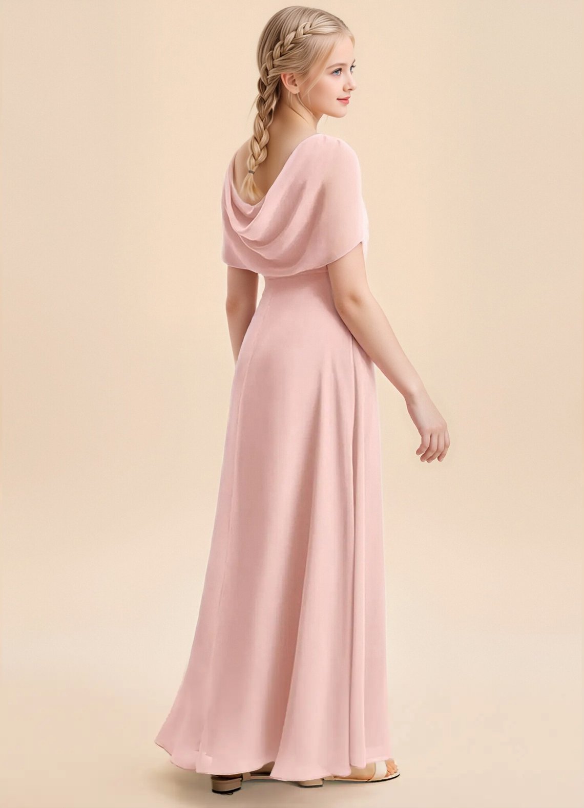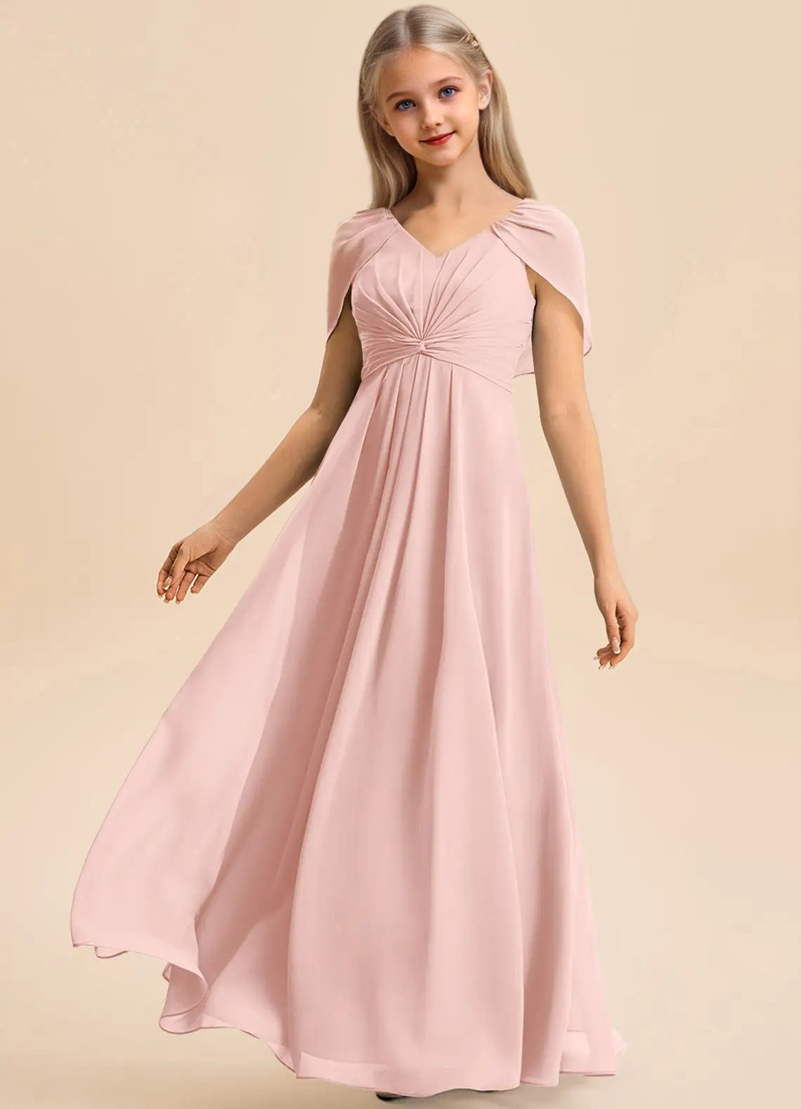 The Emma junior bridesmaid dress is a floor-length A-line gown in flowing chiffon, featuring a V-neckline and a pleated bodice with a knotted waist detail. A draped cowl cape is permanently attached atthe shoulders for an elegant, ethereal look, while a pleated skirt moves gracefully with every step.