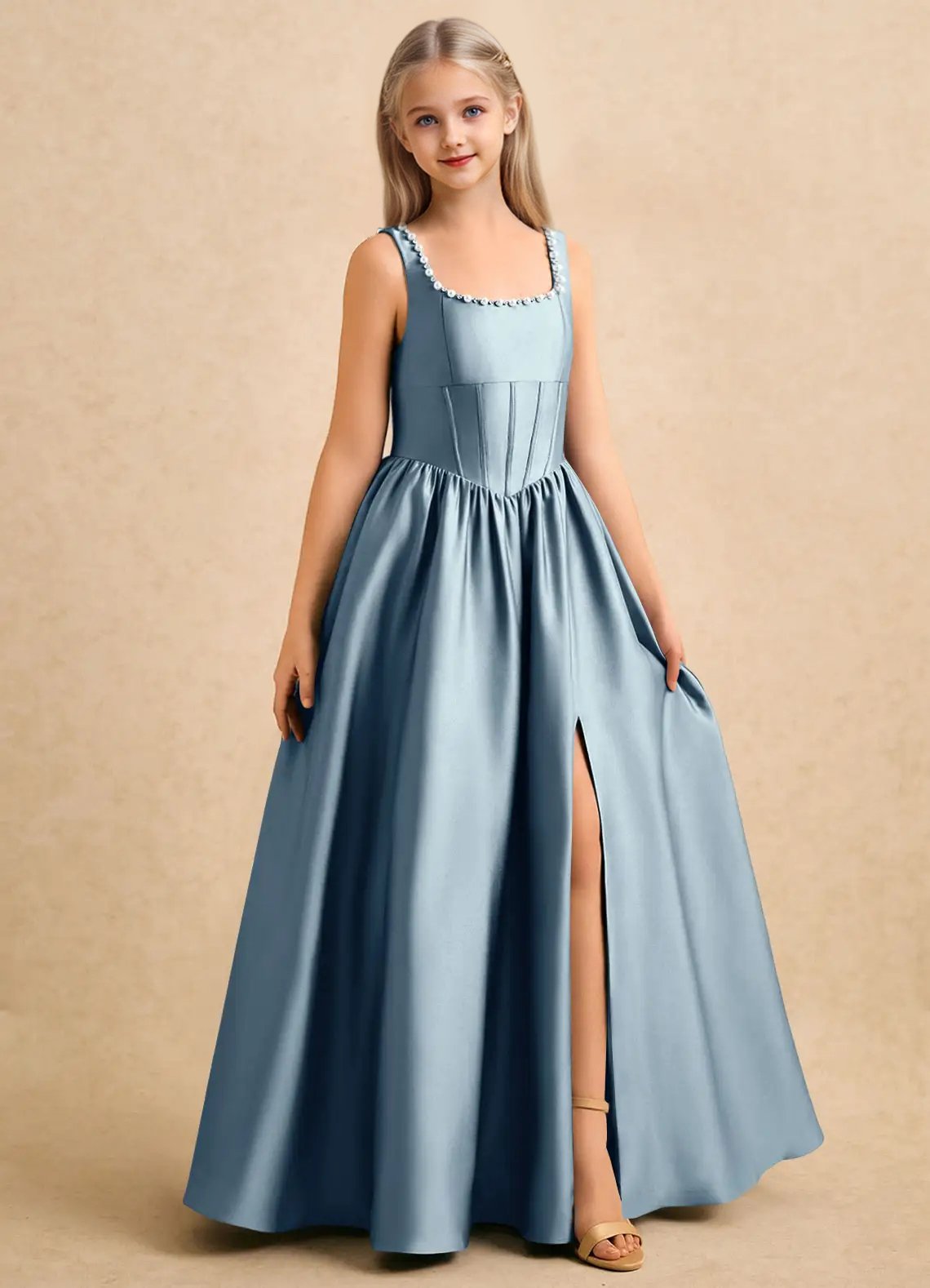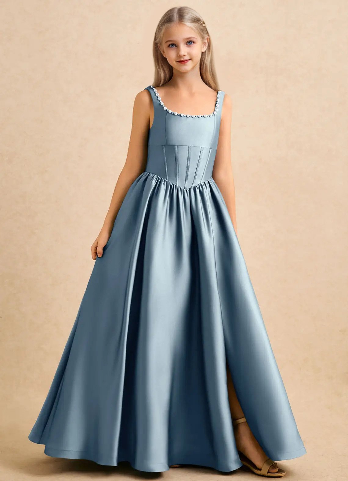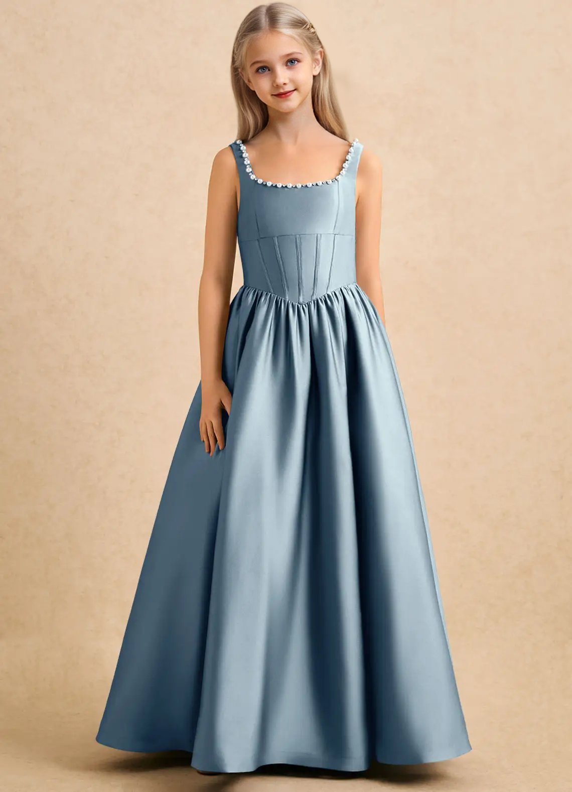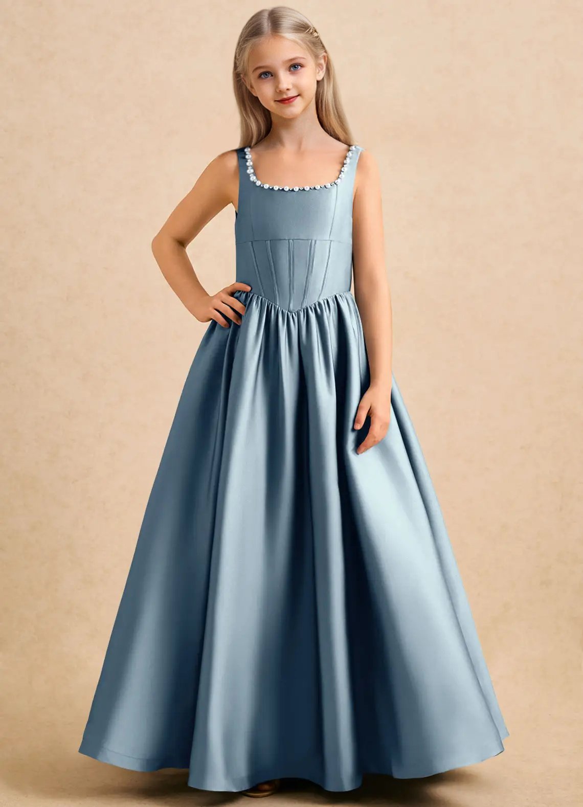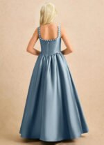 The floor-length Enid girls’ formal dress features a graceful ball gown silhouette in lustrous stretch satin with a structured, voluminous drape. It has a square neckline with delicate pearl trim along the straps and back neckline, paired with a fitted corset bodice that defines the waist. The skirt is finished with a full, gathered A-line flair for timeless movement and elegant charm.