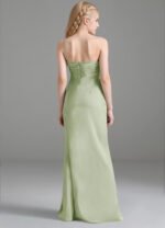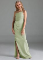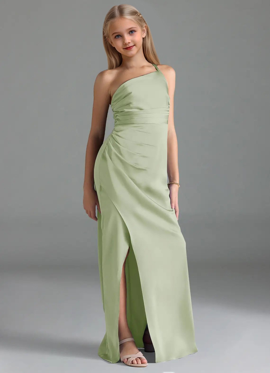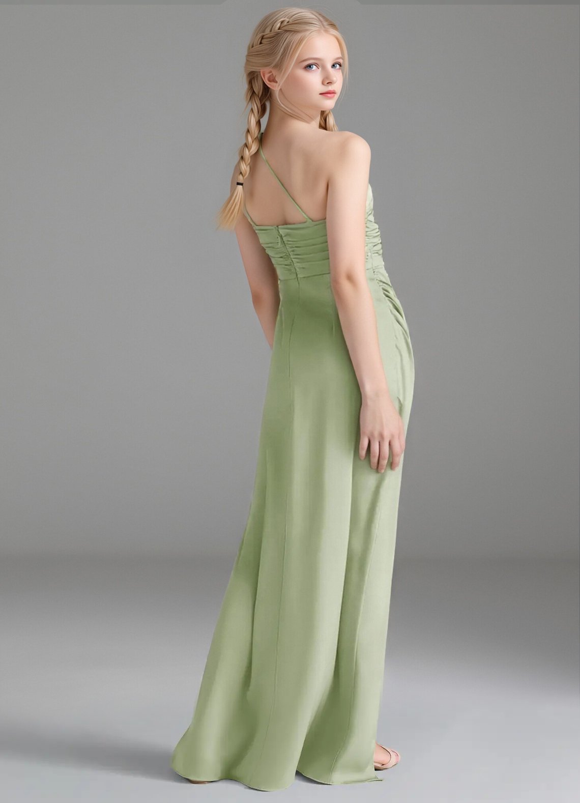 Stun the party in our luxe stretch satin gown, Eren Junior. Featuring an asymmetrical neckline, this dress is a one shoulder with a double strap detail. Pleating begins at the bodice and runs down onto the sheath skirt silhouette. Her draped pleated skirt overlaps and creates a dramatic leg slit when walking.